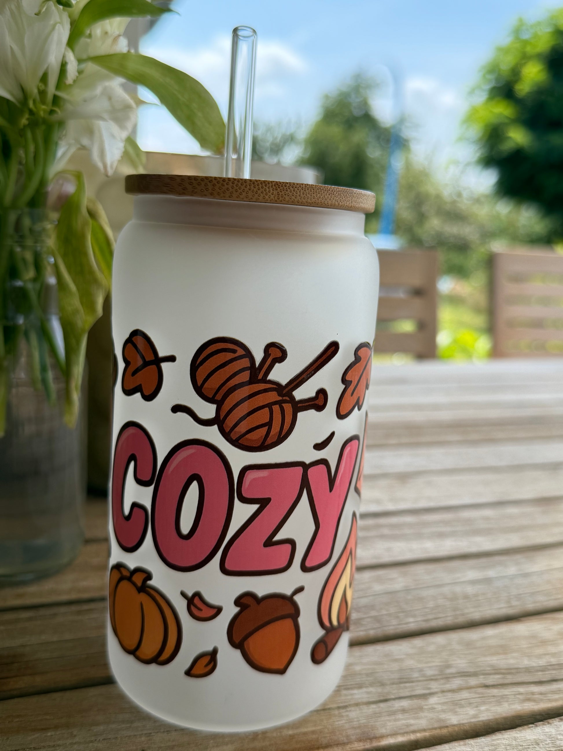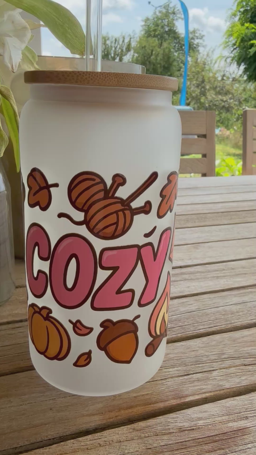 Auf dem matten, frostigen Glas tummeln sich sĂźĂe KĂźrbisse, Eicheln, bunte Blätter, Wolle, Stricknadeln und ein Lagerfeuer â alles, was das Herz an kĂźhlen Tagen wärmt. Das Wort âCOZYâ steht dabei ganz klar im Mittelpunkt â groĂ, pink und herzlich.