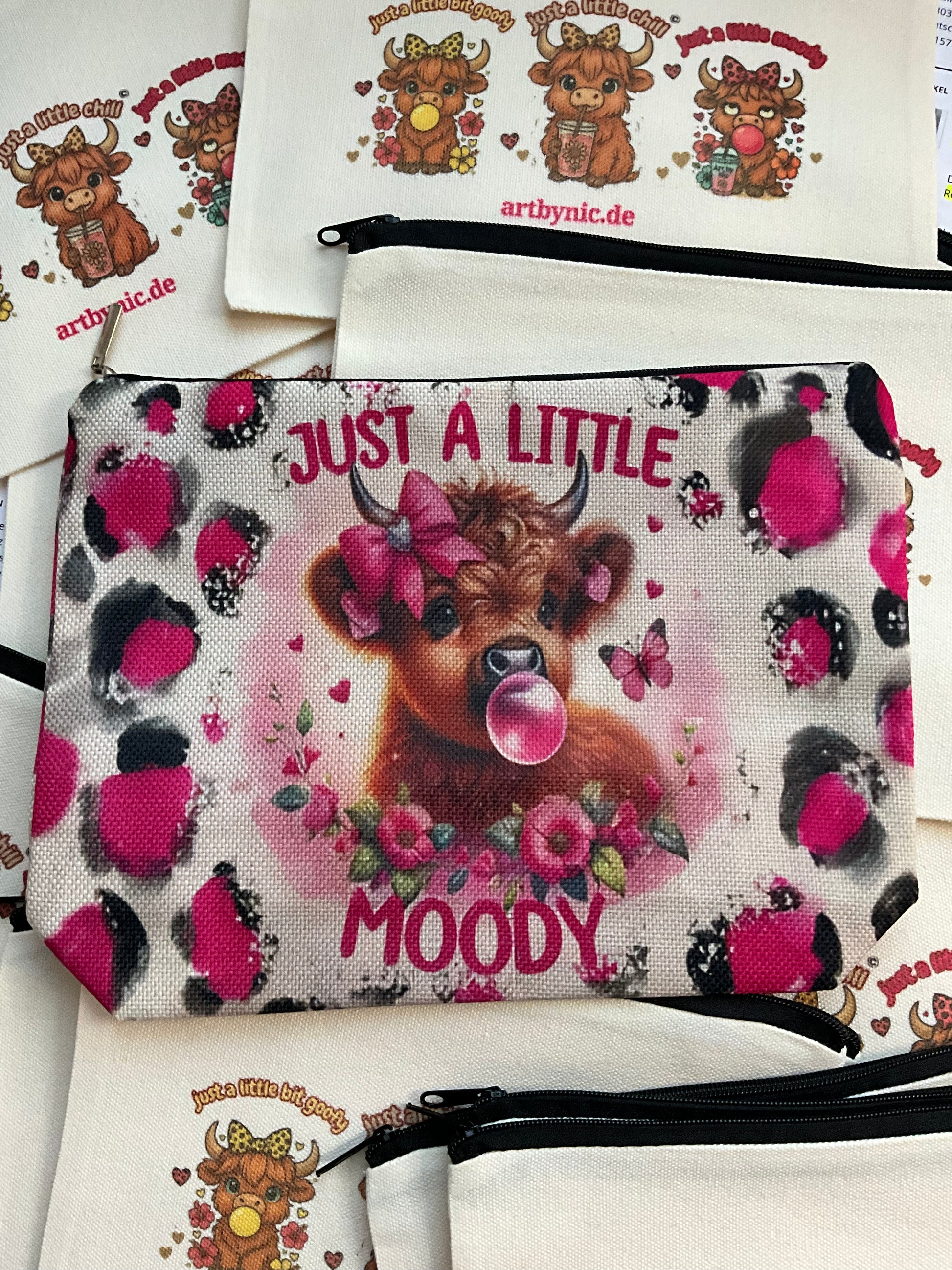Die süße Kosmetiktasche ist rundum bedruckt mit dem frechen Motiv „Just a little moody“ – eine zuckersüße Highland-Kuh mit Bubblegum, Blumen und Schmetterlingen. 🐮🌸🦋