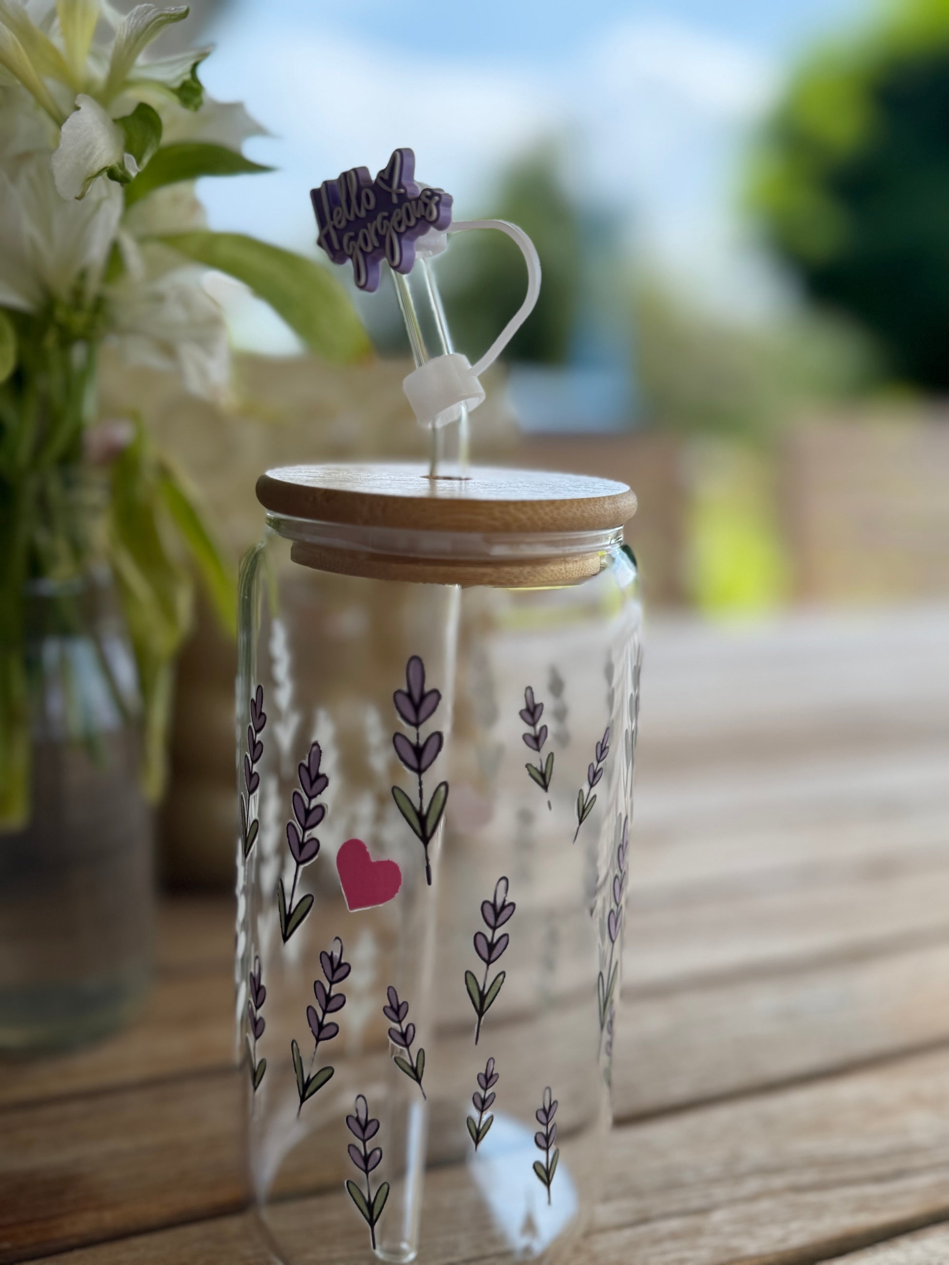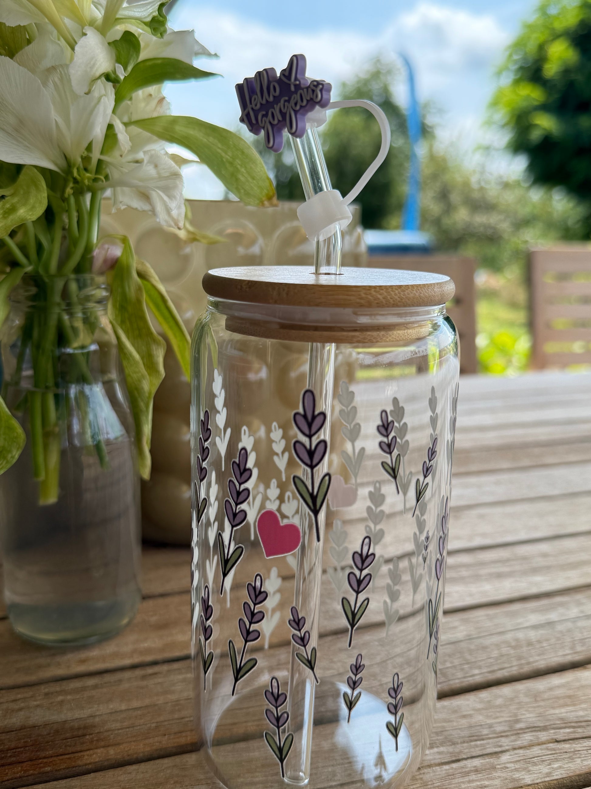 Feine Lavendelzweige in verschiedenen Größen umspielen das Glas, durchbrochen von einem kleinen, pinken Herz – ein sanfter Blickfang mit Gefühl.