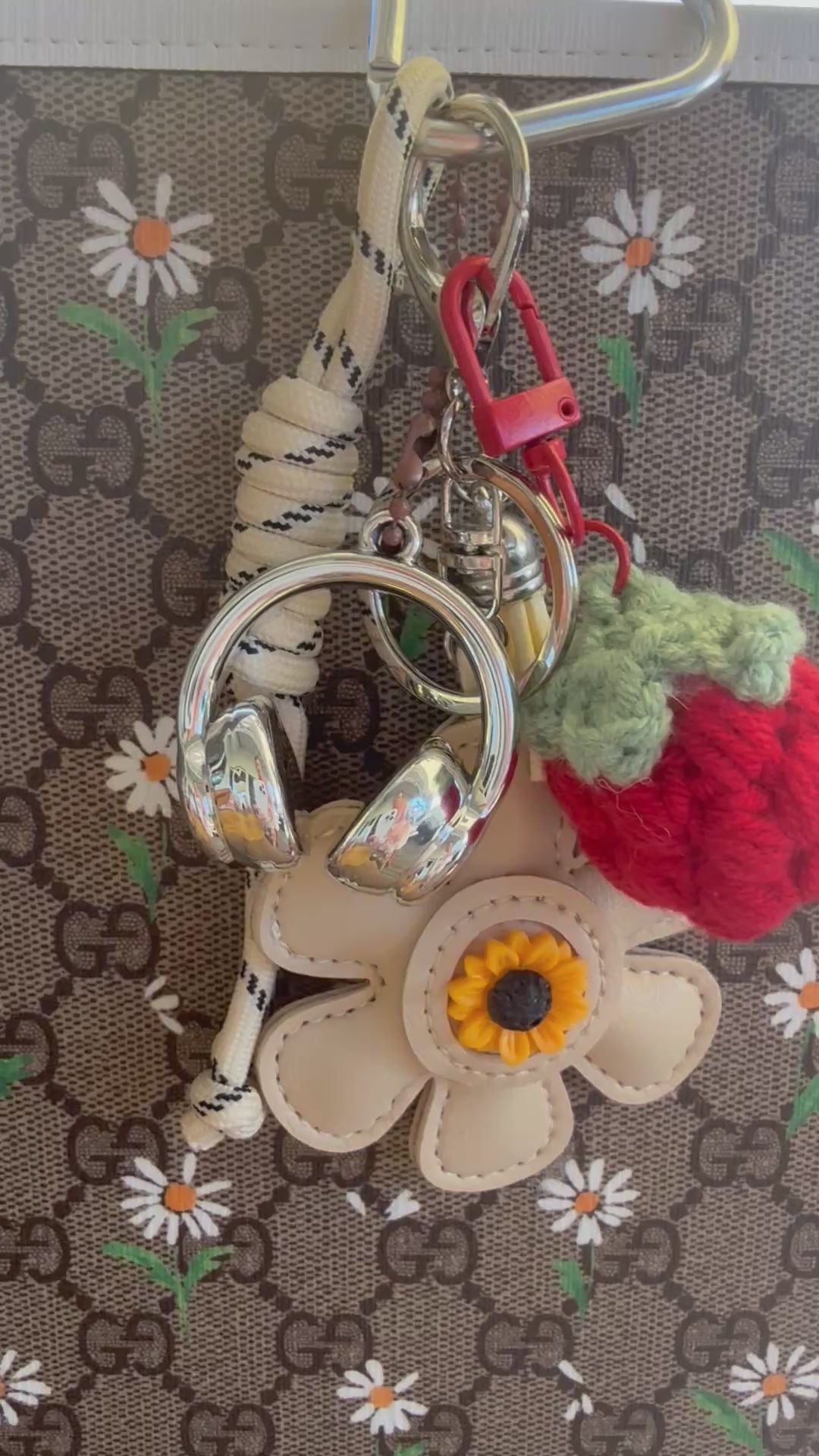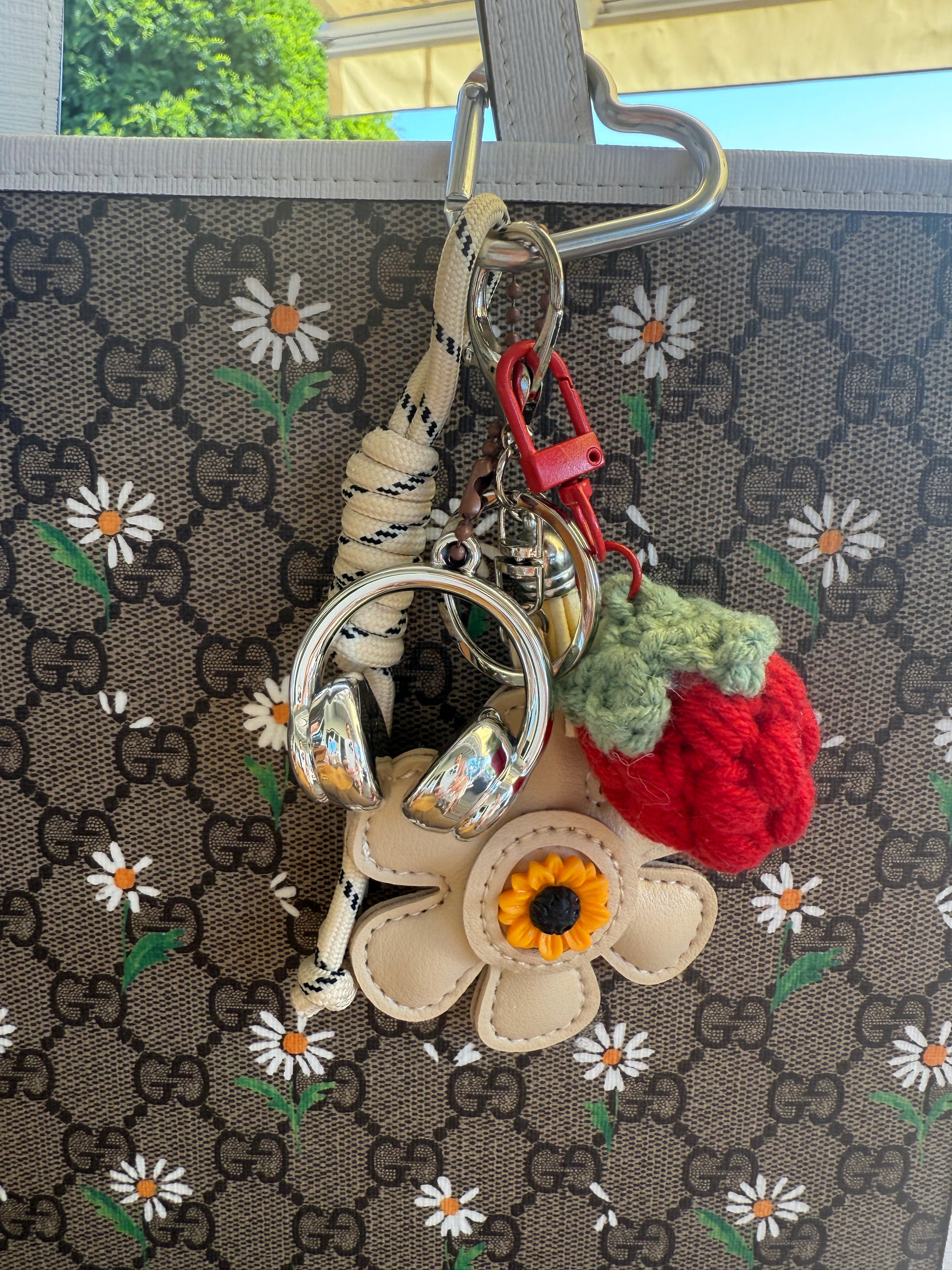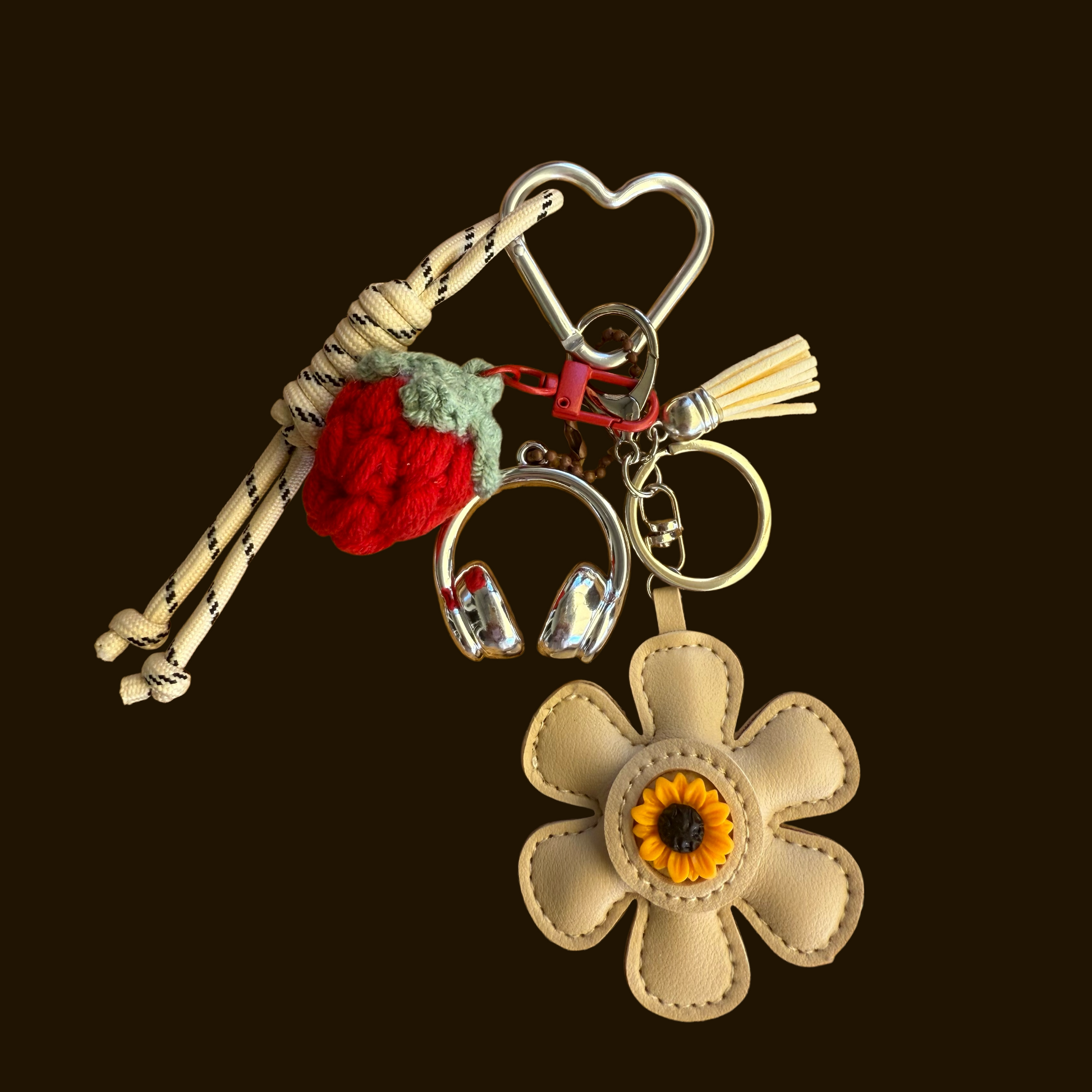 Die süße Erdbeere bringt Sommergefühle, die große Sonnenblume erinnert an 70s-Vibes, und der kleine Kopfhörer ist der perfekte Sidekick für Musikfans mit Humor. Geknotetes Seilband, glänzende Details und ein Karabiner in Herzform machen dieses Accessoire zum Allround-Favoriten für Taschen, Schlüssel oder Rucksäcke.