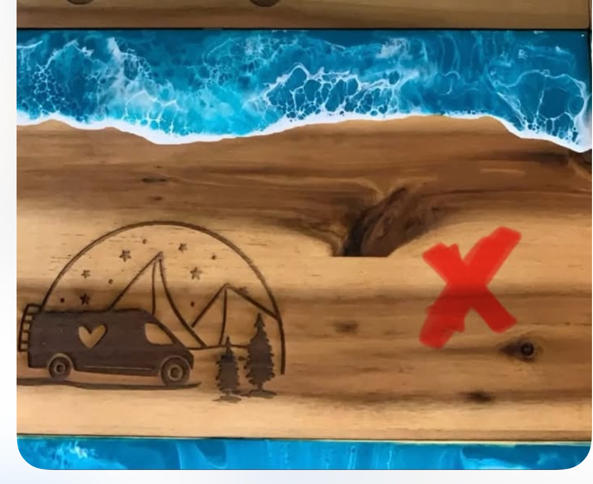Die eingearbeitete Lasergravur zeigt einen charmanten Camper-Van – bereit für das nächste Abenteuer am Meer.
