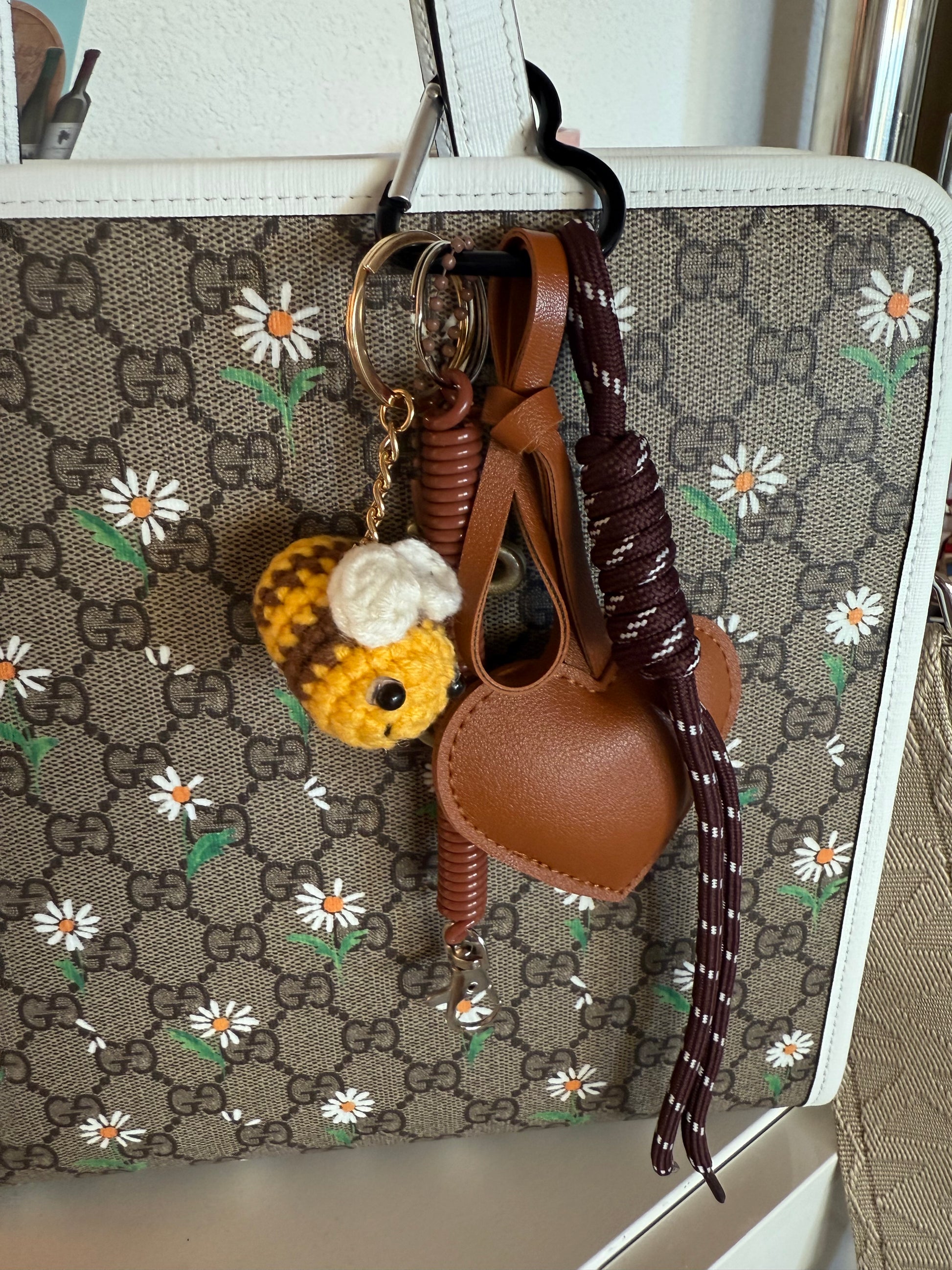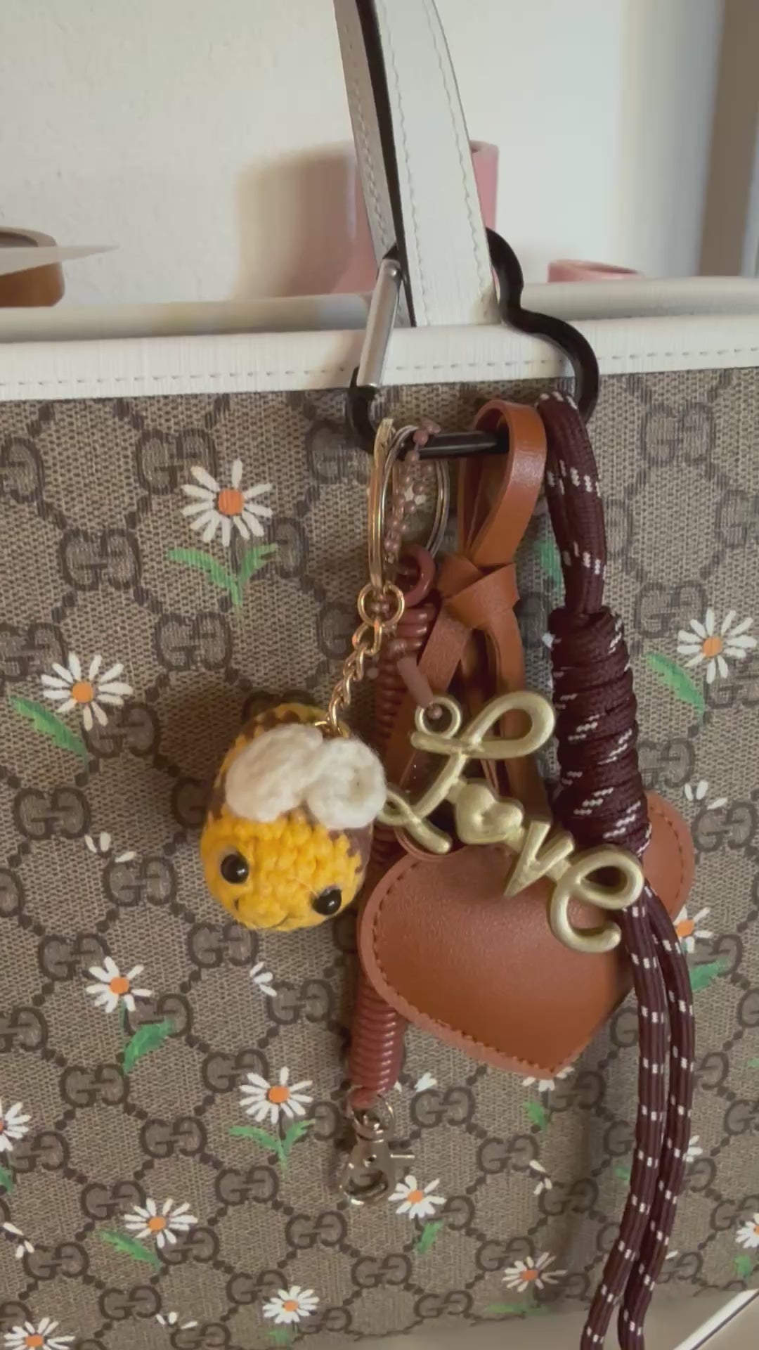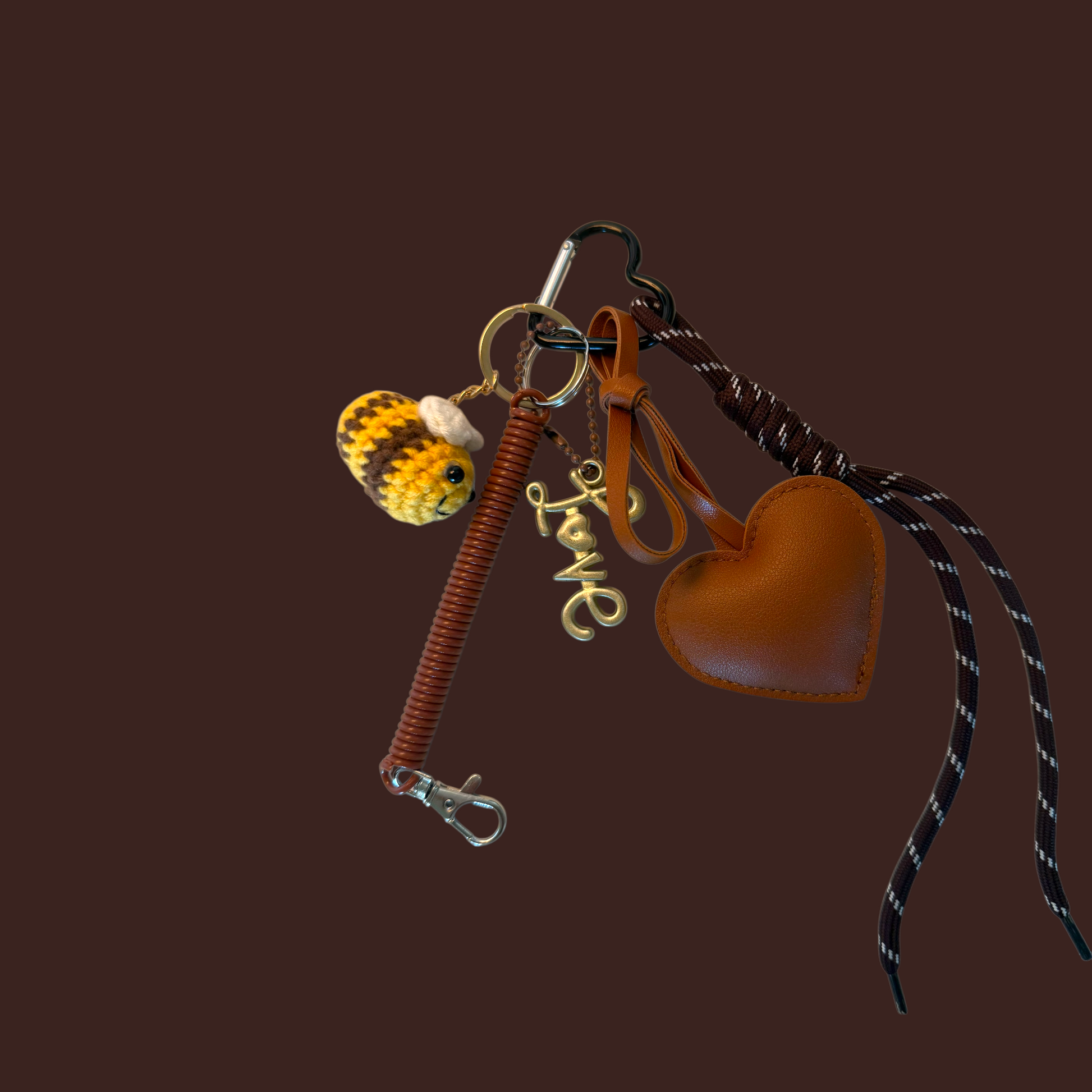 Die kleine gehäkelte Biene bringt gute Laune in deinen Alltag, während das weiche Kunstleder-Herz deinem Look eine warme, stilvolle Note verleiht.