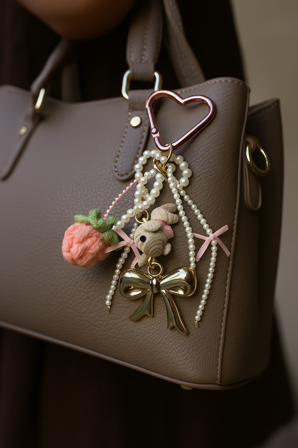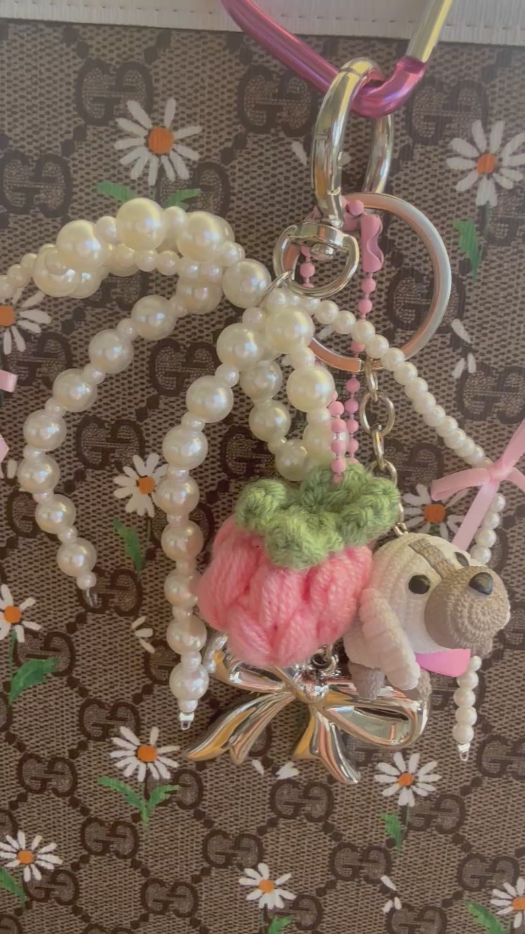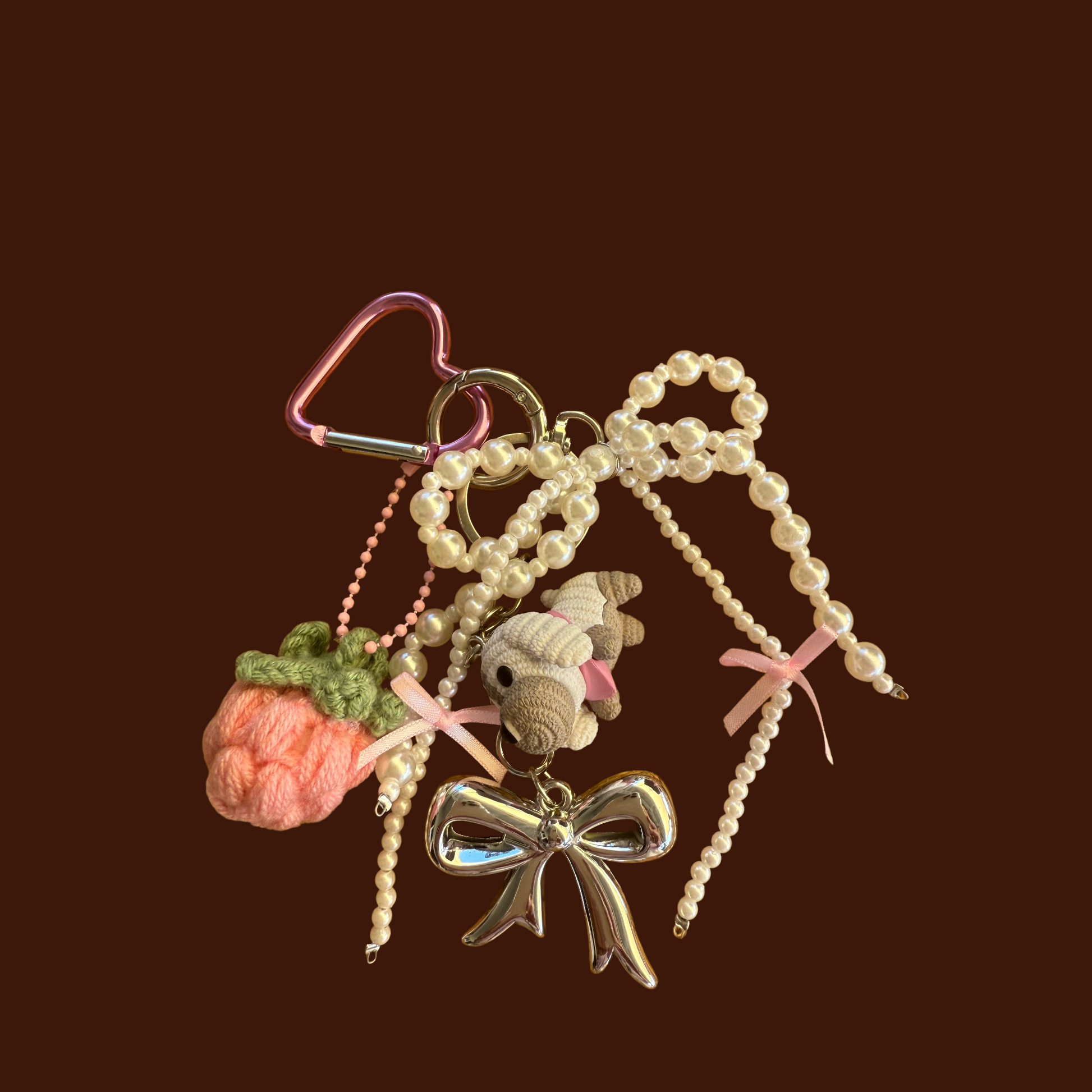 Die rosa gehäkelte Erdbeere bringt fruchtige Sweetness, der kleine Hund ist dein täglicher Begleiter, und die Perlenstränge mit Schleifen lassen jedes Outfit noch femininer wirken. Als i-Tüpfelchen funkelt die große silberne Schleife bei jeder Bewegung.