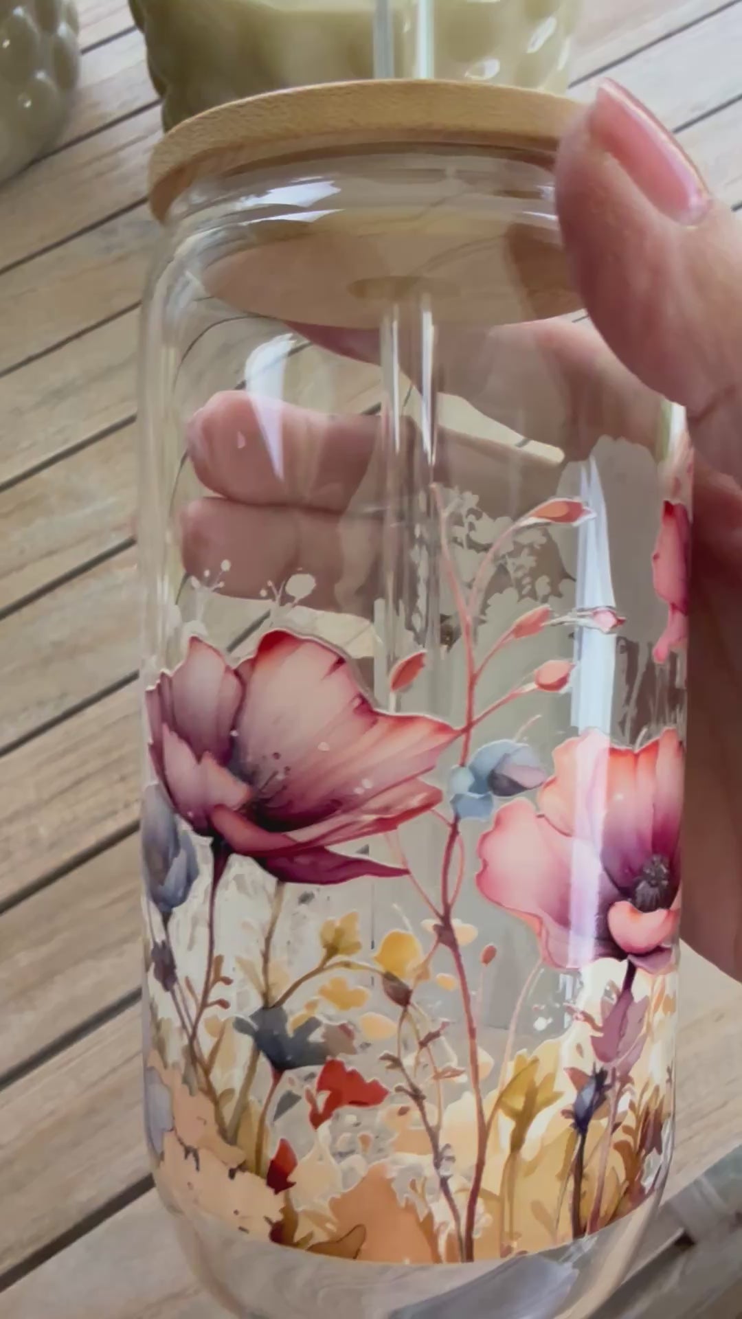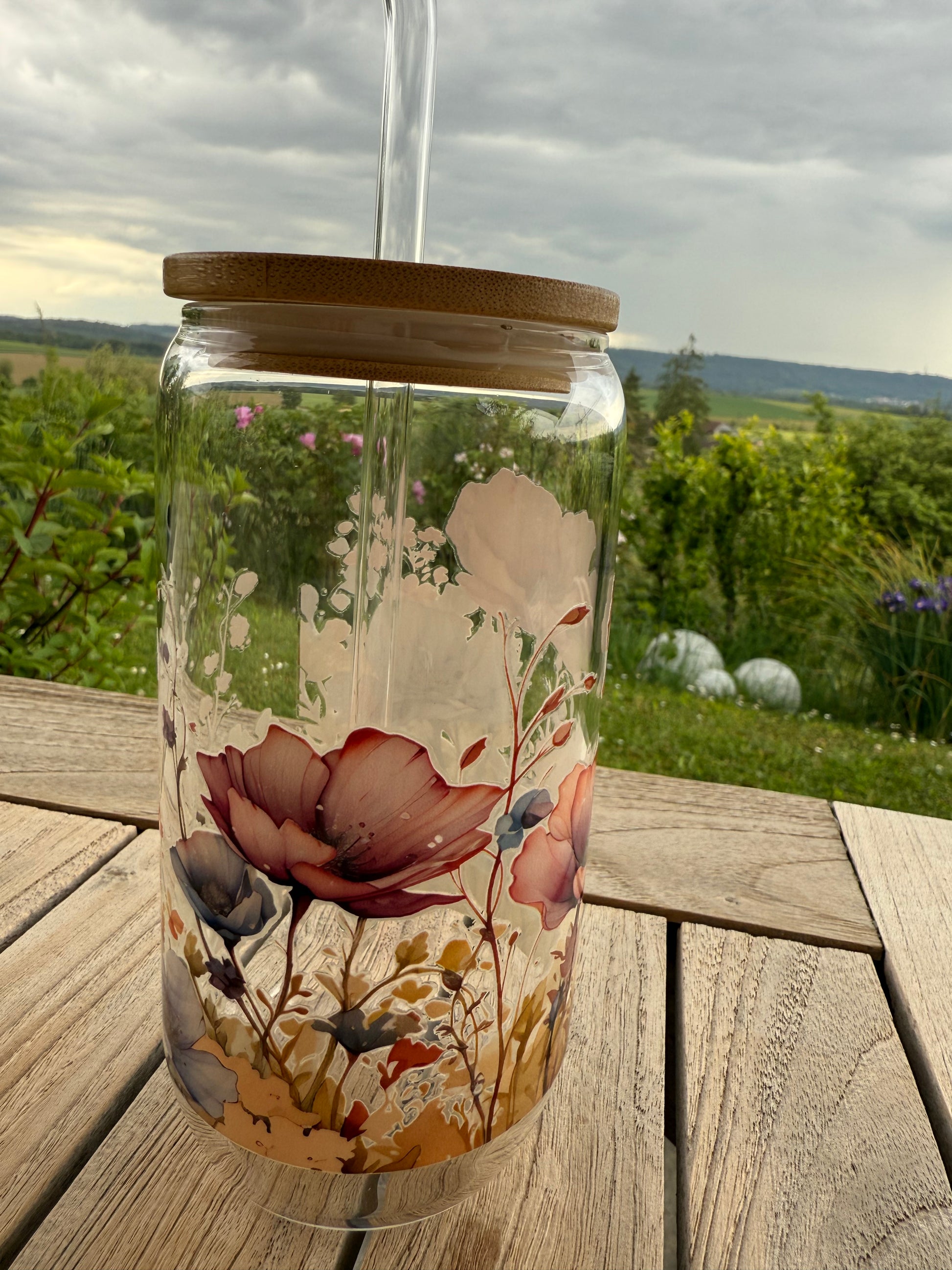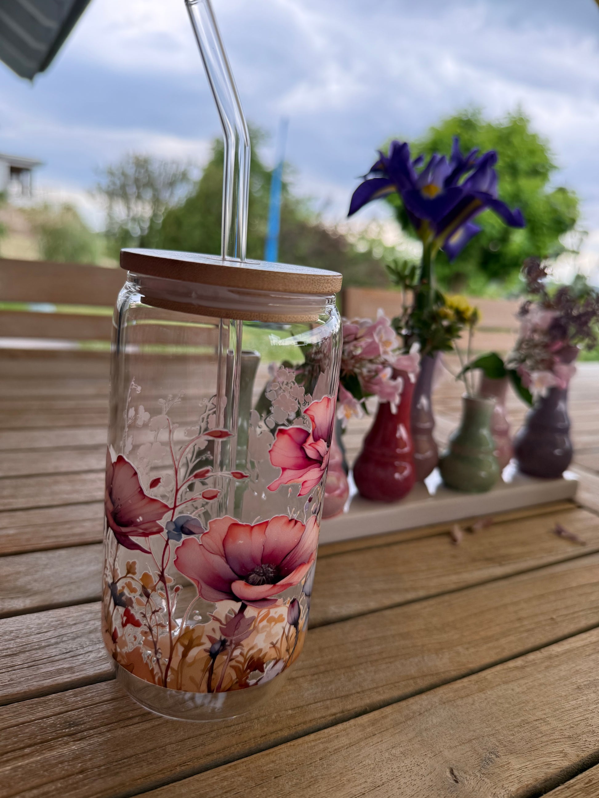 Dieses handveredelte Design-Trinkglas ist ein echtes Schmuckstück für alle, die florale Schönheit lieben! Auf dem 470 ml / 16 OZ fassenden Glas tanzen elegante Blüten in warmen Rosé-, Apricot- und Lavendeltönen – kunstvoll gestaltet mit langlebiger UV-DTF-Folie. Jedes Motiv wirkt wie ein kleines Aquarellgemälde und macht dein Lieblingsgetränk zu einem sinnlichen Genussmoment.