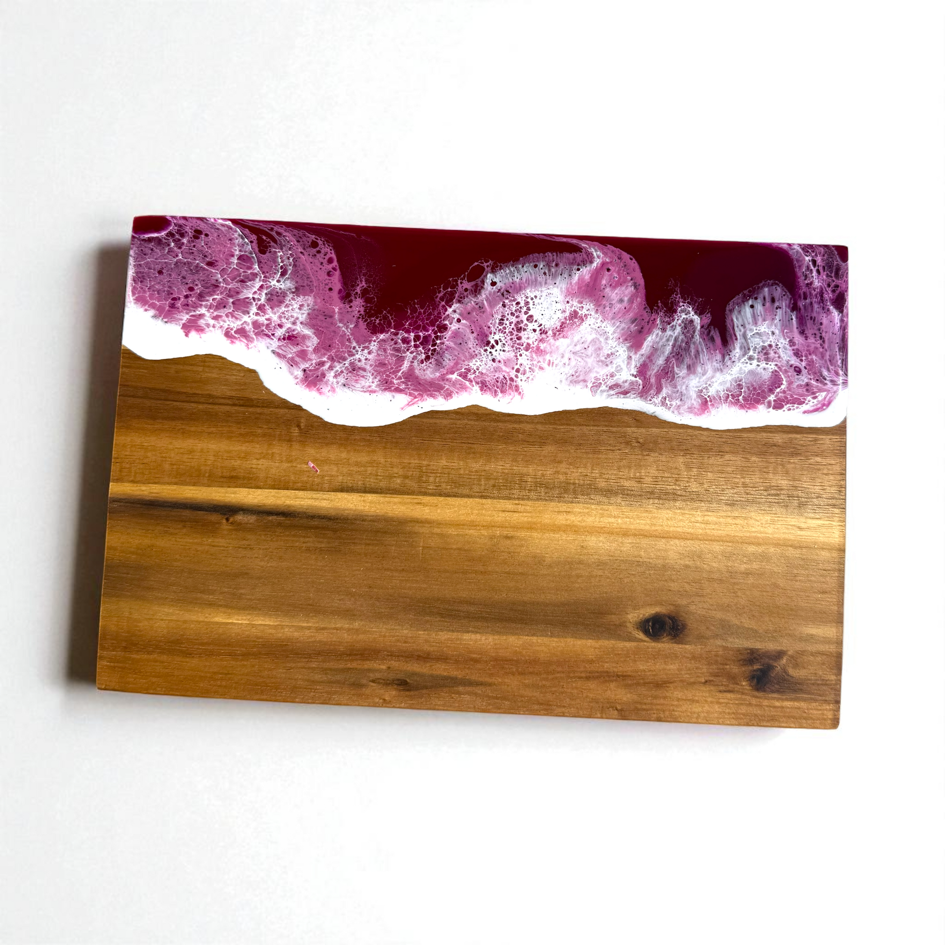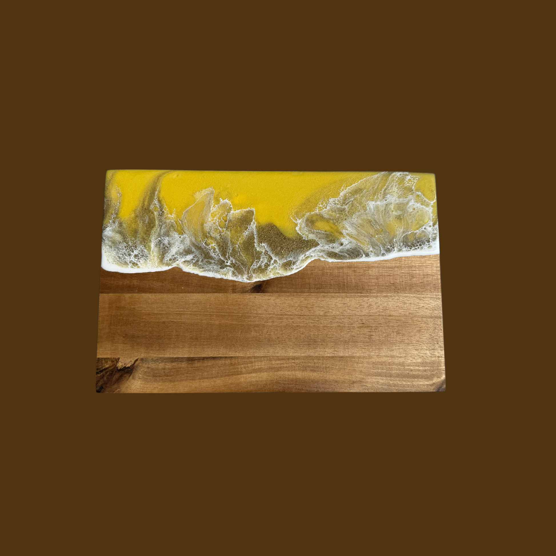 Das kleinere Servier- oder Schneidebrettchen aus FSC-zertifiziertem Akazienholz wird von mir von Hand mit Resin veredelt – liebevoll und mit künstlerischem Gespür.
