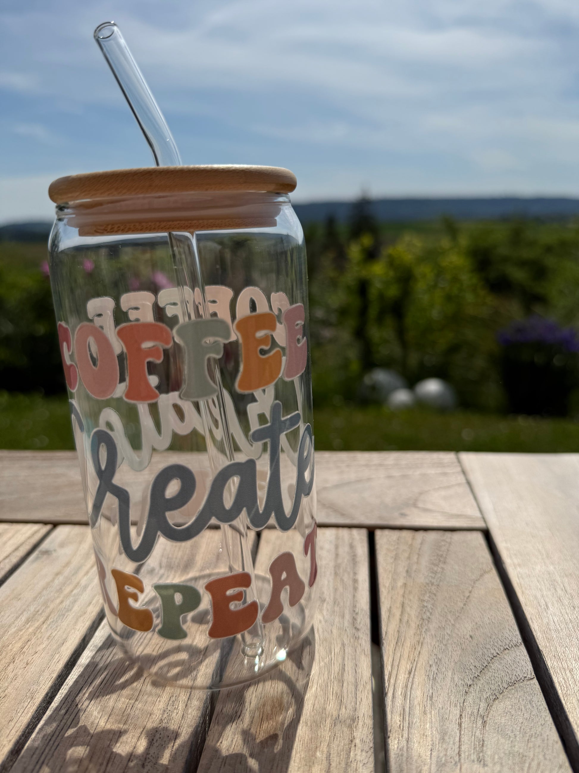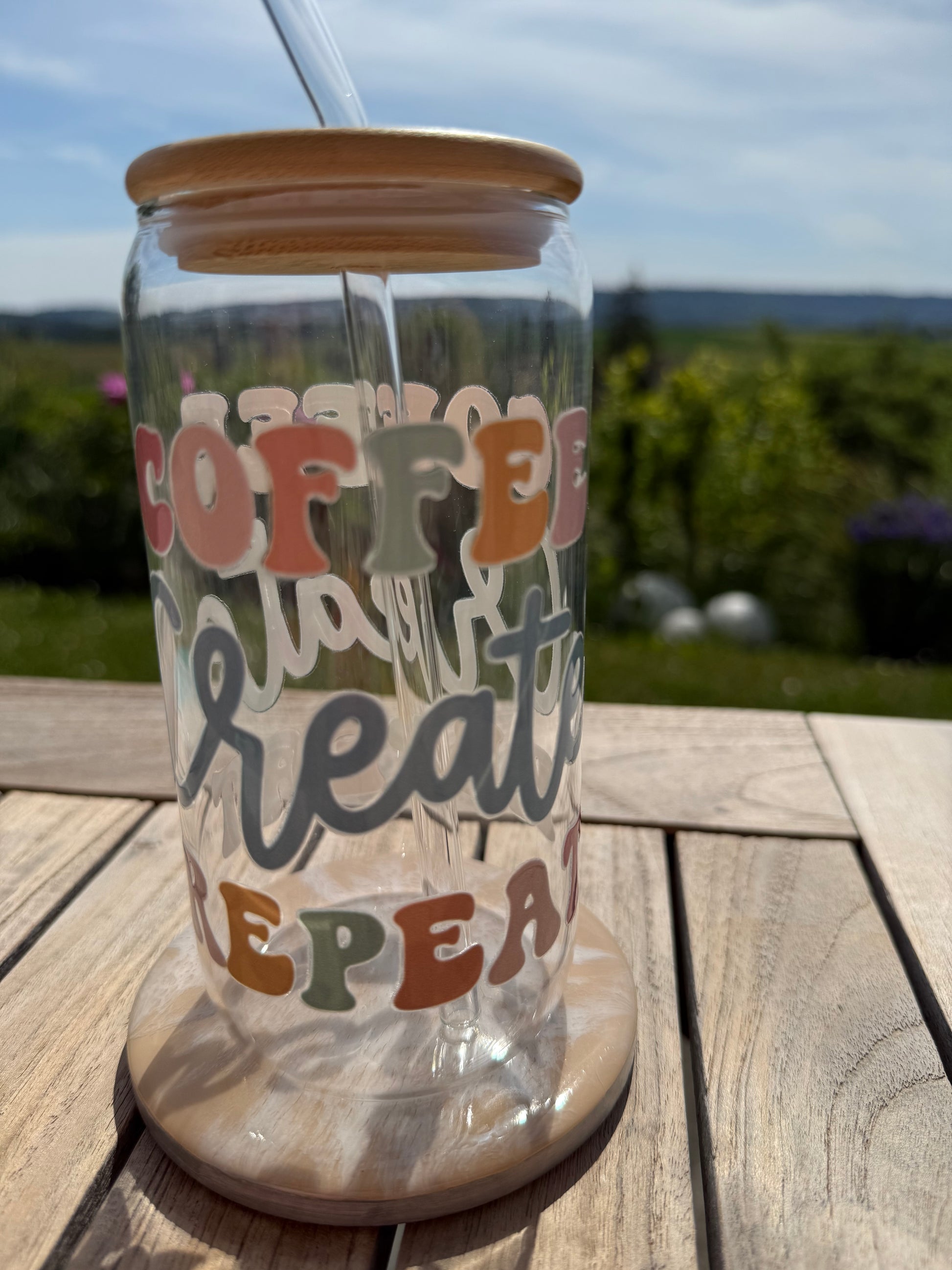 Design-Trinkglas „Coffee Cheat Repeat“ – 470 ml | Handveredelt | Bambusdeckel & Glasstrohhalm
