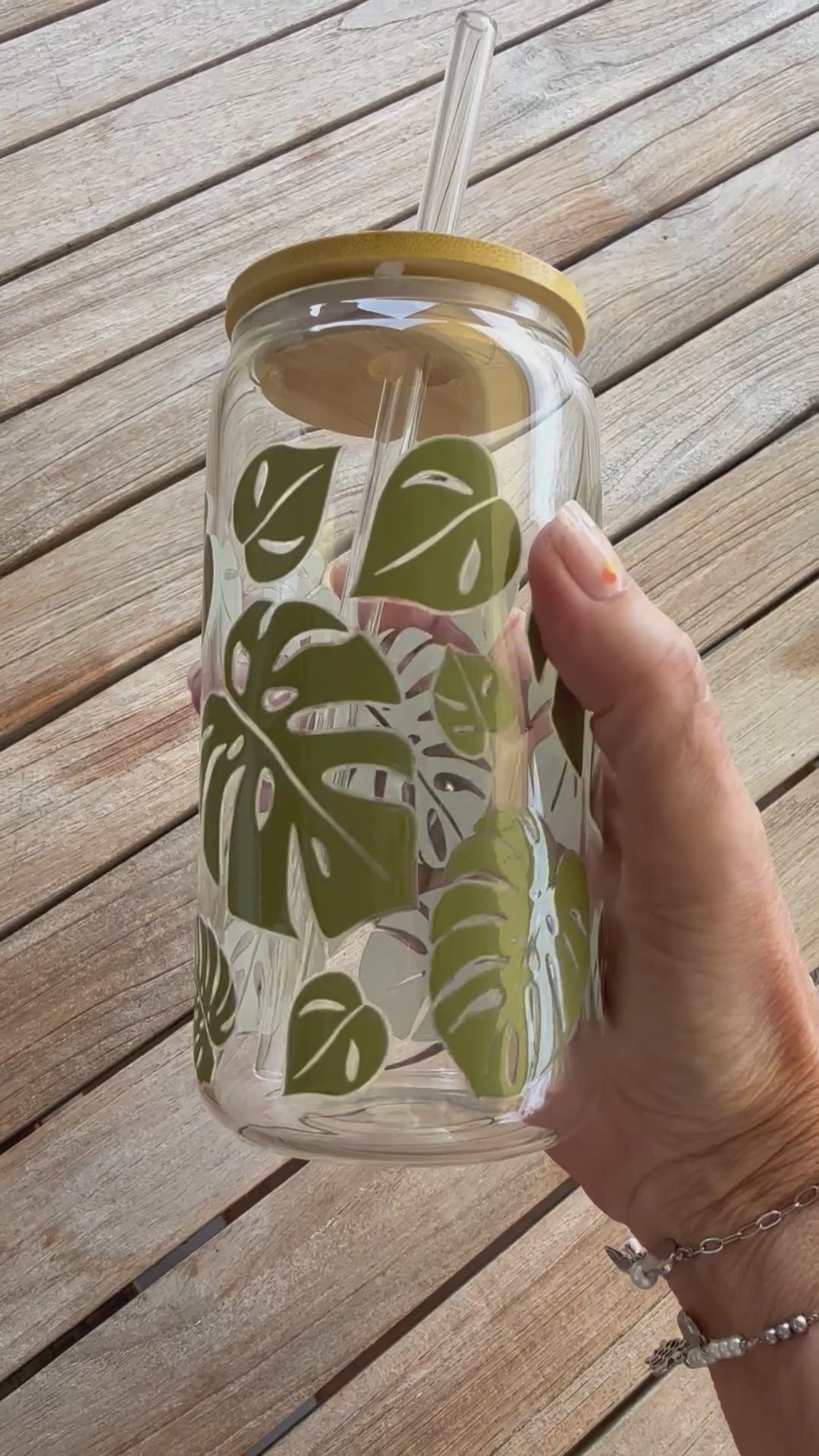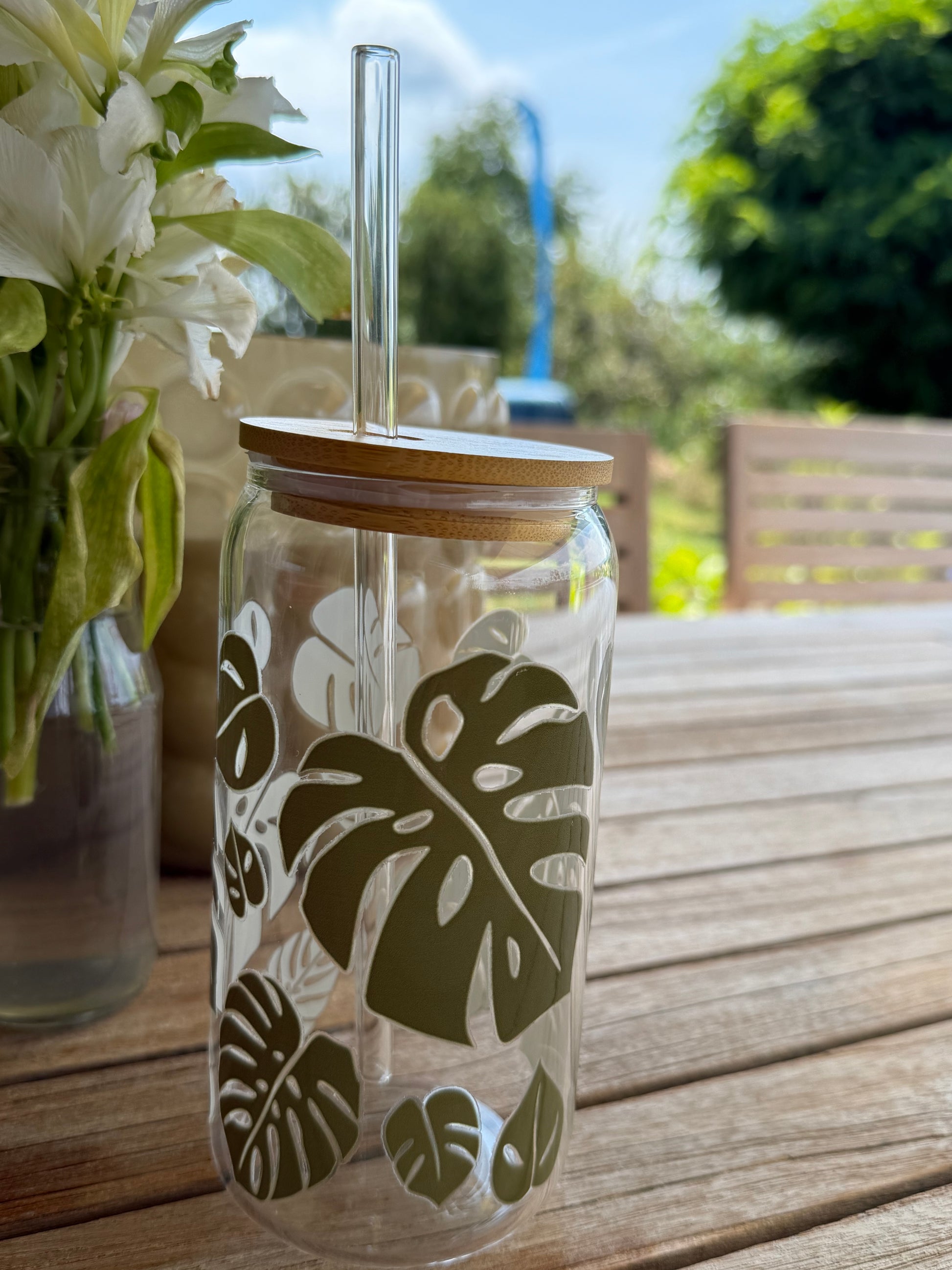 Verziert mit detailreichen Monstera-Blättern durch hochwertige UV-DTF-Technik, wird jedes Glas zum stylischen Statement – ob für deinen Eiskaffee, Detox-Wasser oder deinen liebsten Sommerdrink. ✨