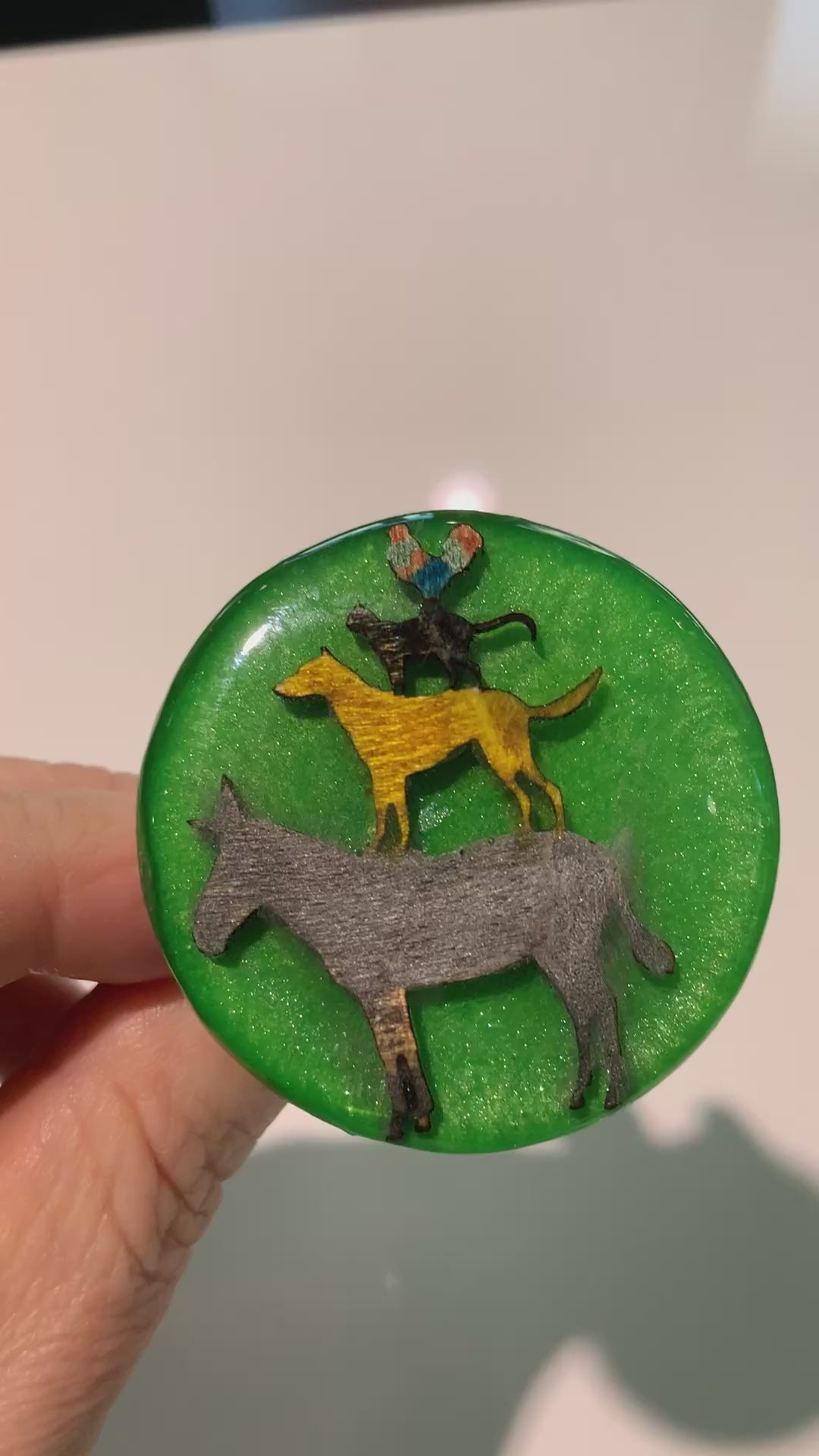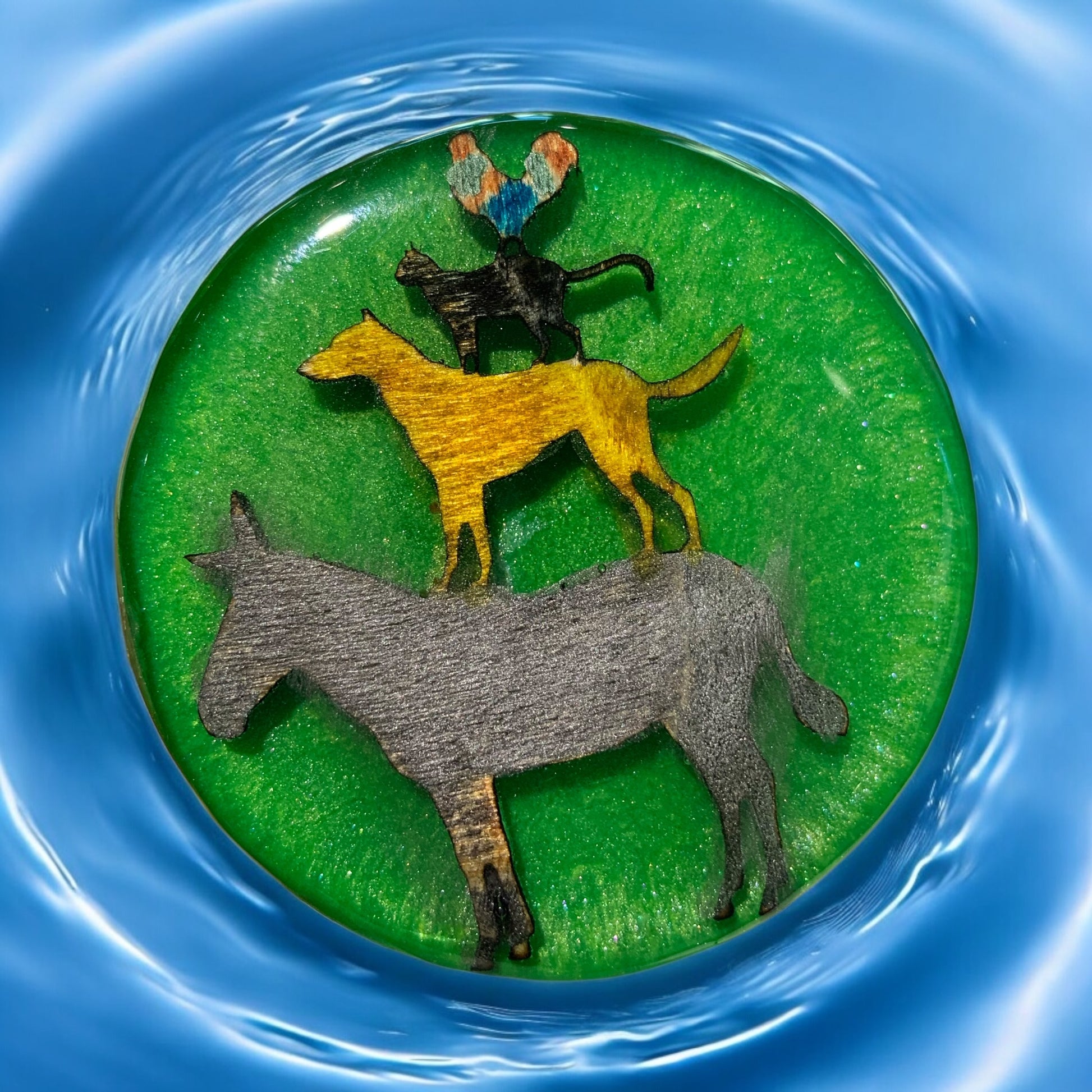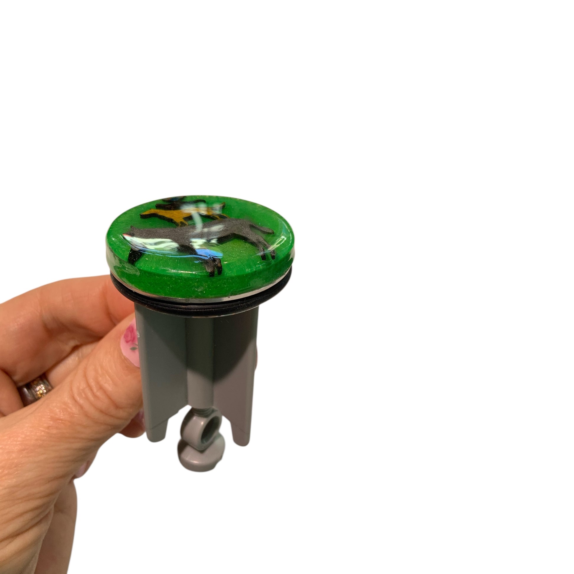 Dieser handveredelte Waschbeckenstöpsel zeigt die Bremer Stadtmusikanten in liebevoll bemalter Holzoptik, eingebettet in glasklares Resin auf leuchtend grünem Untergrund.