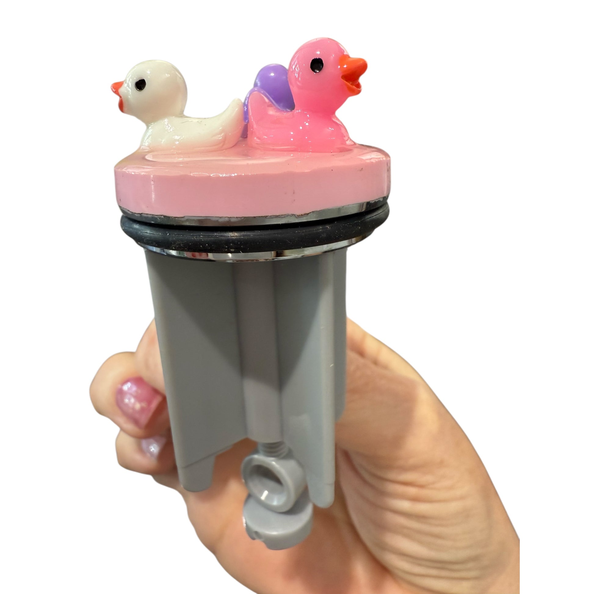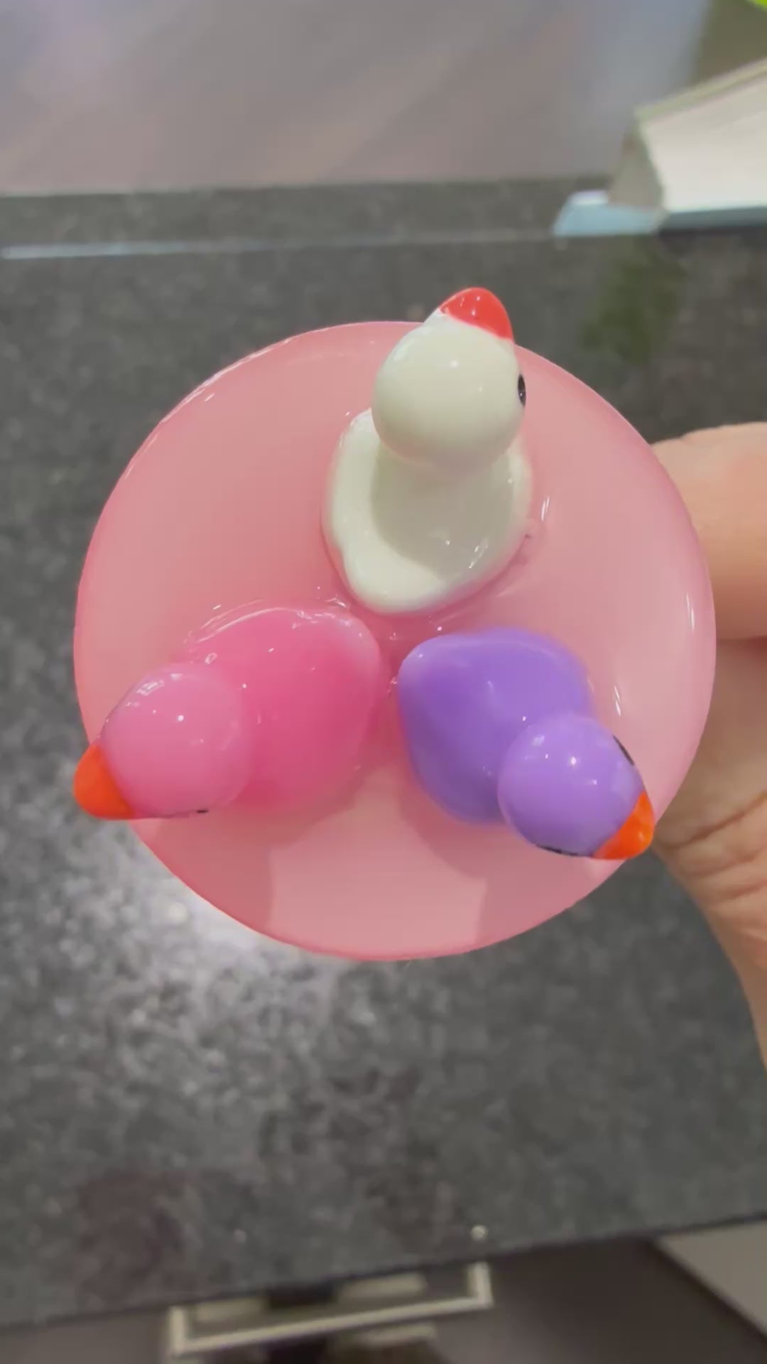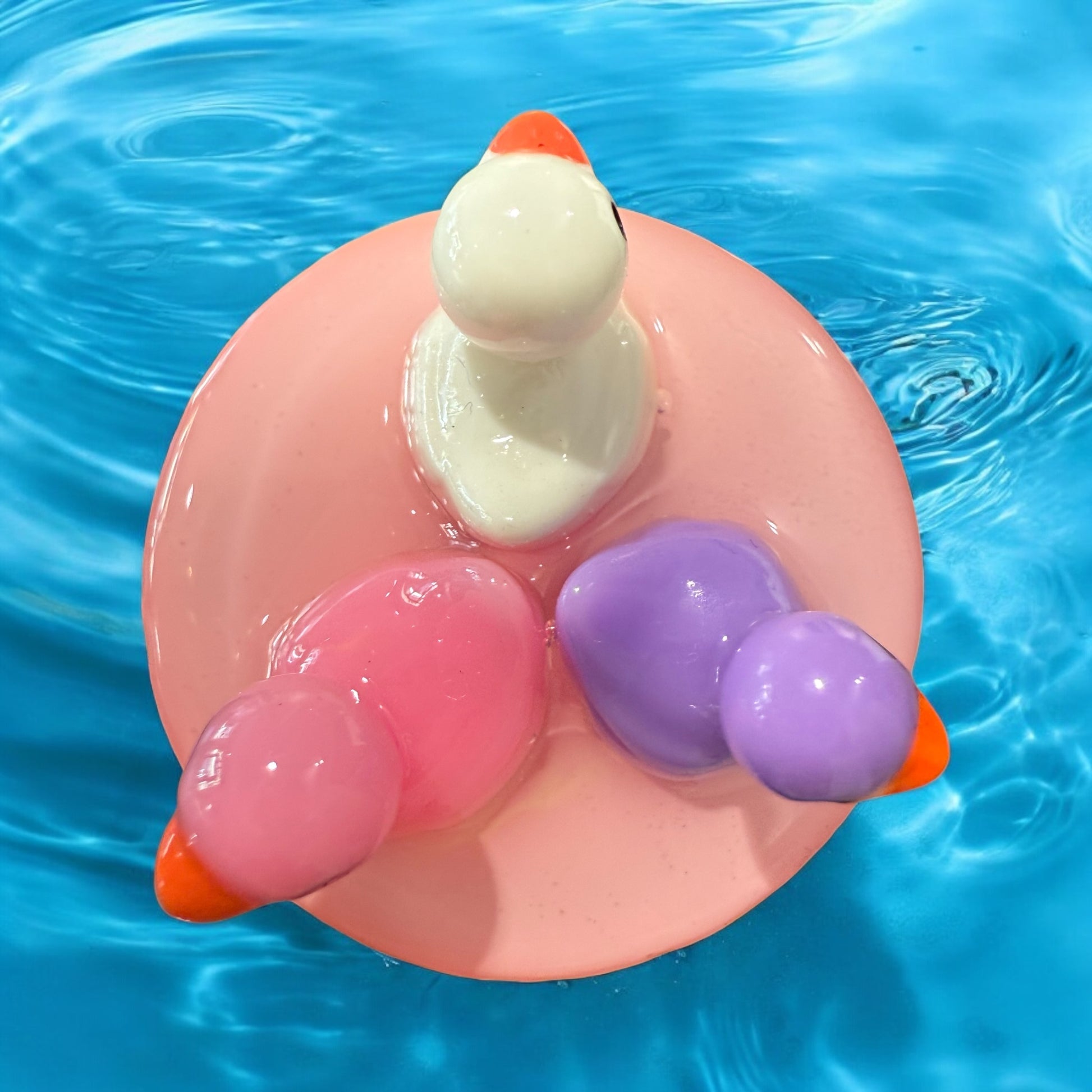 Diese drei kleinen Badeentchen haben sich auf rosa Wolken niedergelassen – oder besser gesagt: auf einem handveredelten Waschbeckenstöpsel mit zartem Resin-Untergrund in Rosa.