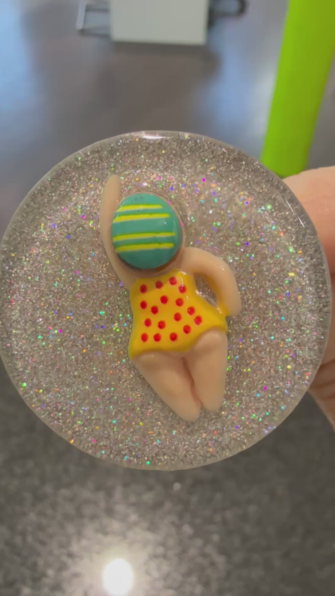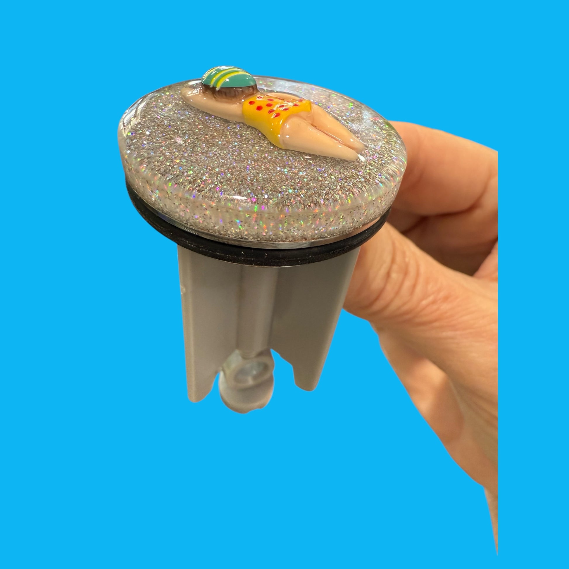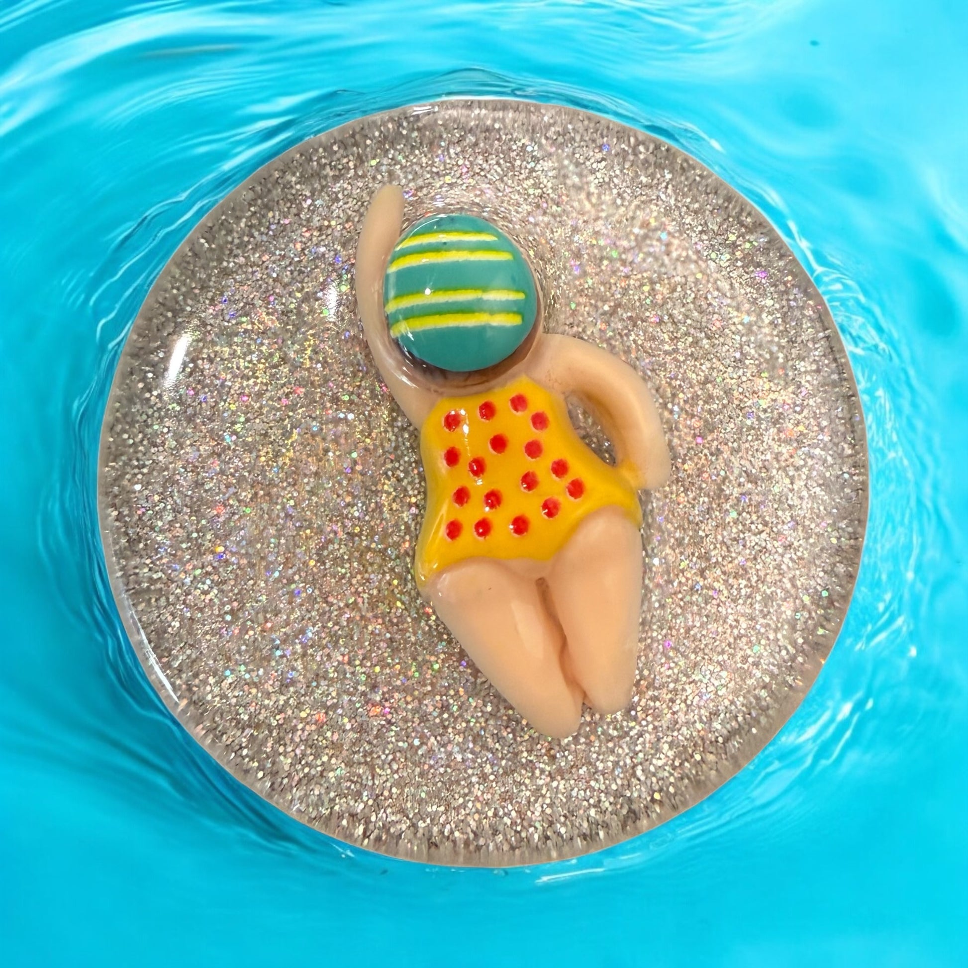 Diese handveredelte kleine Schwimmerin macht es sich auf einer holographisch glitzernden Resin-Schicht so richtig gemütlich – und zwar mitten auf deinem Waschbeckenstöpsel! Mit ihrem retro-inspirierten Badeanzug und der coolen Badekappe bringt sie Urlaubsfeeling direkt in dein Badezimmer.