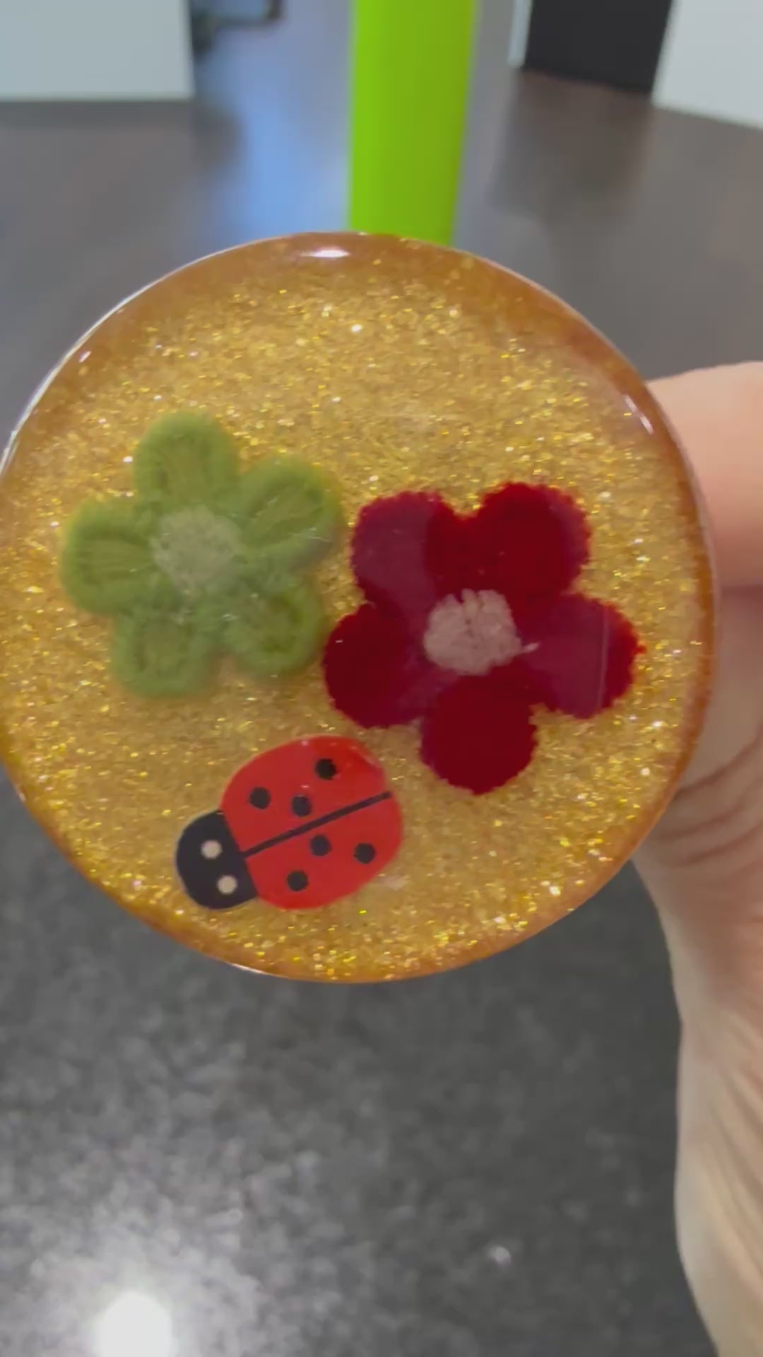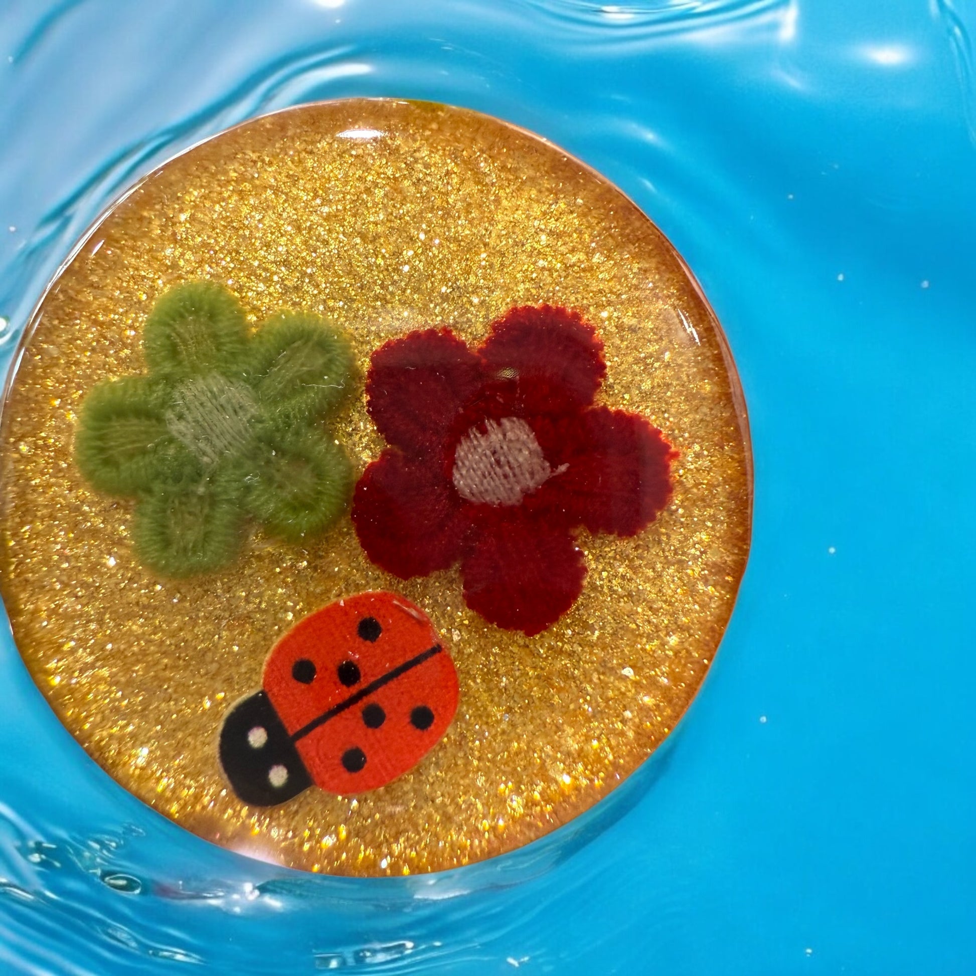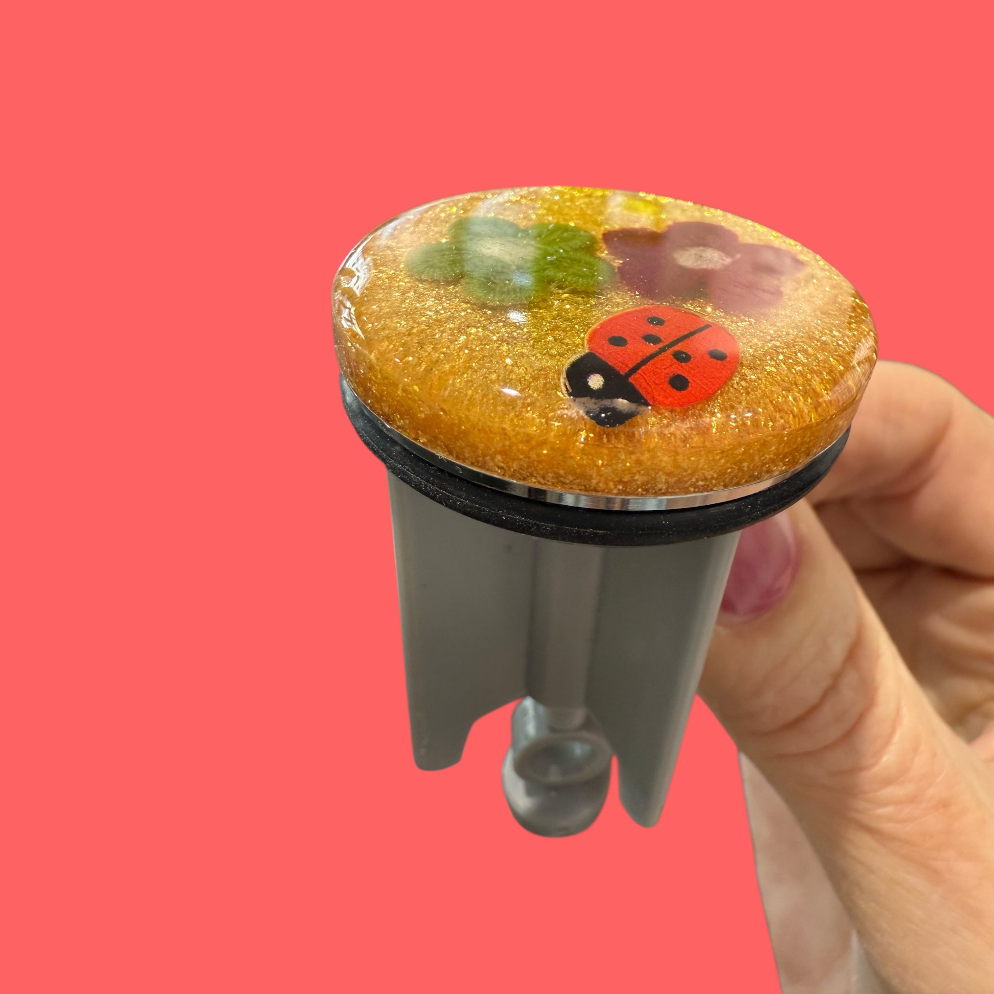 Ein kleiner Marienkäfer hat es sich auf einem funkelnden Glitzer-Resinbett gemütlich gemacht – umgeben von zwei zarten Stoffblumen, die sanft im goldenen Untergrund eingebettet sind. Dieser handveredelte Waschbeckenstöpsel bringt nicht nur Glanz, sondern auch eine Extraportion Glück in dein Badezimmer!