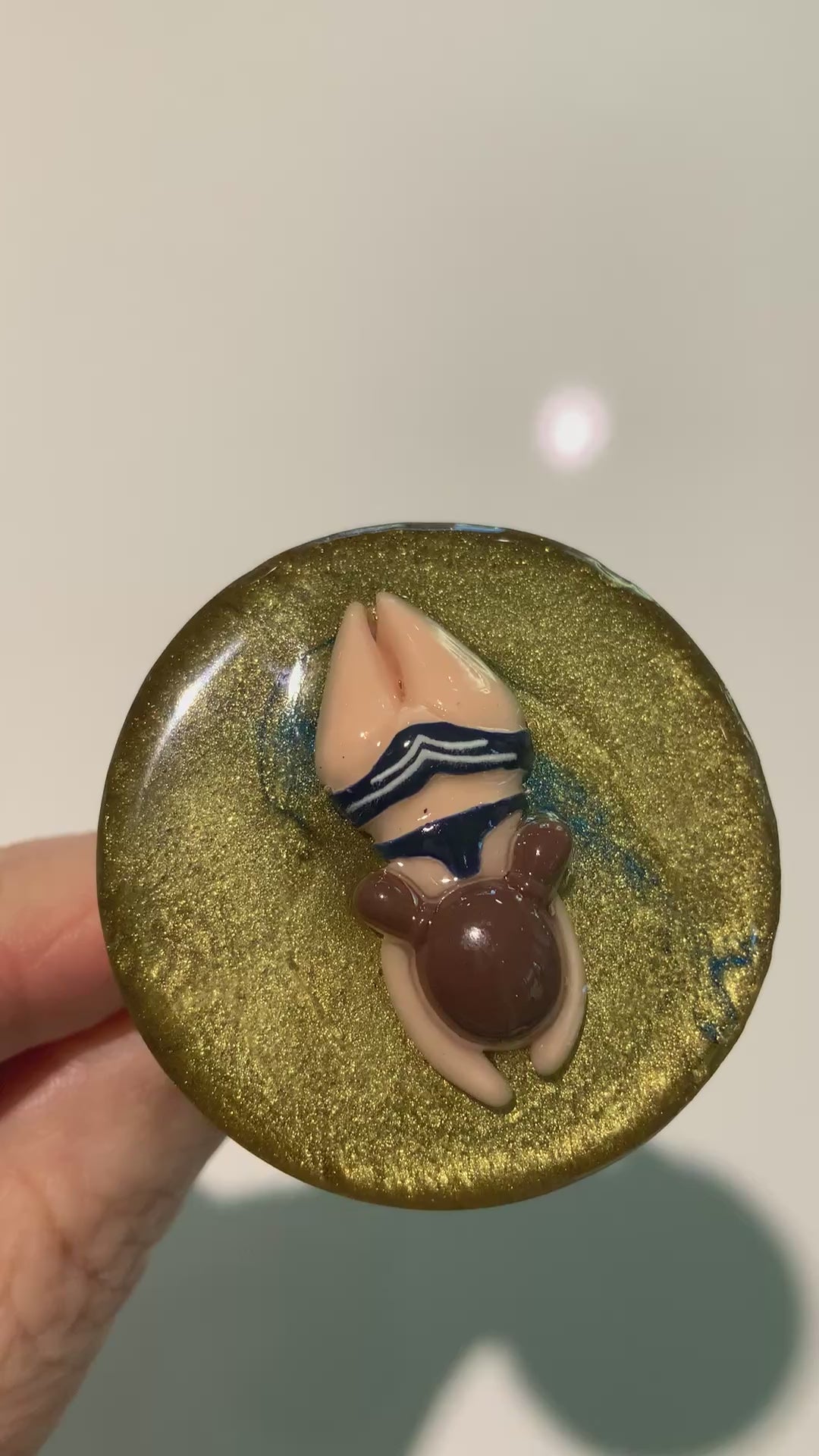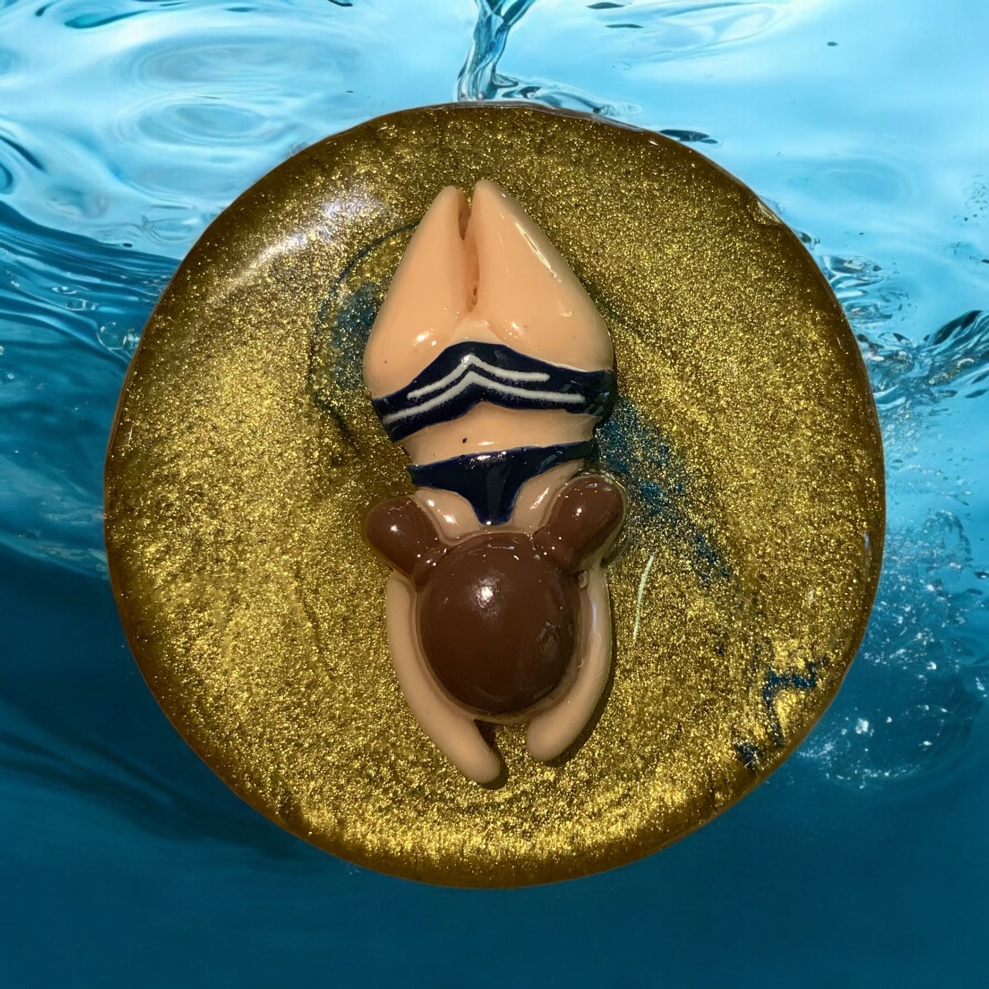 Mit einer kleinen, entspannten Schwimmerin im Bikini, eingebettet in strahlend goldfarbenes Resin, wird dein Waschbecken zur sonnigsten Wohlfühloase überhaupt.