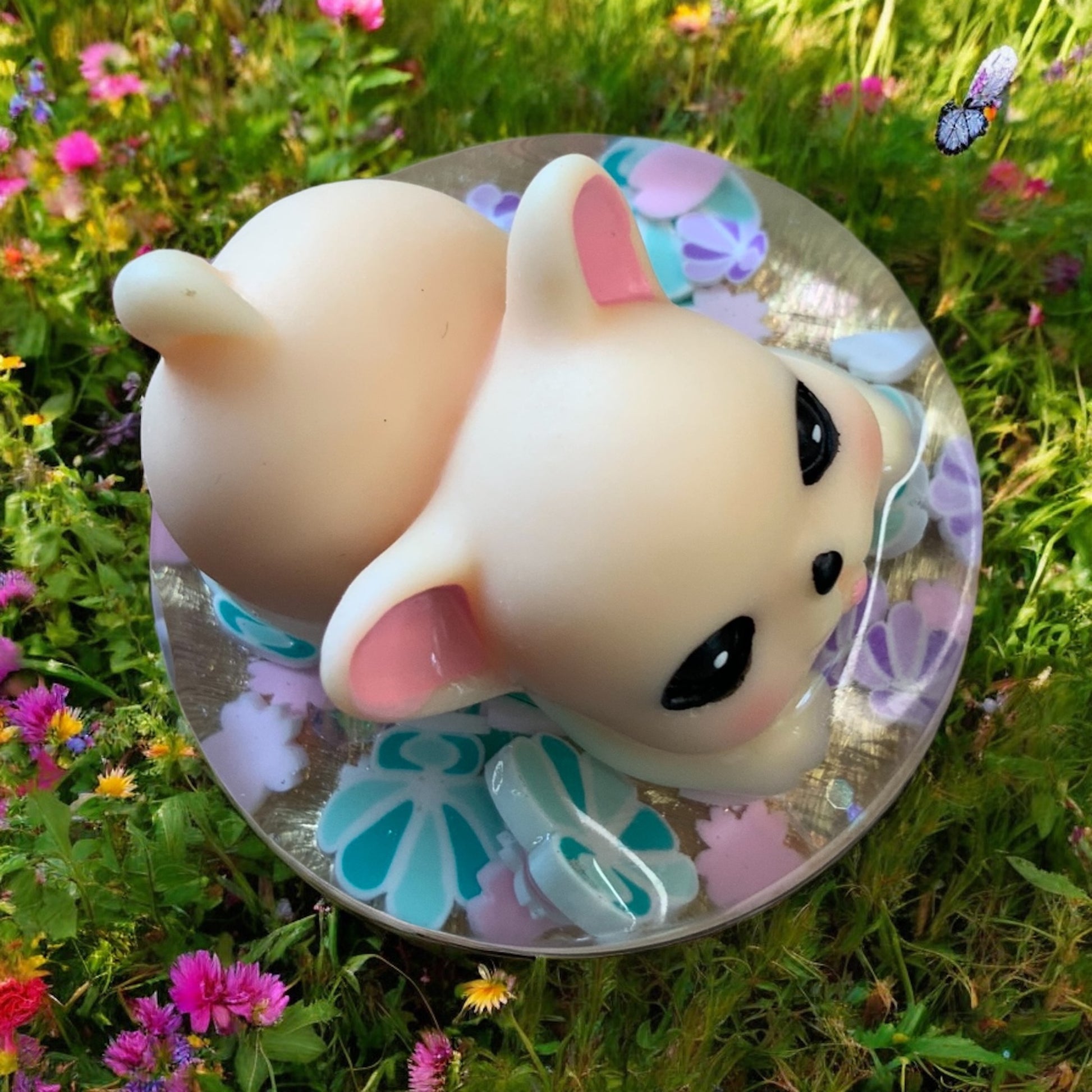 Verziert mit einem niedlichen kleinen Hund auf einer farbenfrohen, glänzenden Resin-Oberfläche, wird dein Waschplatz zum echten Hingucker.