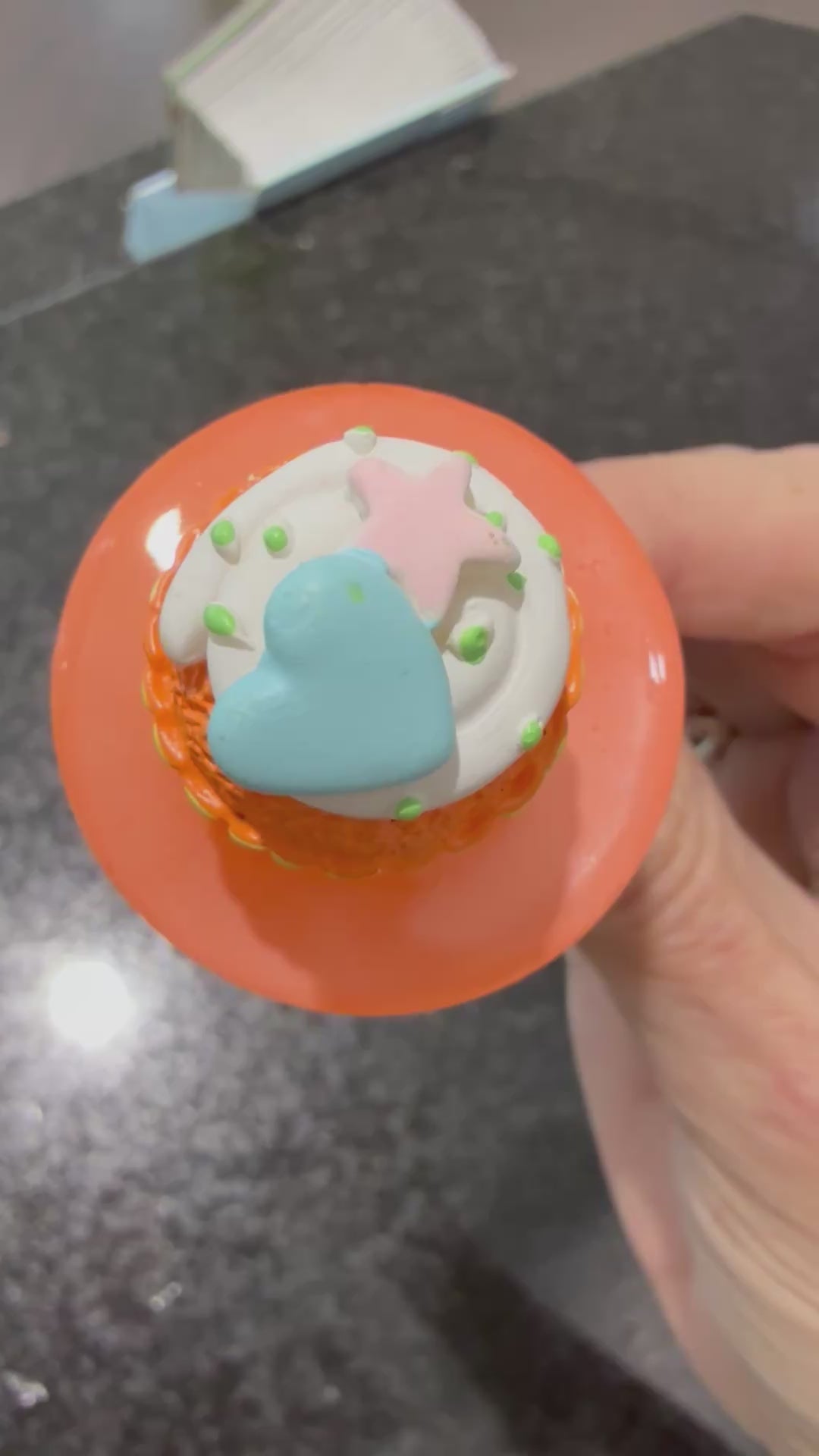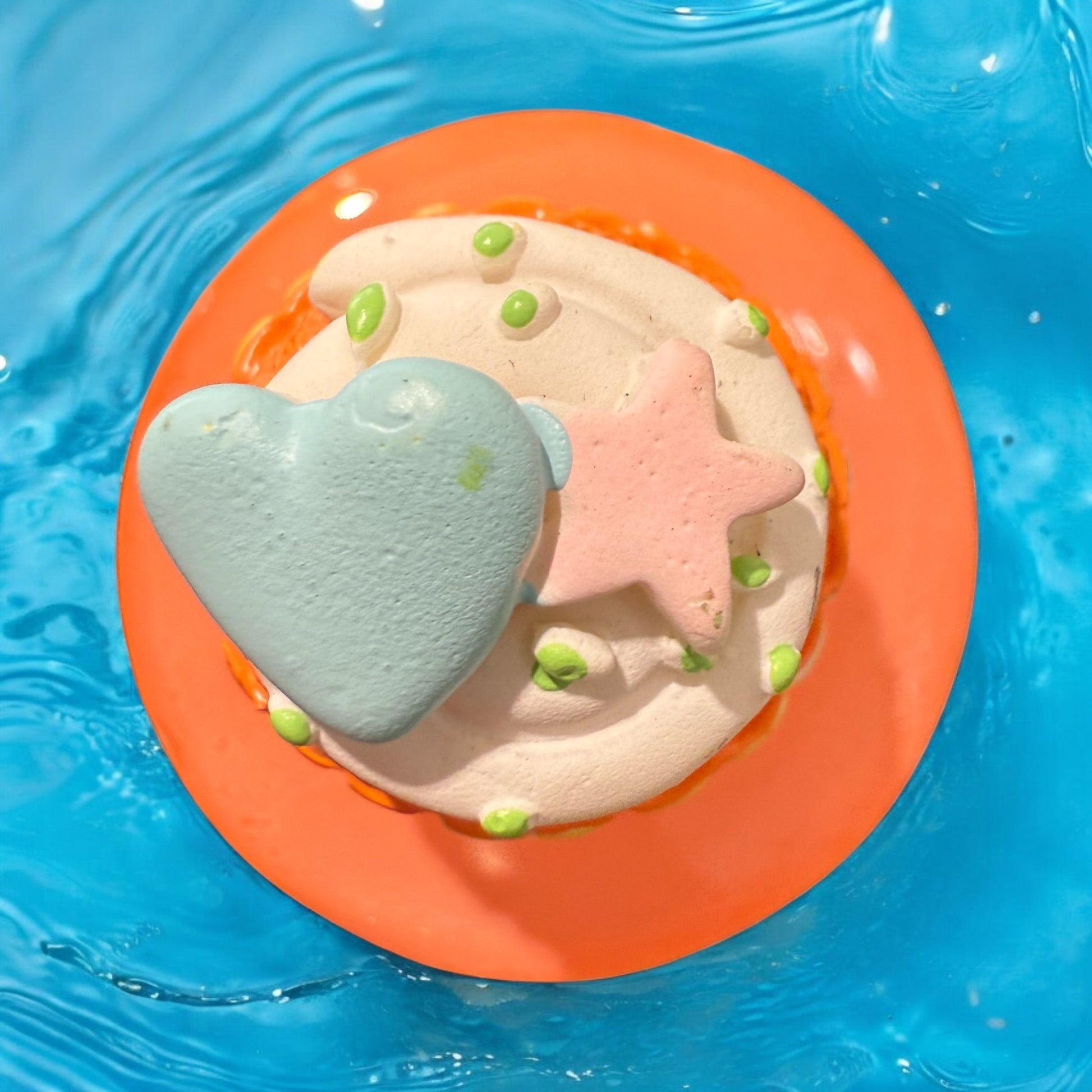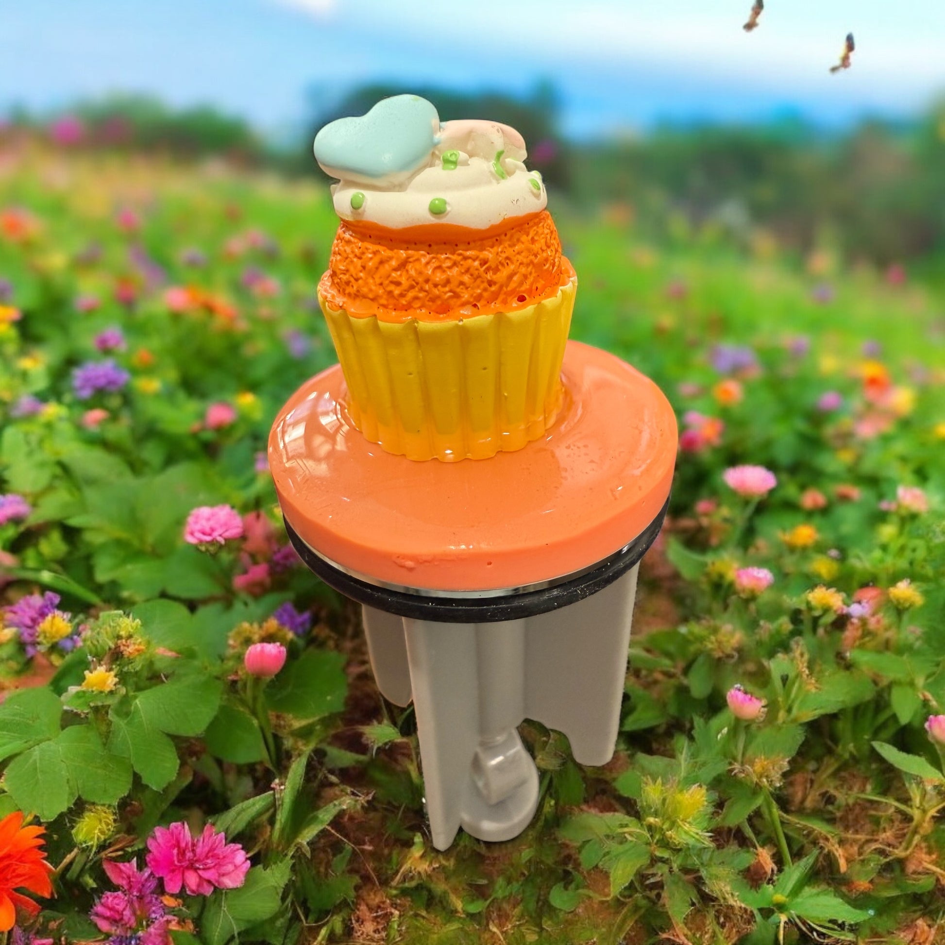 Auf einem glänzenden aprikofarbenen Resinbett thront ein knallbunter Muffin mit Sahnehäubchen, Herz und Sternchen – bereit, dein Waschbecken zur Partylocation zu machen.
