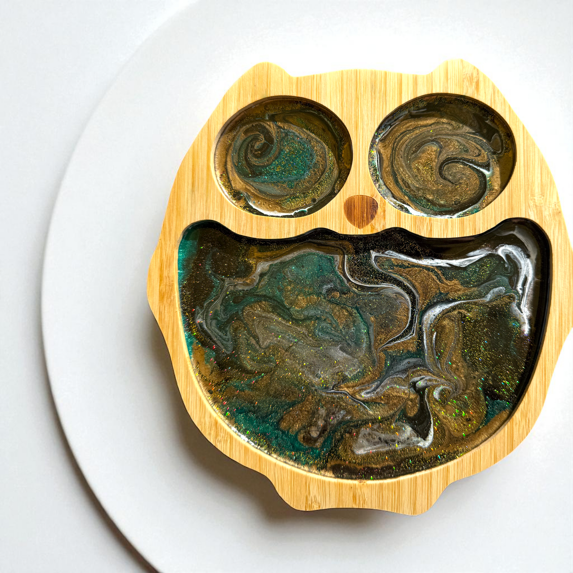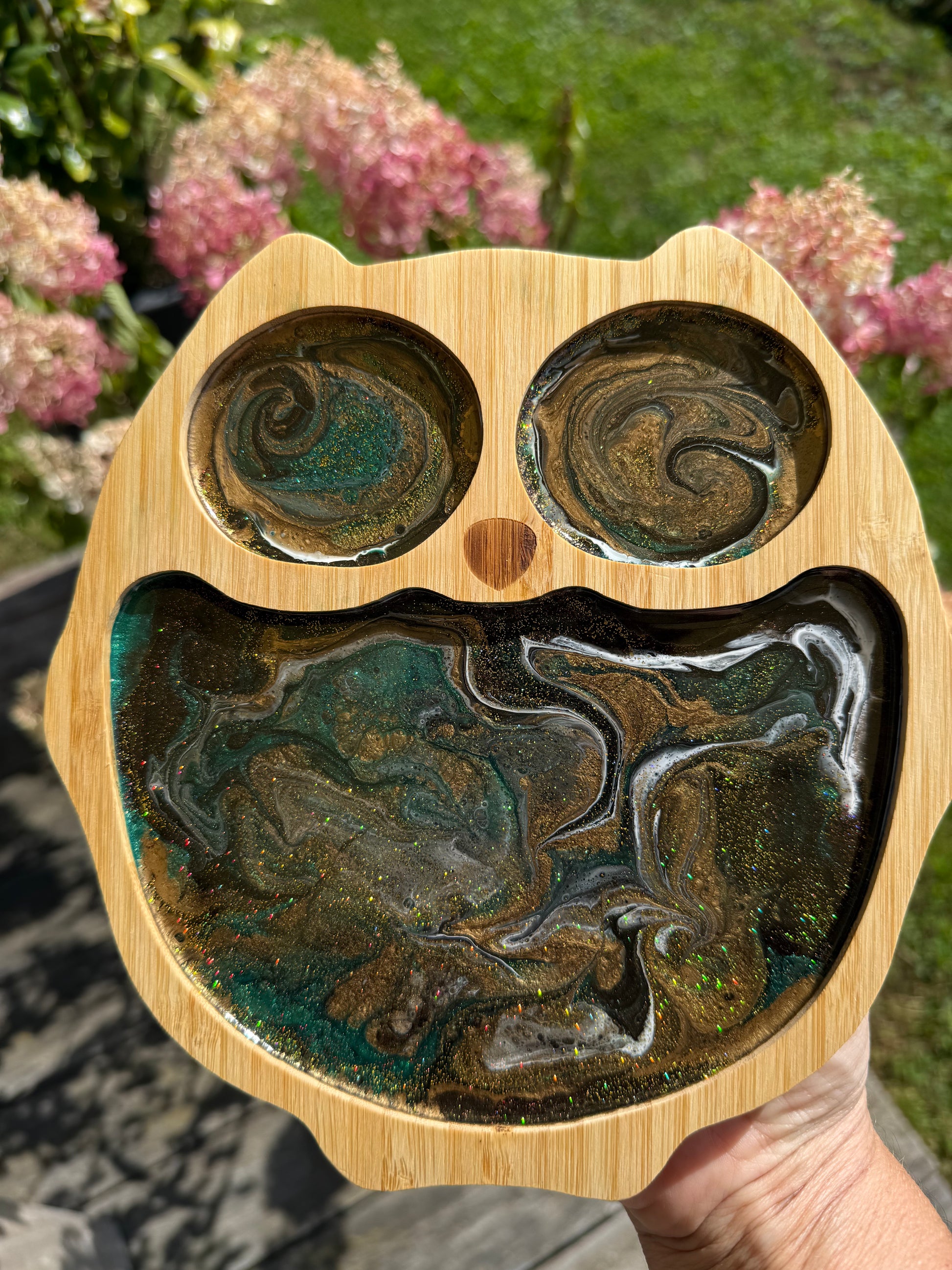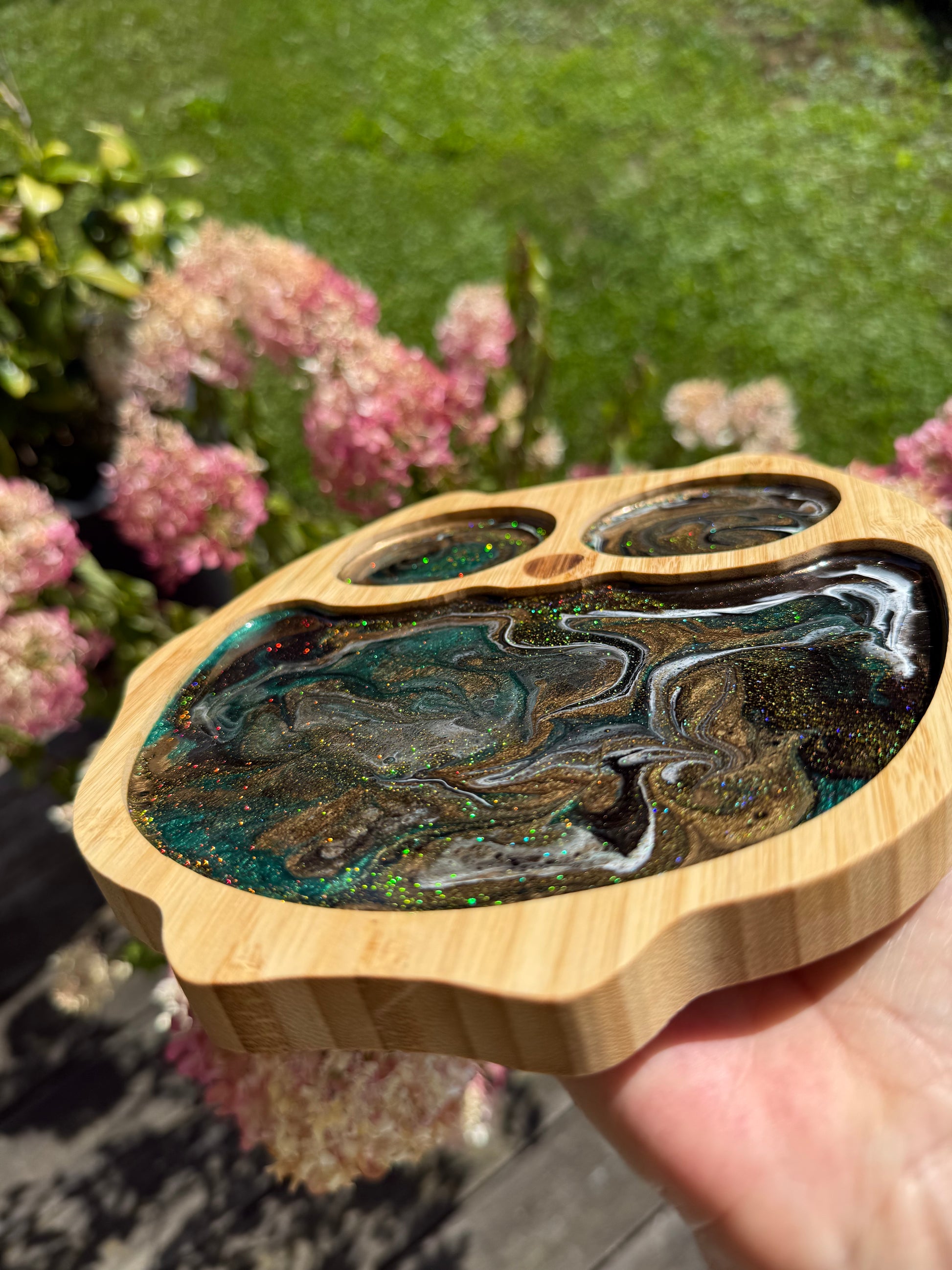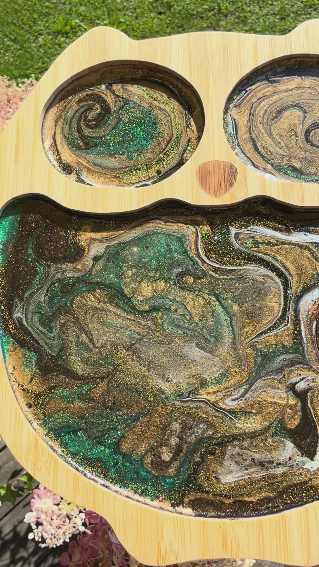 In liebevoller Handarbeit habe ich die Mulden mit fließenden Resinstrukturen gefüllt, in denen Gold, Kupfer, Smaragdgrün und tiefes Braun ineinander übergehen.