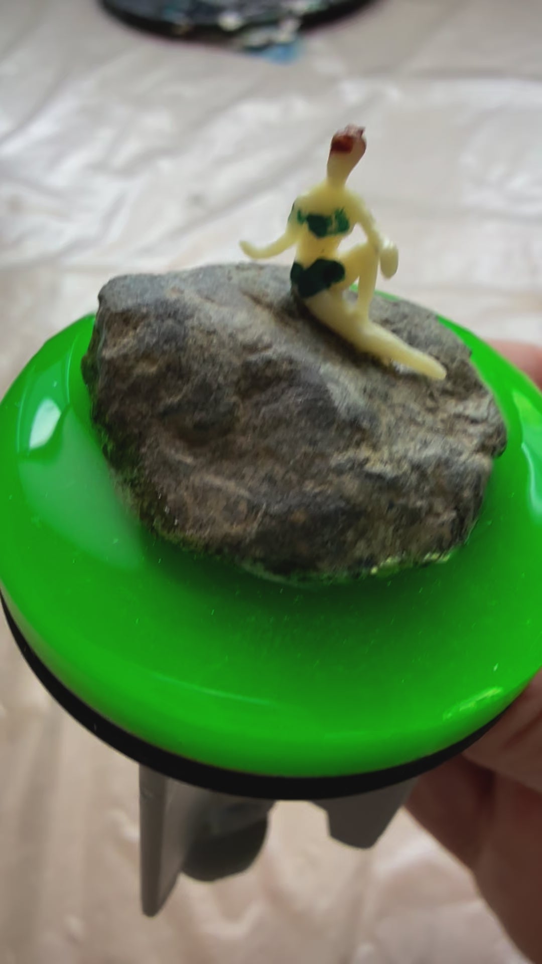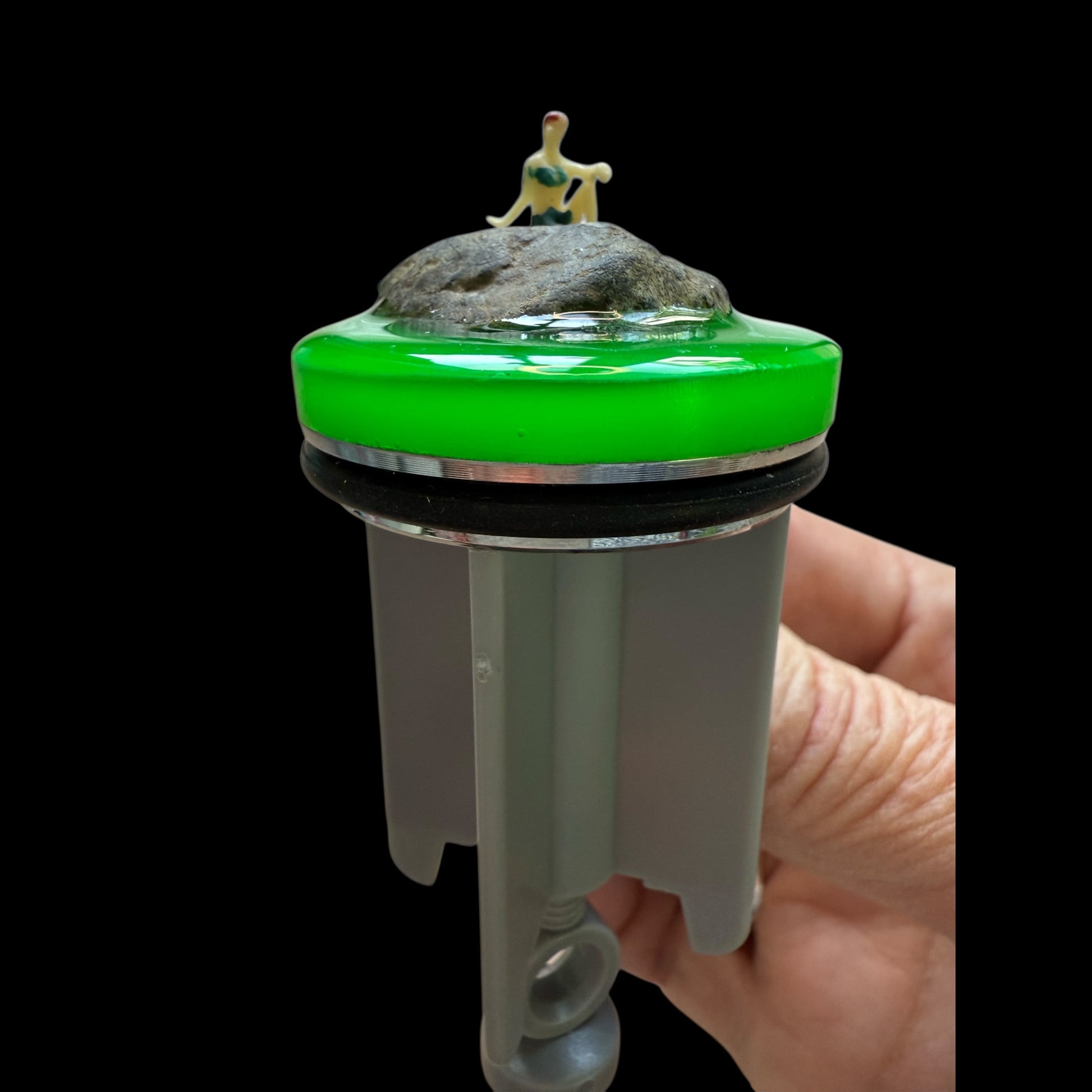 “Inselmoment” – Handveredelter Waschbeckenstöpsel mit Fels und Figur auf Neongrün