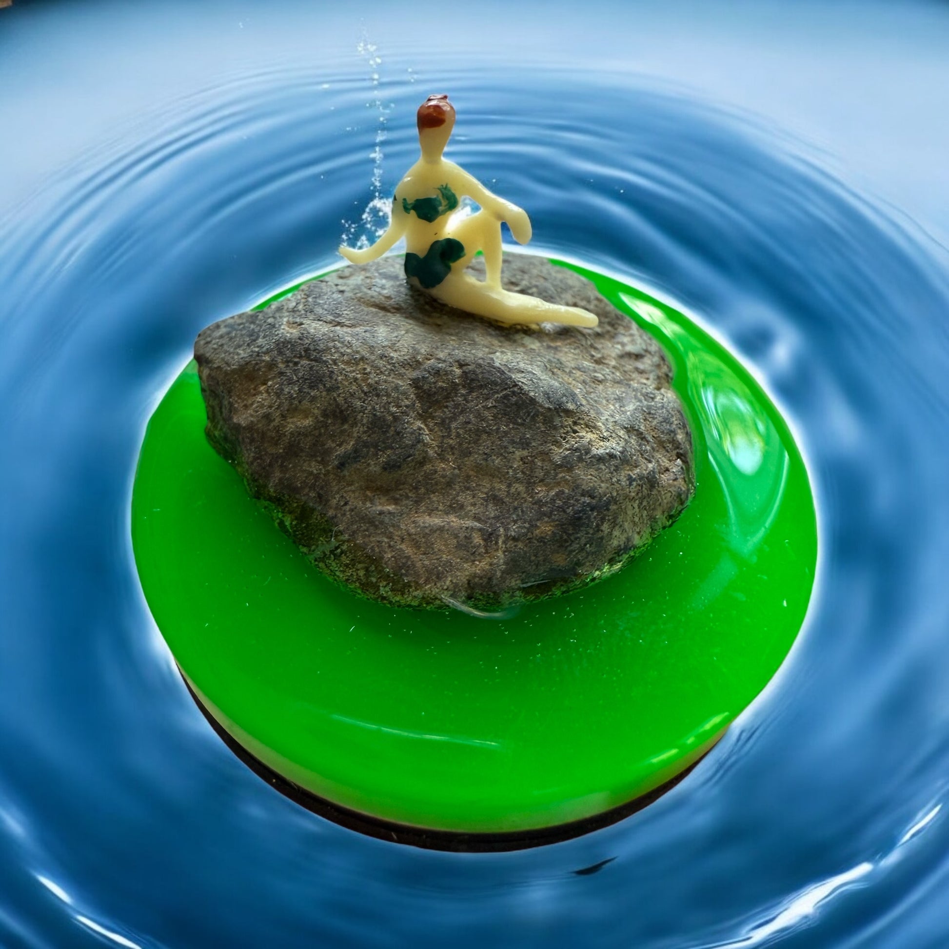 Eine winzige Frau im Bikini sitzt entspannt auf einem echten Stein – mitten auf einem leuchtenden, neongrünen Resin-Bett.