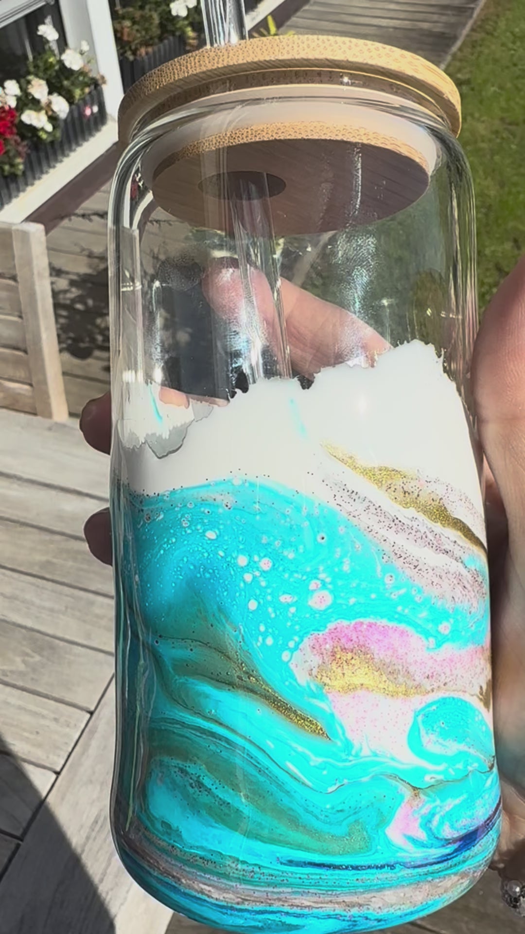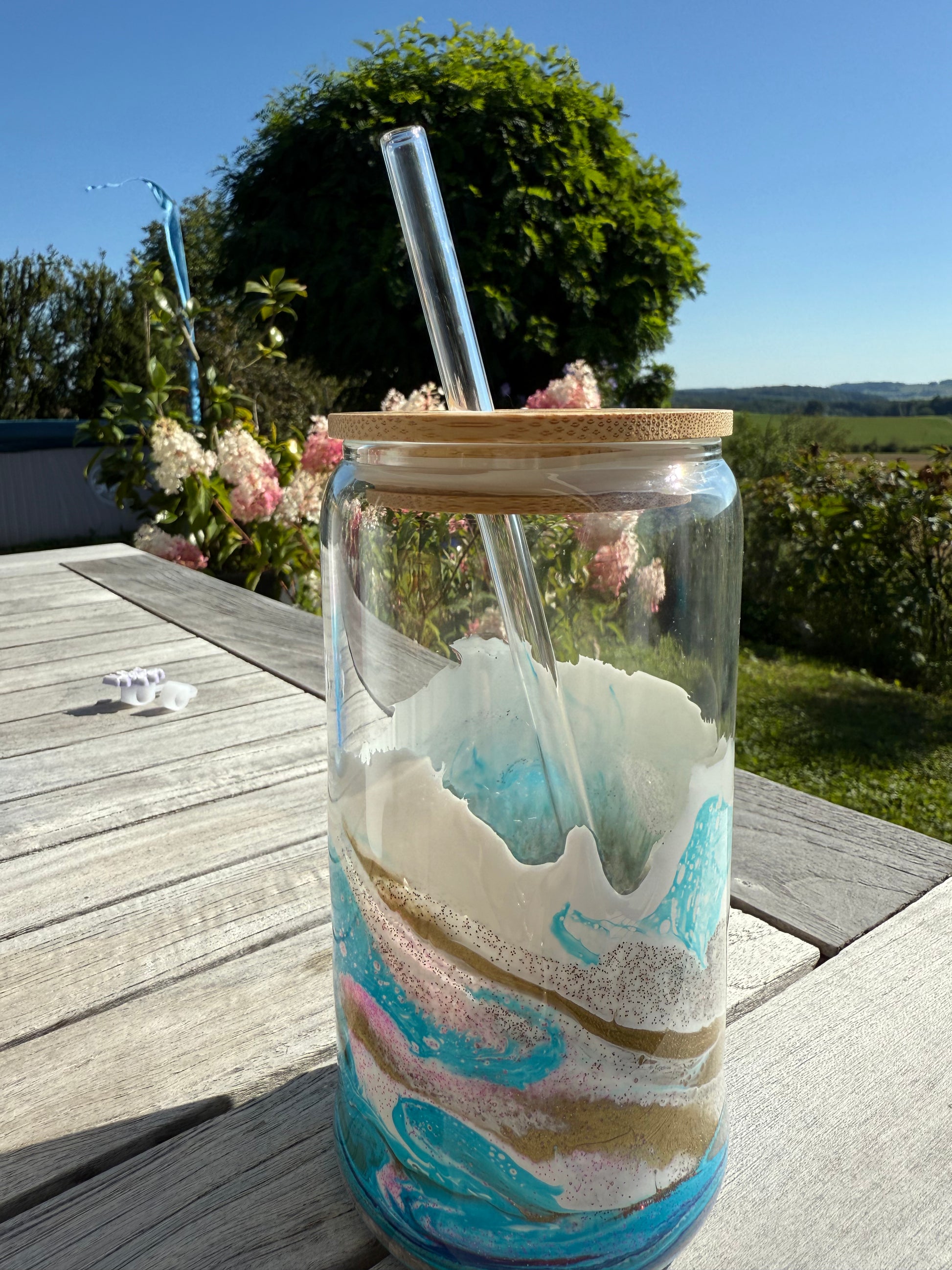 • Material: Glas, handgegossenes Resin-Design (Epoxidharz), Bambusdeckel, Glasstrohhalm