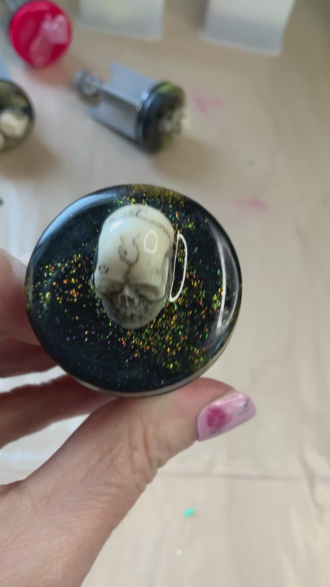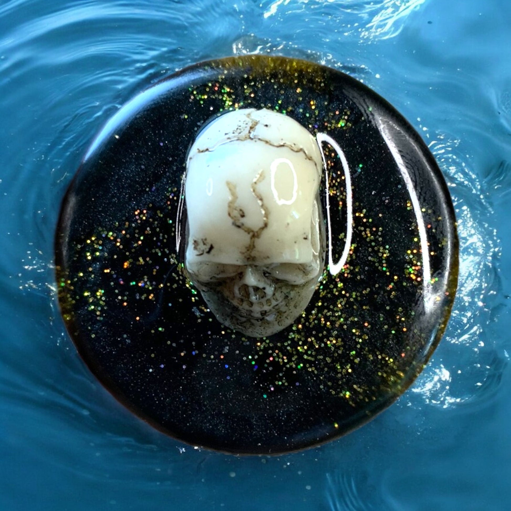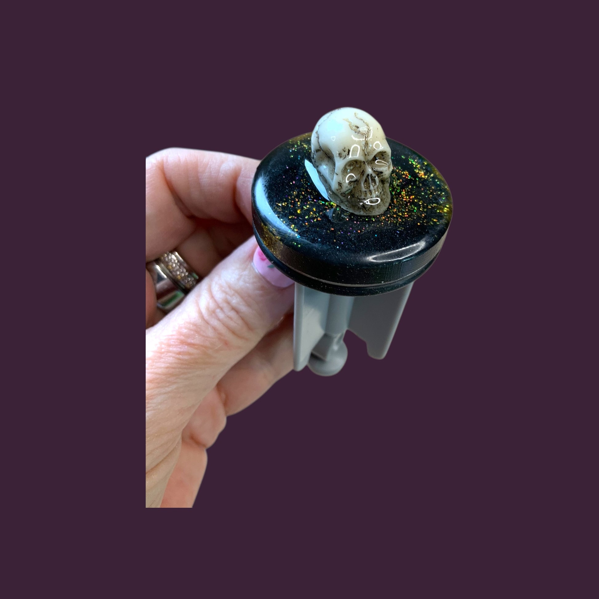 Für alle, die es mystisch mögen: Dieser kunstvoll gestaltete Waschbeckenstöpsel zeigt einen kleinen, fein gearbeiteten Totenschädel auf einem tiefschwarzen, schimmernden Hintergrund mit feinem Glitzer.