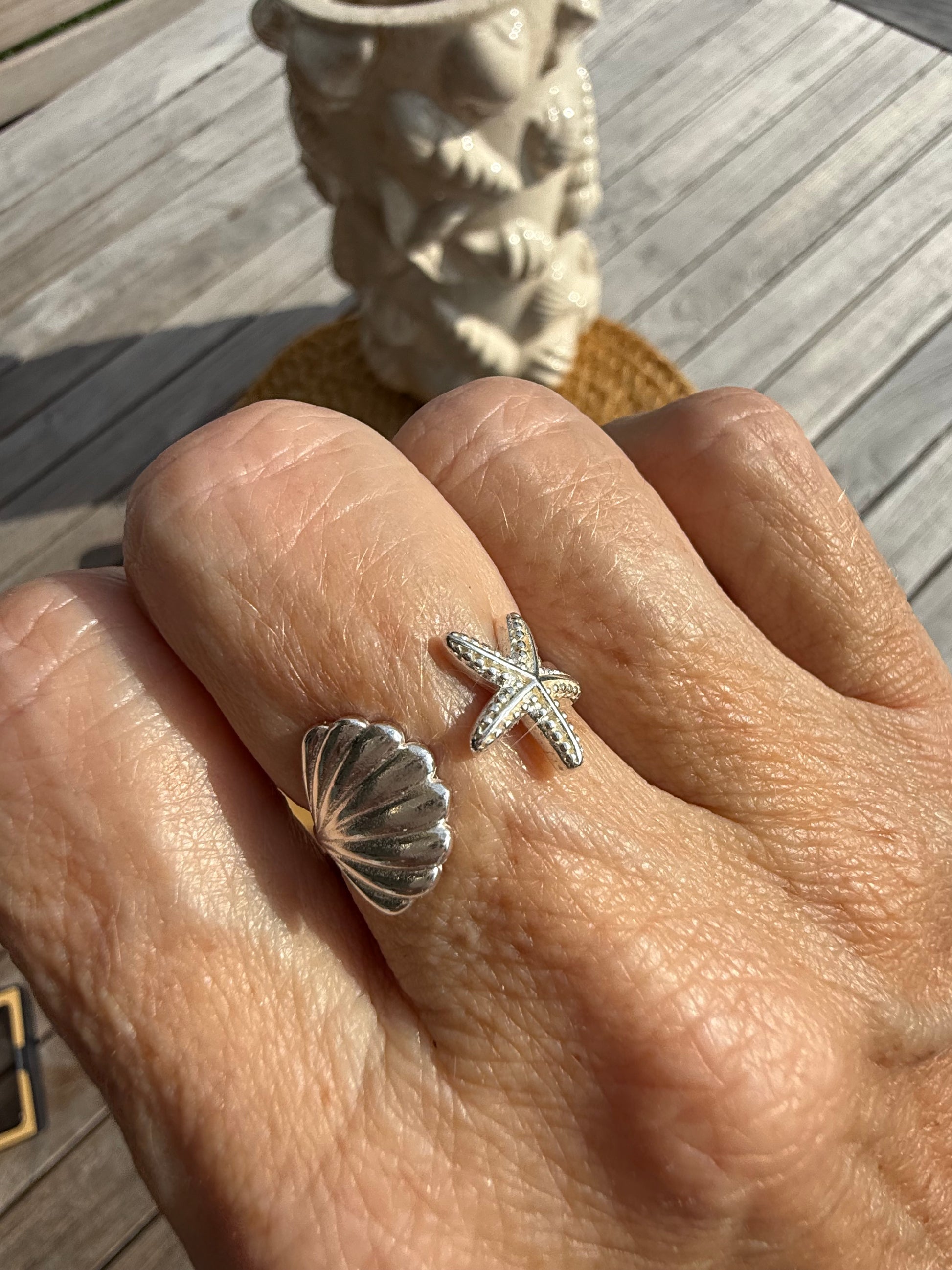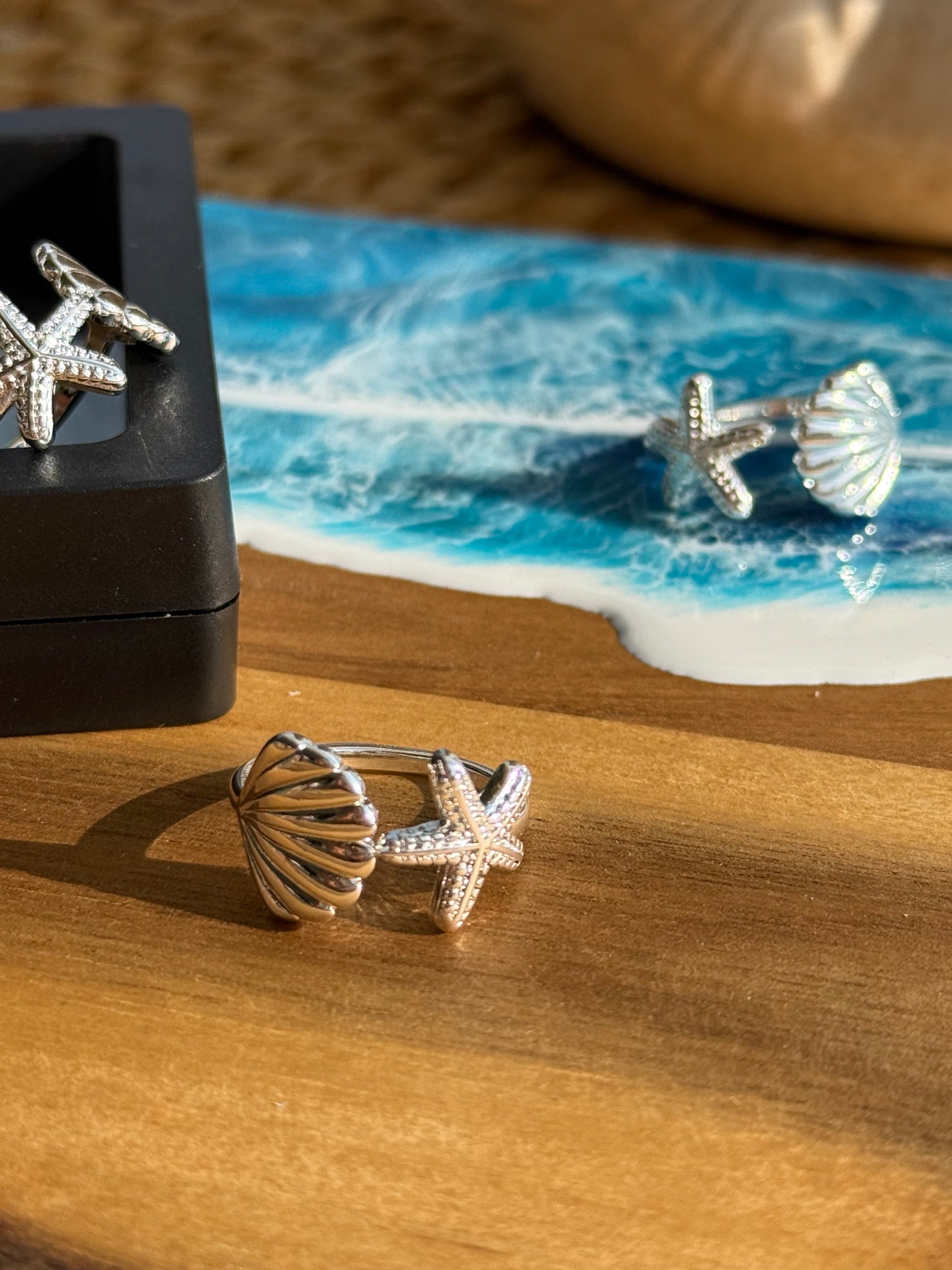 Gefertigt aus hochwertigem 925er Silber, zeigt er auf der einen Seite einen fein gearbeiteten Seestern und auf der anderen eine zarte Muschel – ein perfektes Duo für alle, die den Ozean lieben. 🌊