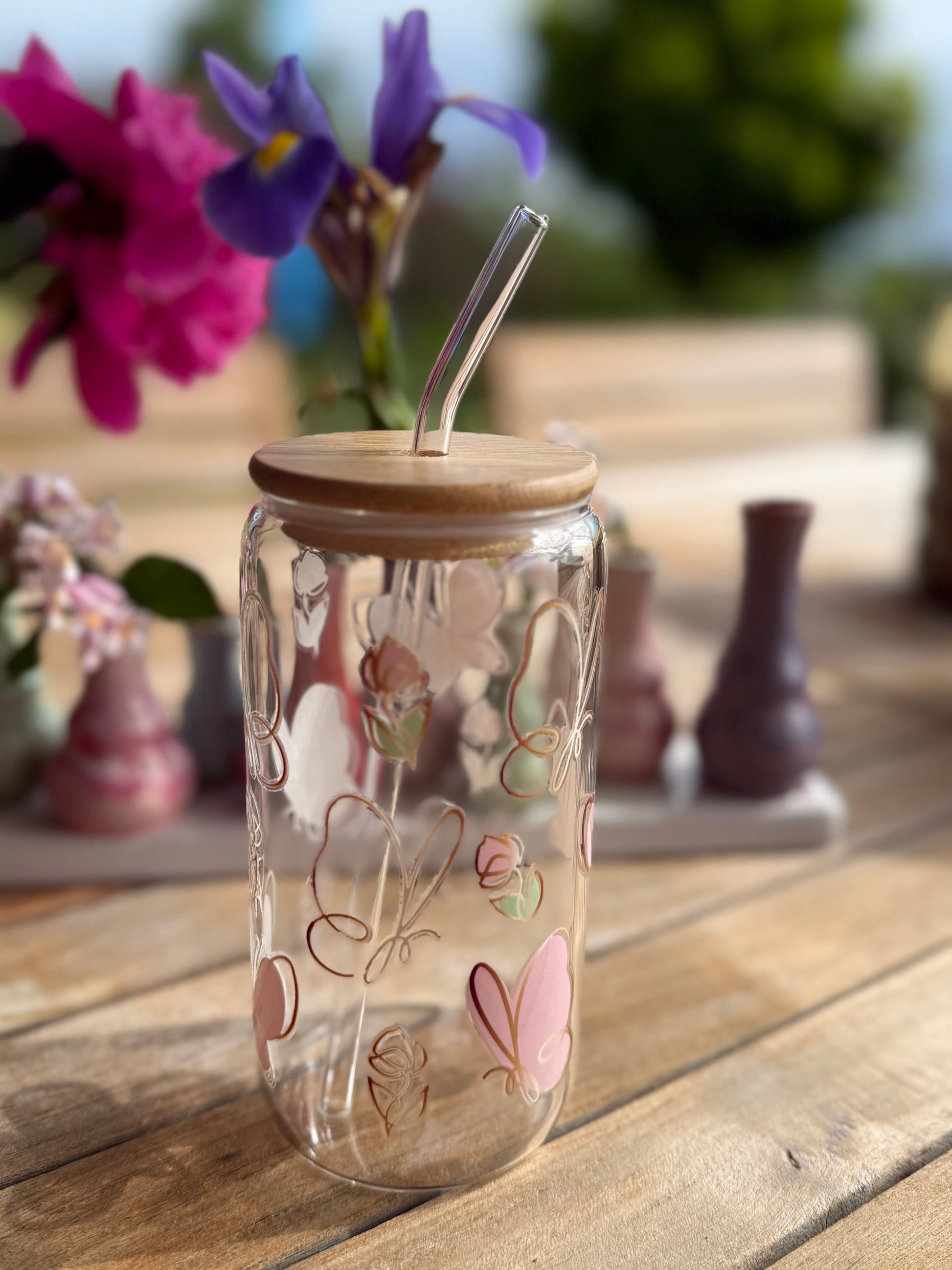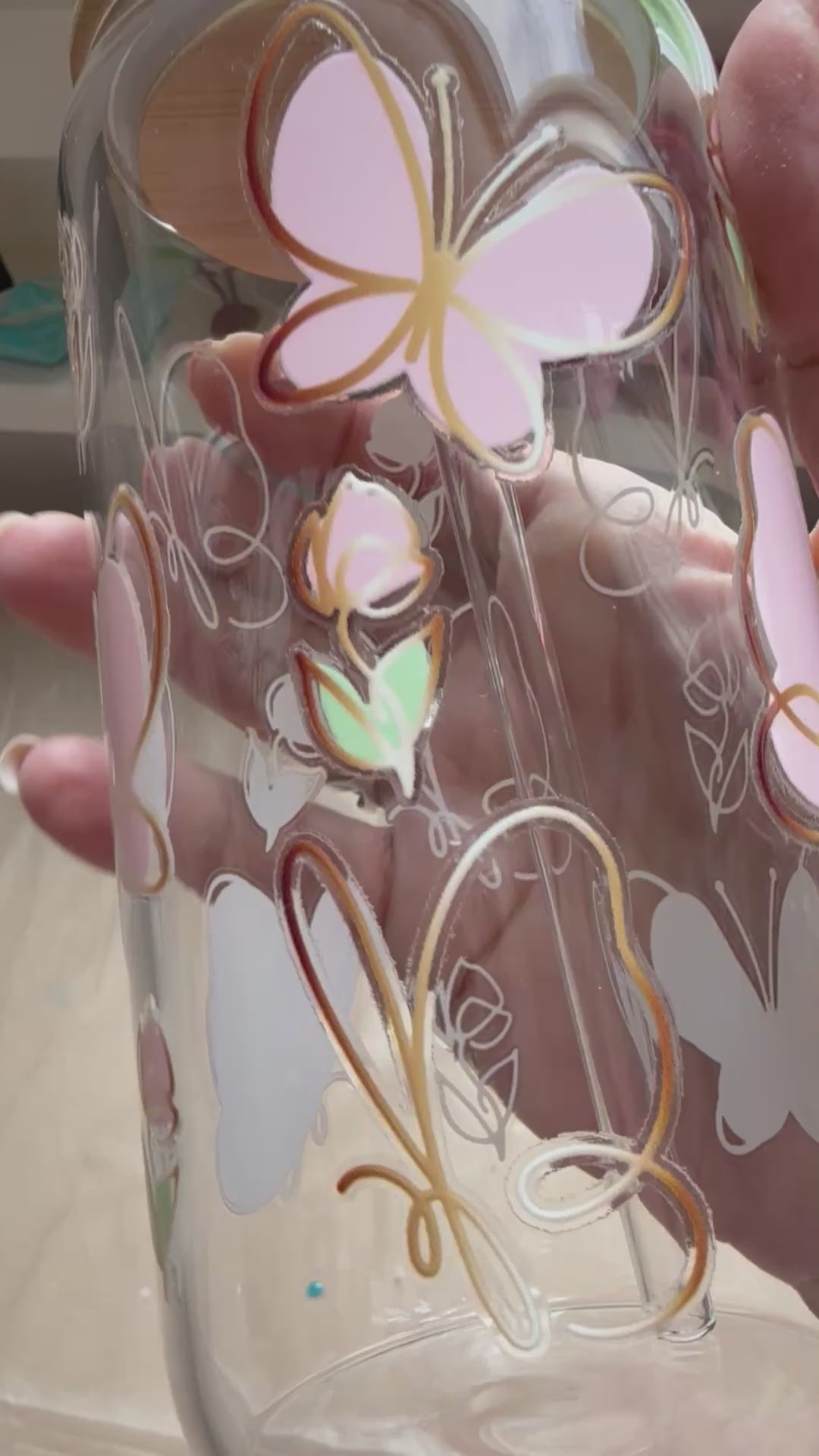 Federleicht flattern kleine Schmetterlinge rund um dein neues Lieblingsglas – in sanften Rosé-, Mint- und Goldtönen.