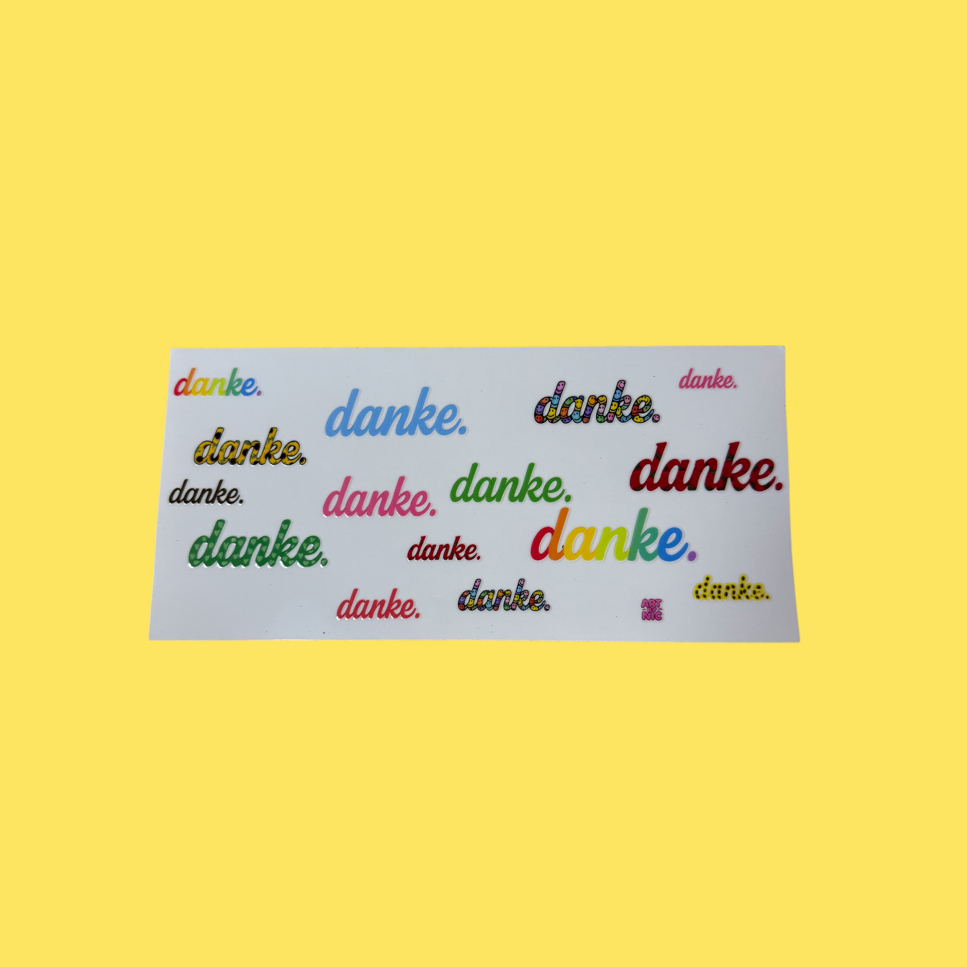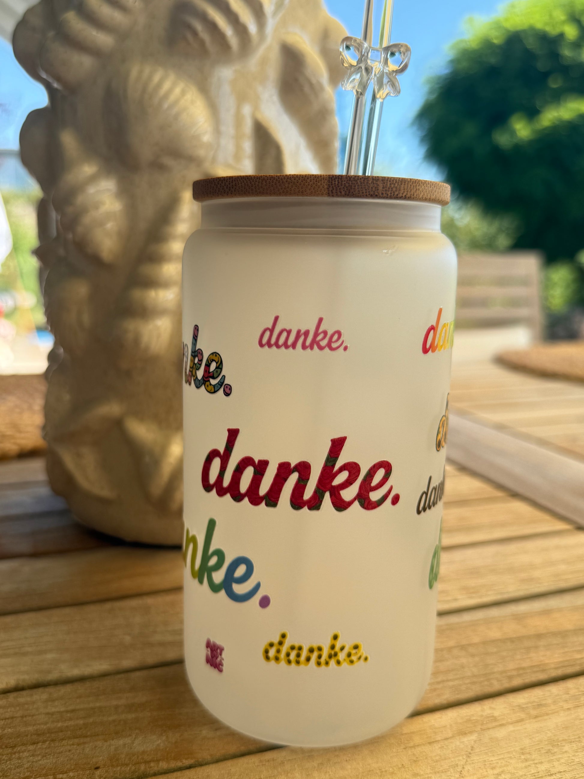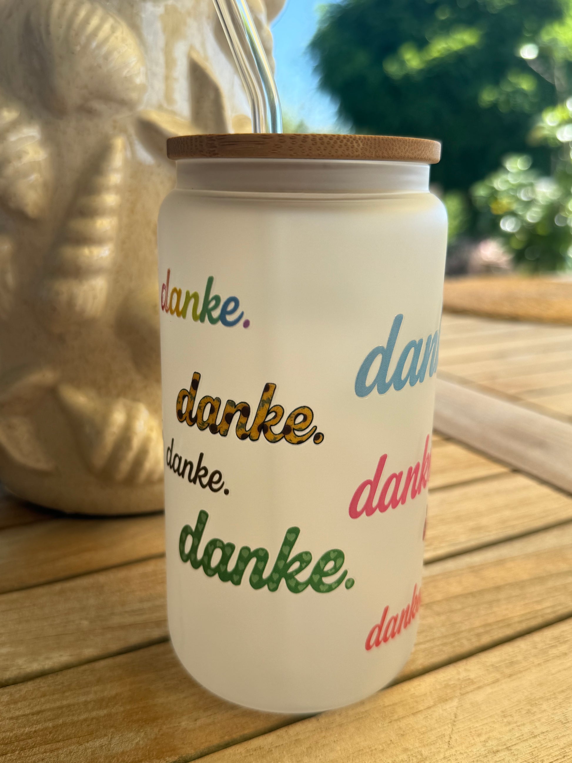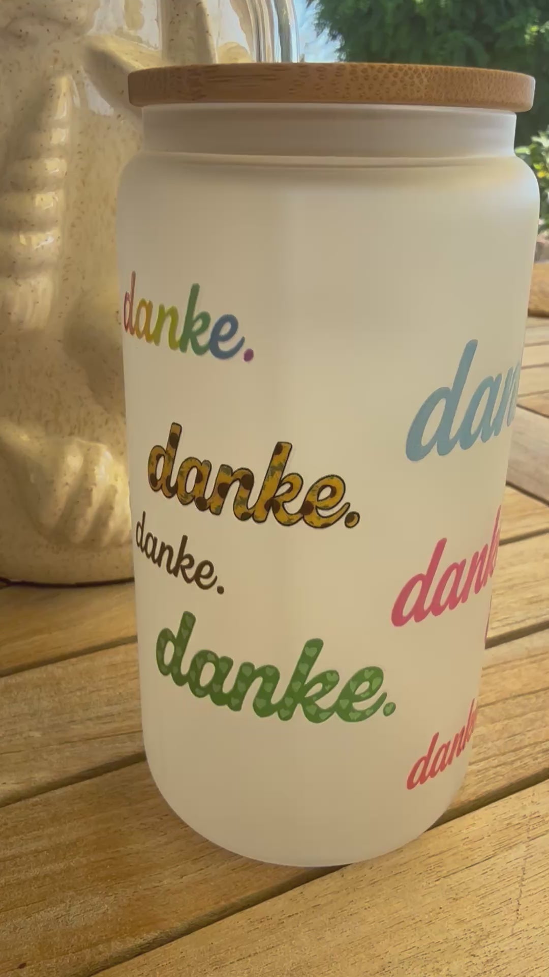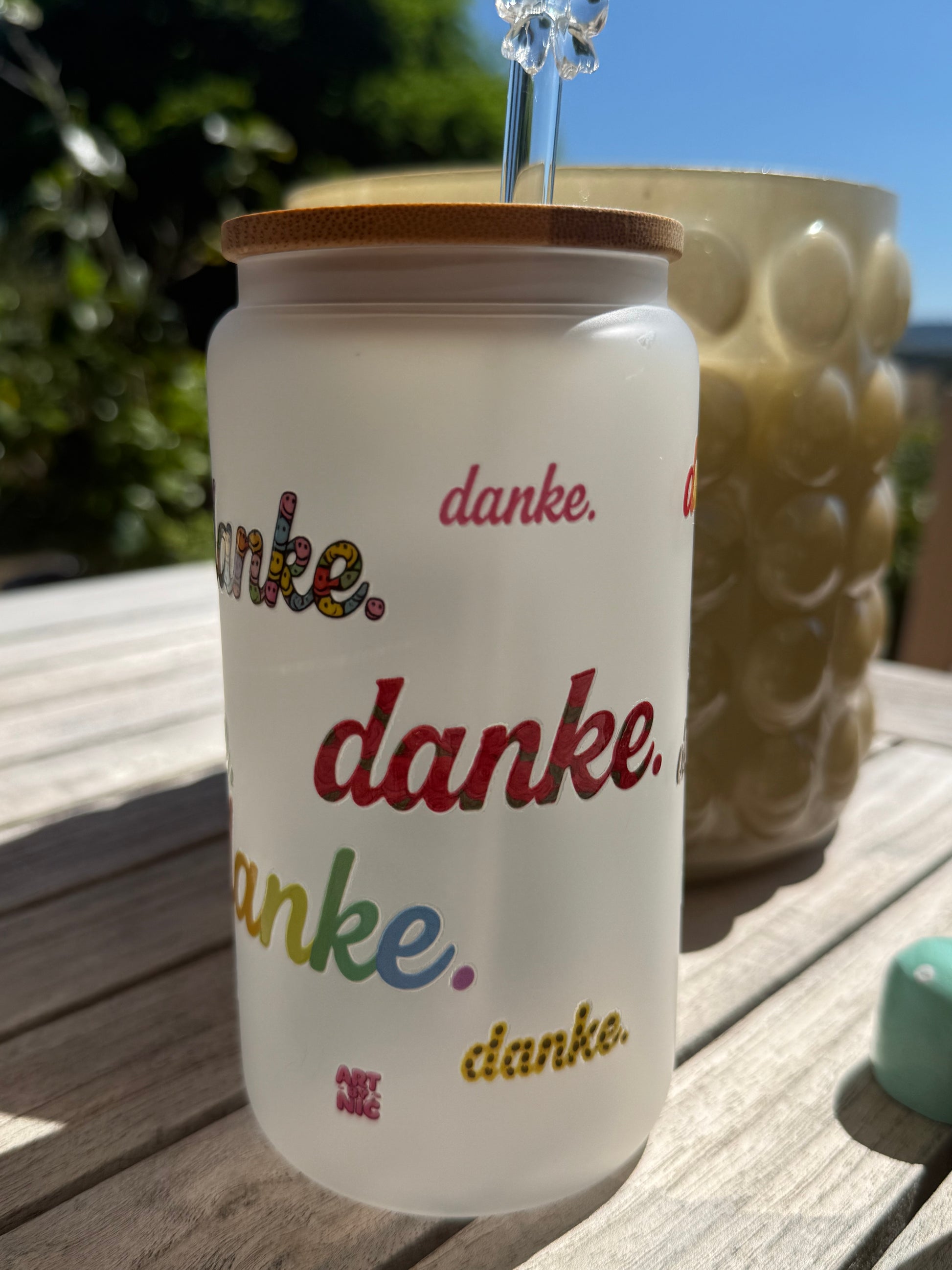 Das hochwertige, gefrostete Glas ist rundum verziert mit dem Wort „danke.“ in verschiedenen Farben, Schriftarten und Mustern – bunt, charmant und mit Herz gestaltet. Jedes Stück ist von Hand veredelt und trägt das liebevolle Handschrift-Design von Art by Nic.