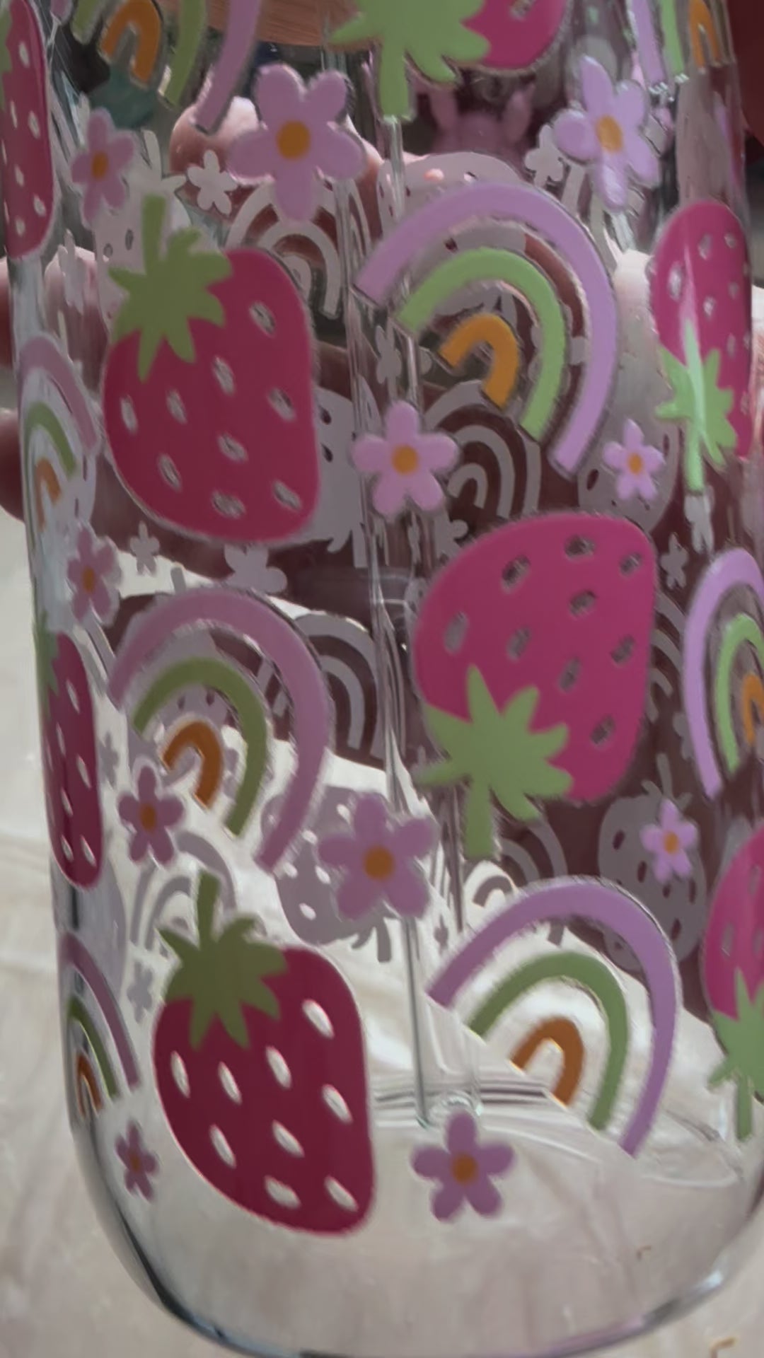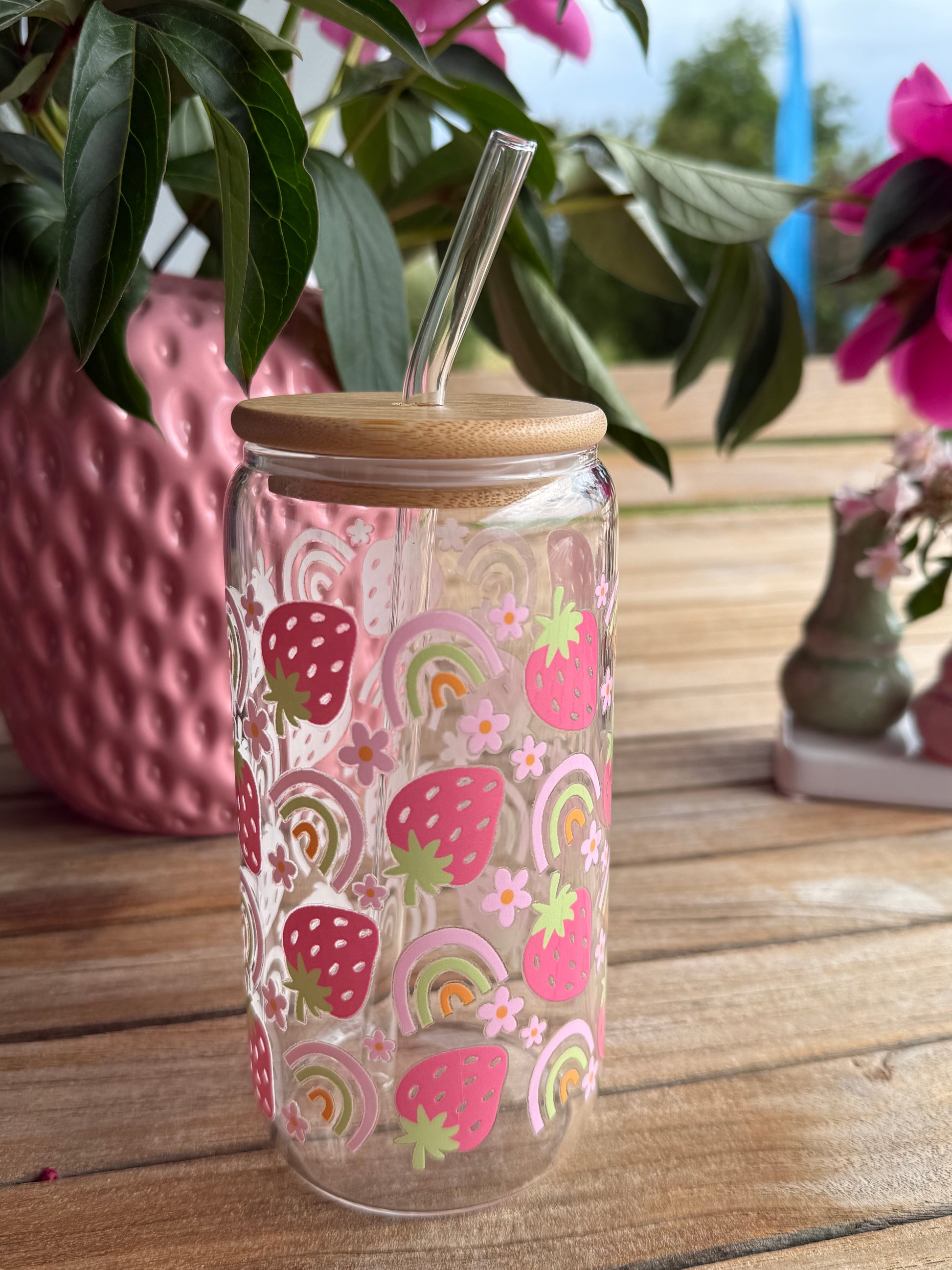 – Hochwertiges Glas mit süßem Erdbeer-, Blümchen- & Regenbogenprint