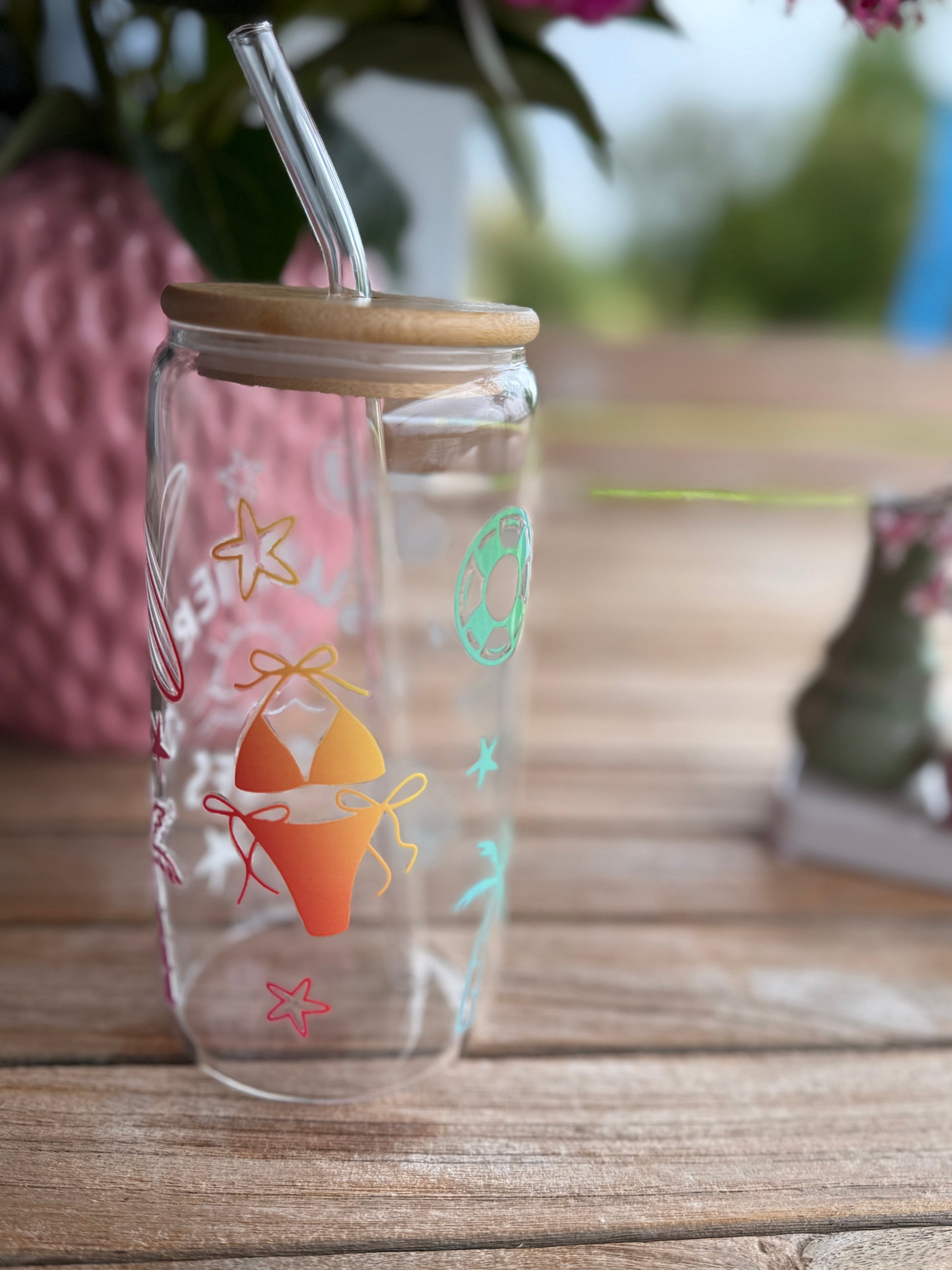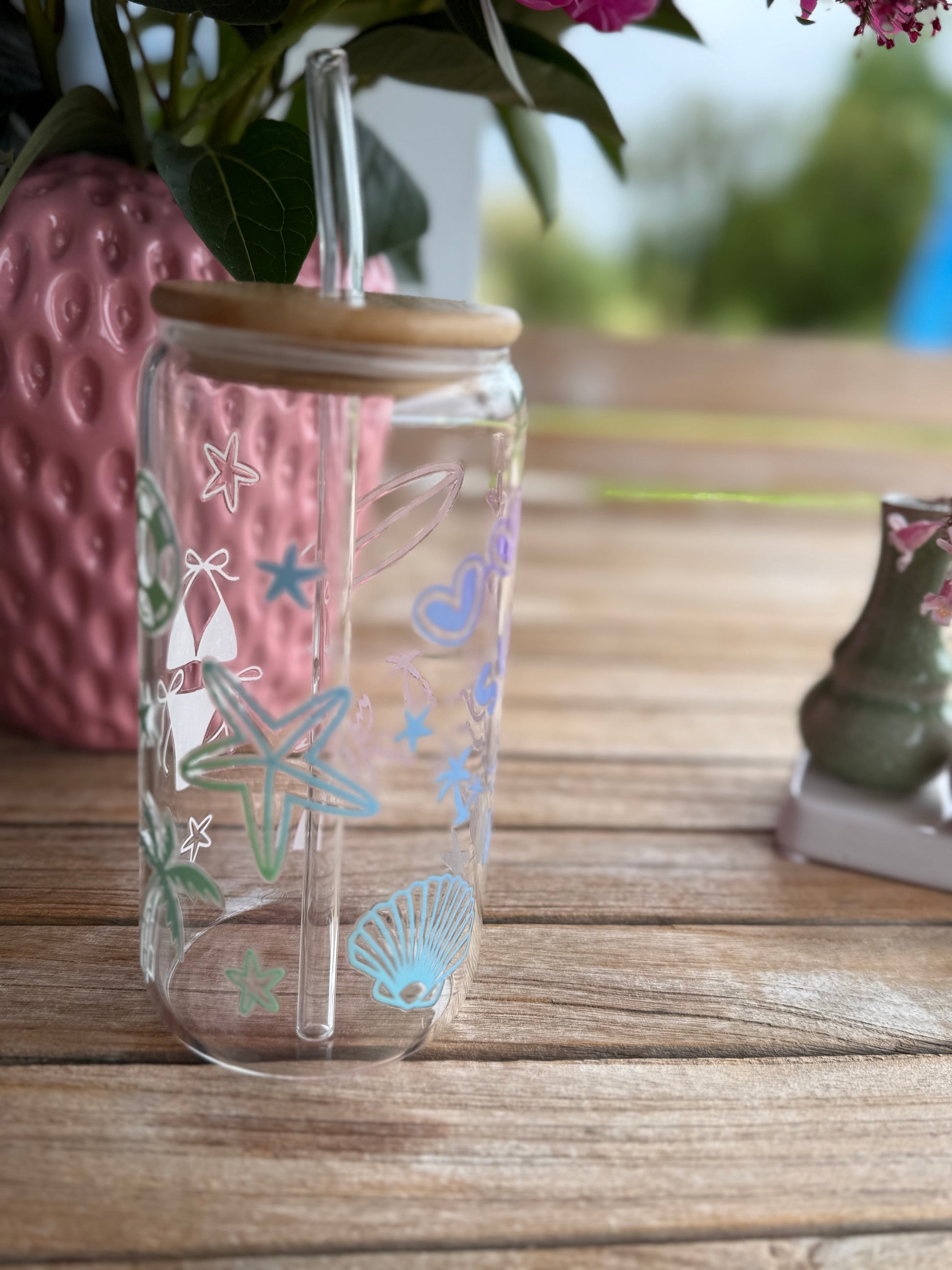 Das fröhliche Design zeigt bunte Motive wie Sonnenuntergang, Muscheln, Palmen, Herzchen, Sterne, ein Bikini und vieles mehr – alles liebevoll arrangiert rund ums Glas.