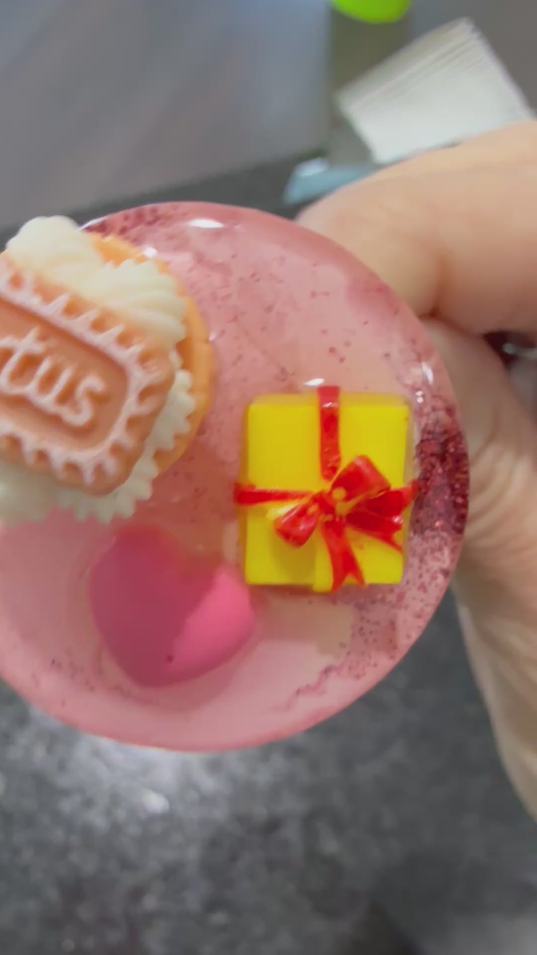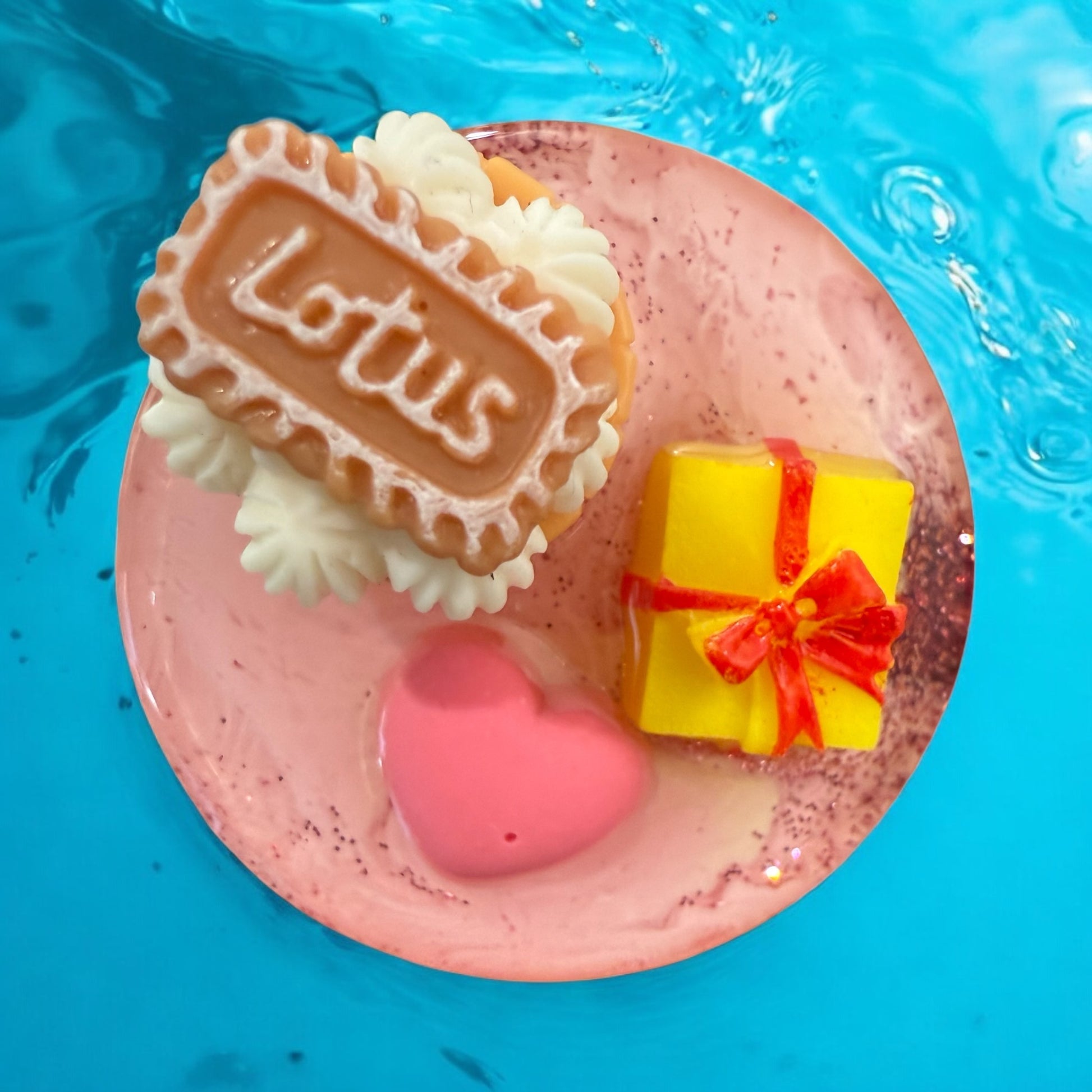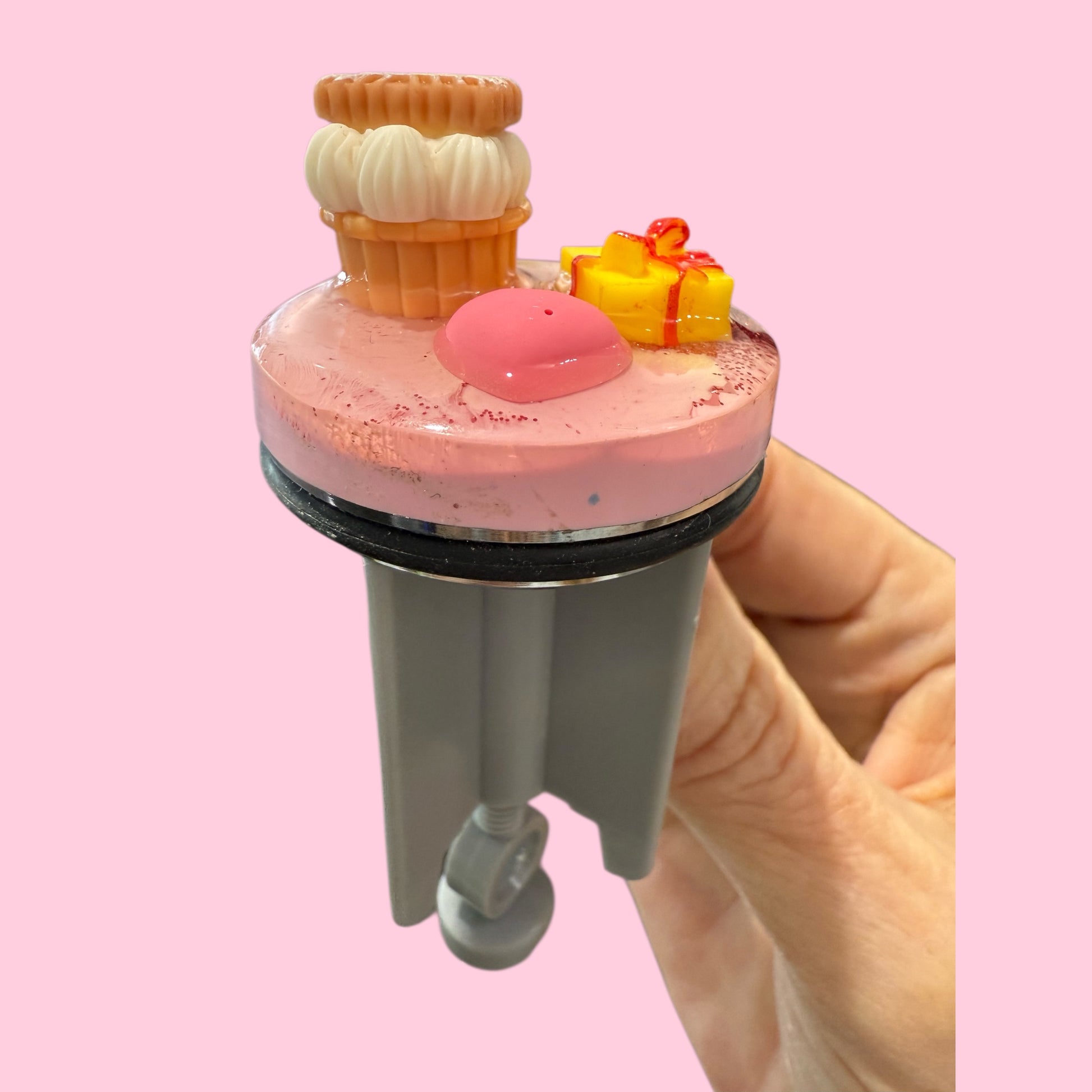 Dieser handveredelte 38 mm Waschbeckenstöpsel bringt pures Happy-Feeling in dein Badezimmer. Auf einer zart rosafarbenen Resinharzschicht mit feinem Glitzereffekt sitzen ein cremiger Lotus-Keks-Cupcake, ein süßes pinkes Herzchen und ein strahlend gelbes Geschenkpäckchen.