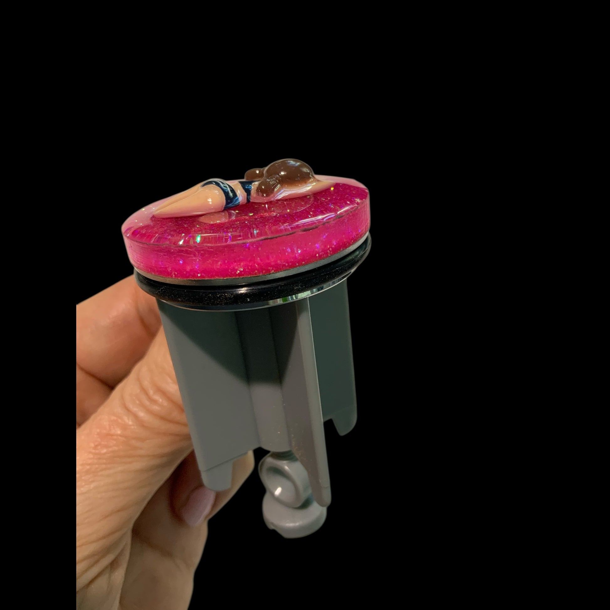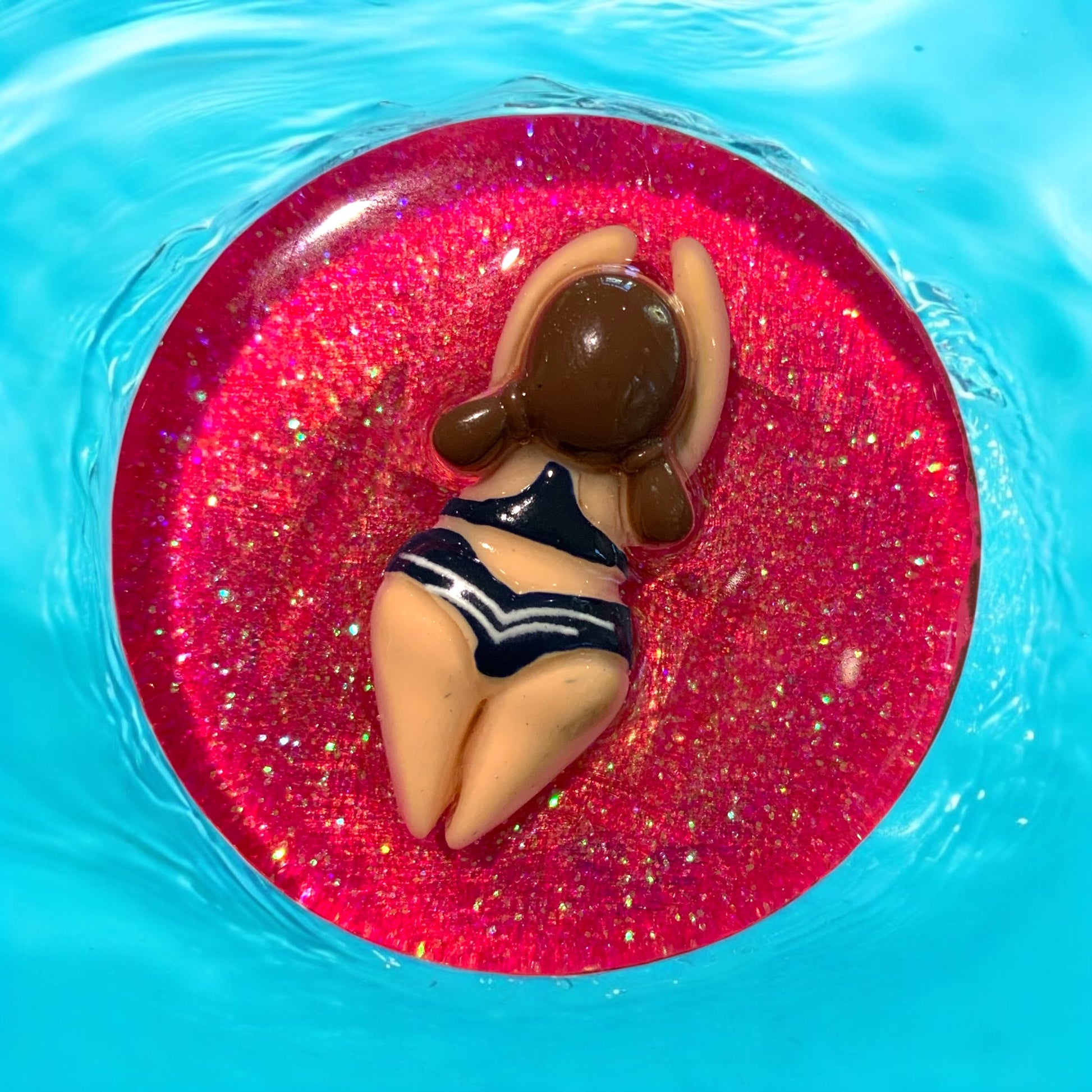 Dieser handveredelte Waschbeckenstöpsel ist ein echtes Glanzstück – mit einer kleinen Schwimmerin in dunkelblauem Bikini, die entspannt auf einem traumhaft pinkfarbenen, schimmernden Resin-Untergrund treibt.