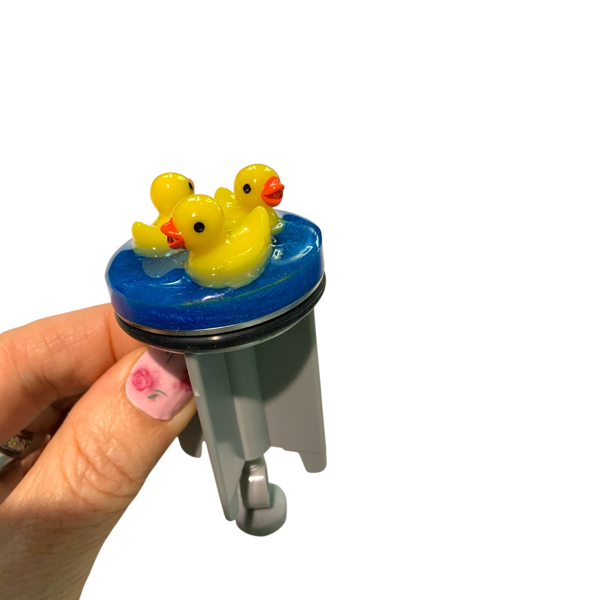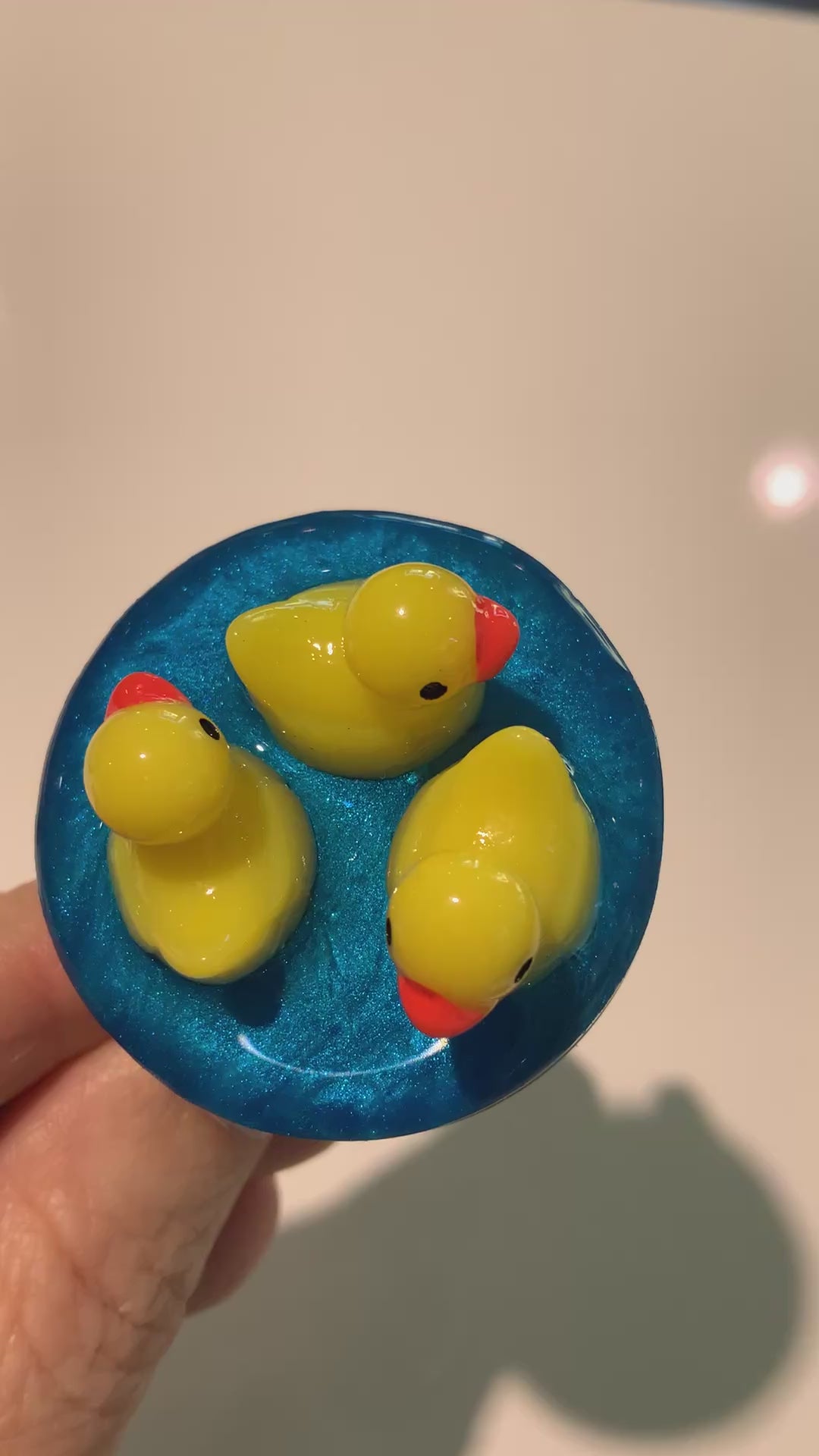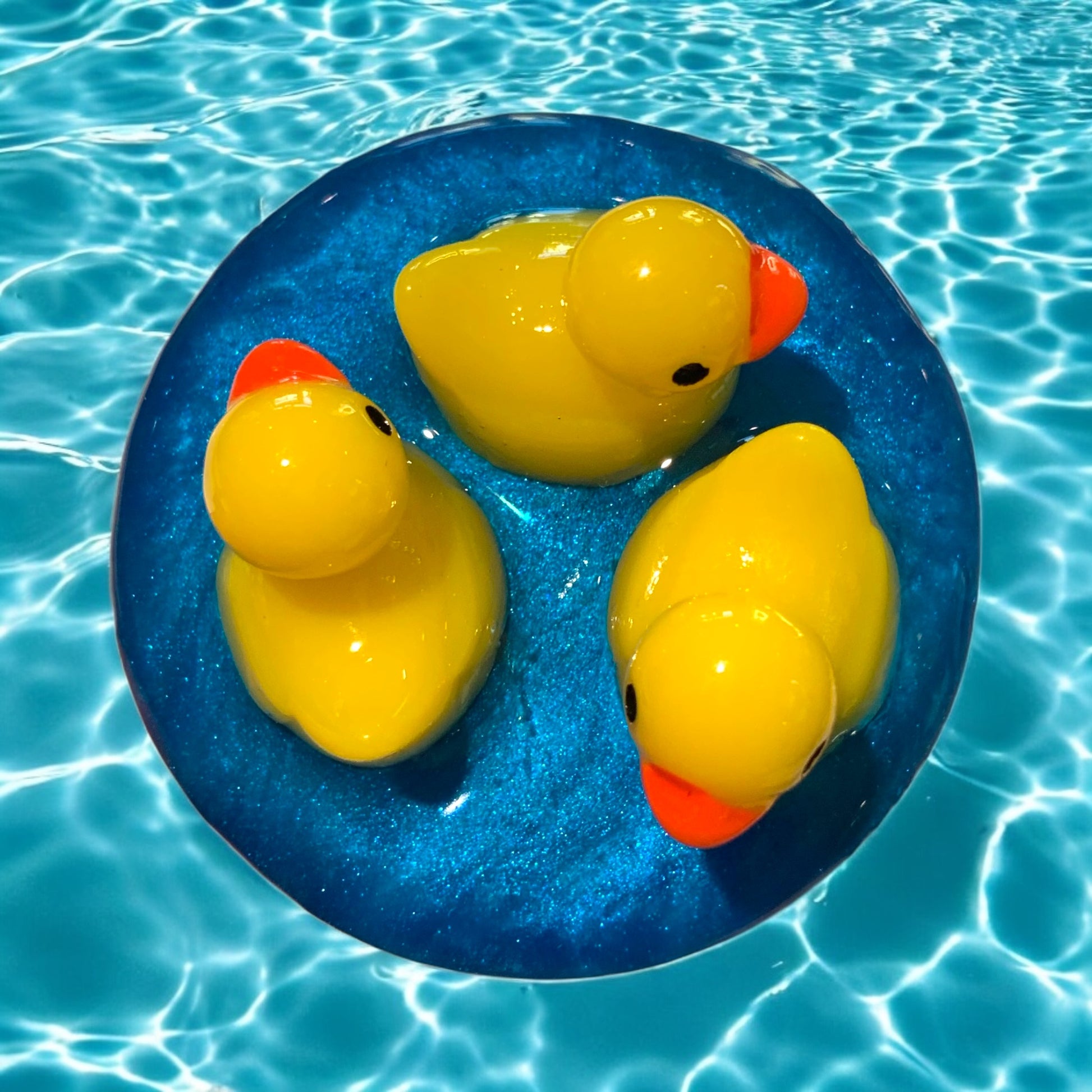 Dieser handveredelte Waschbeckenstöpsel bringt mit seinen niedlichen gelben Entlein auf schimmerndem blauem Resin-Untergrund pure Badefreude und ein Lächeln in deinen Alltag.
