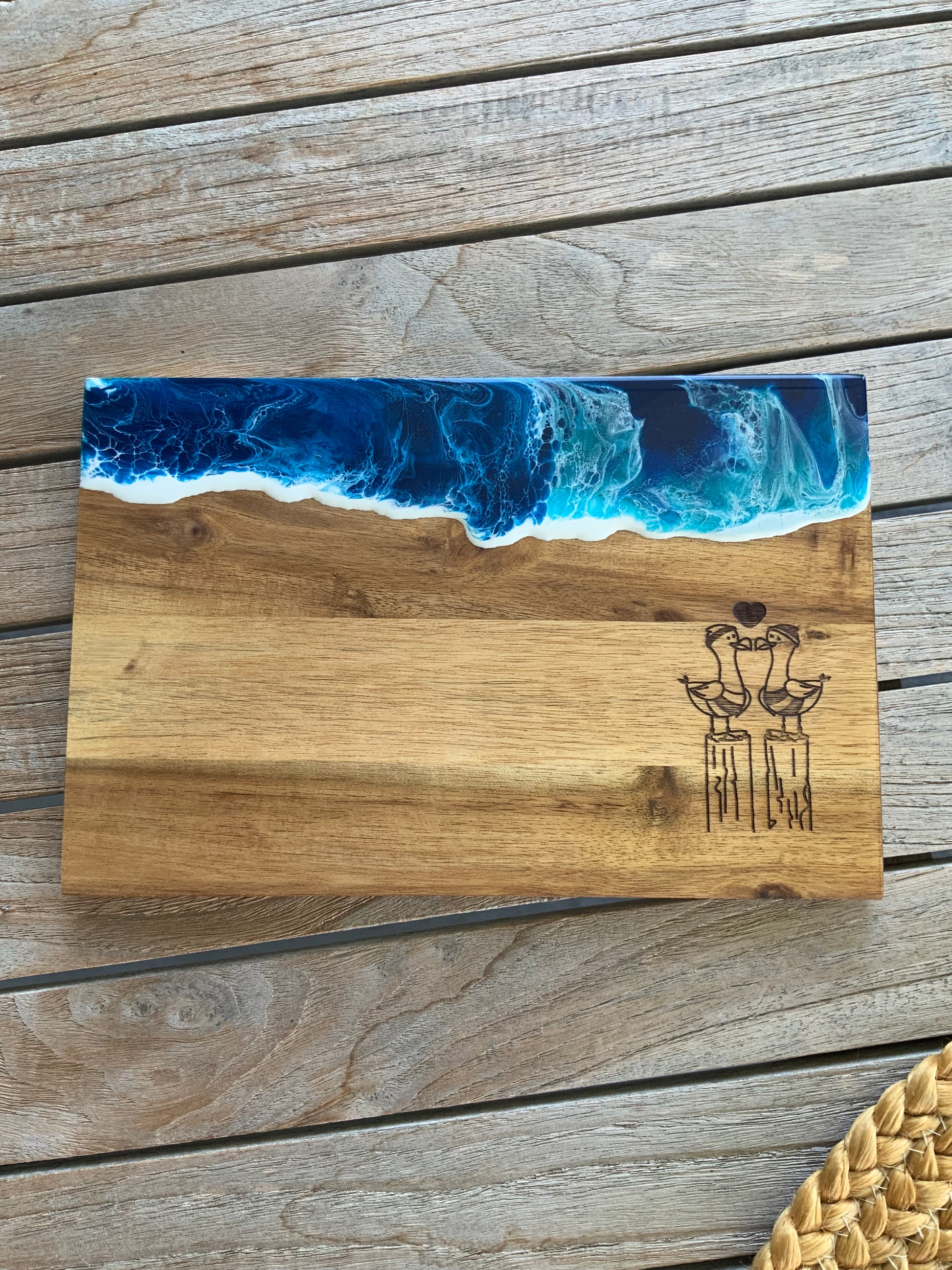 Servierbrett „Ocean Love“ aus Akazienholz – mit Resin Art & Möwen-Gravur