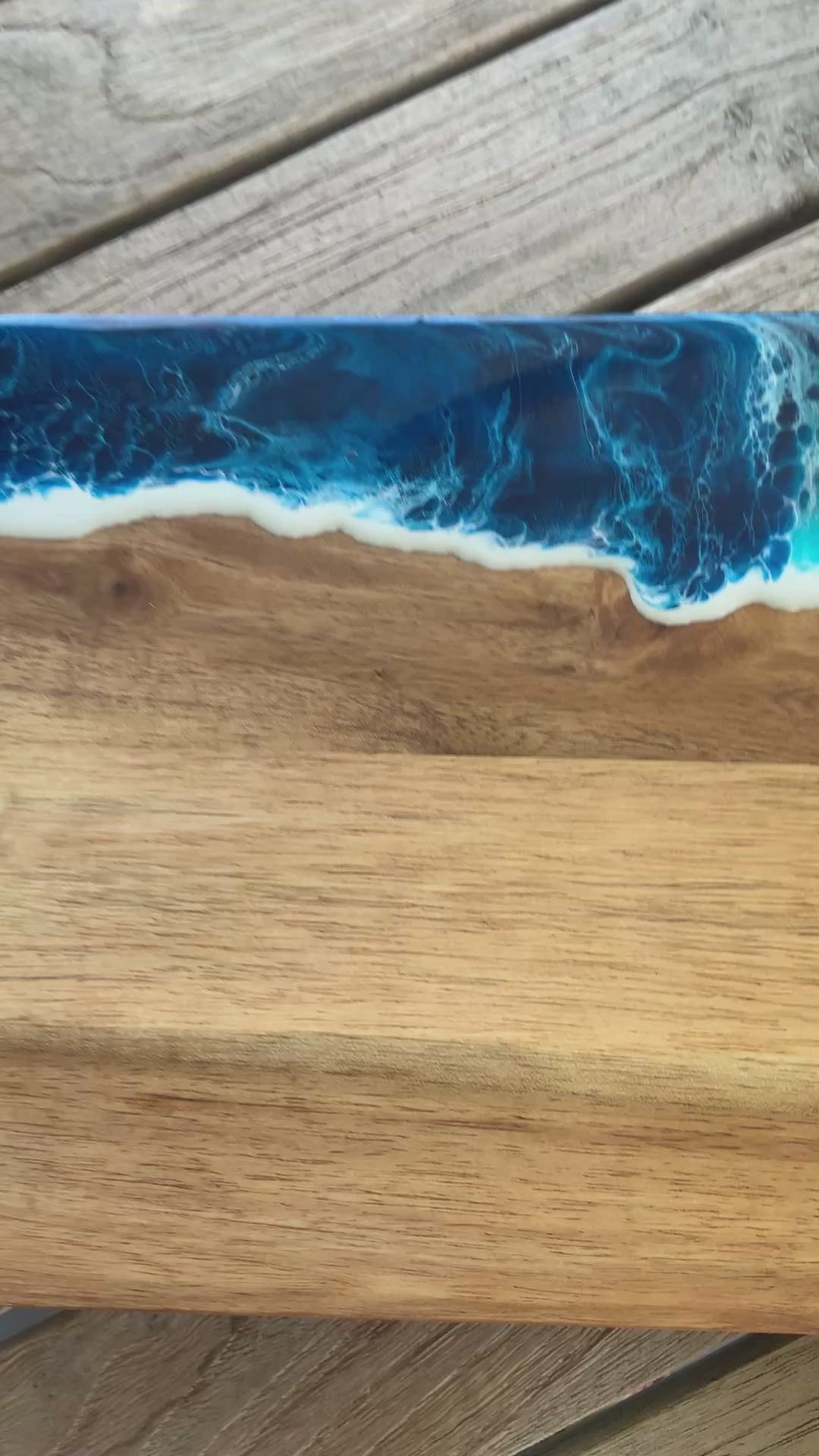 Dieses liebevoll gestaltete Servierbrett bringt maritimes Flair auf deinen Tisch. Die obere Kante ist von Hand in einem einzigartigen Ocean-Art-Design mit Resin-Harz veredelt – jede Welle ist ein Unikat!