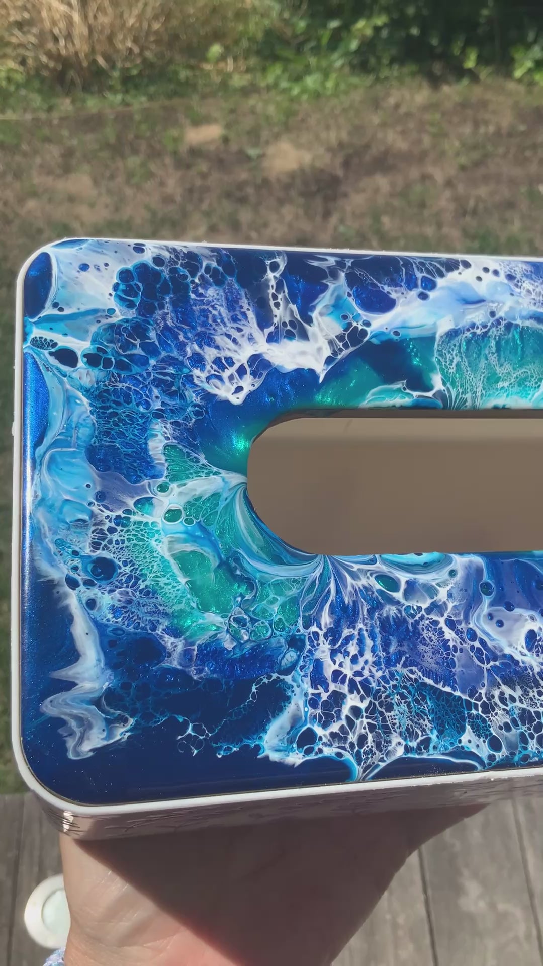 Der Deckel wurde von mir mit viel Liebe zum Detail in einem einzigartigen Ocean Art Stil veredelt – mit Resin gegossen und in schimmernden Blau- und Türkistönen gestaltet.