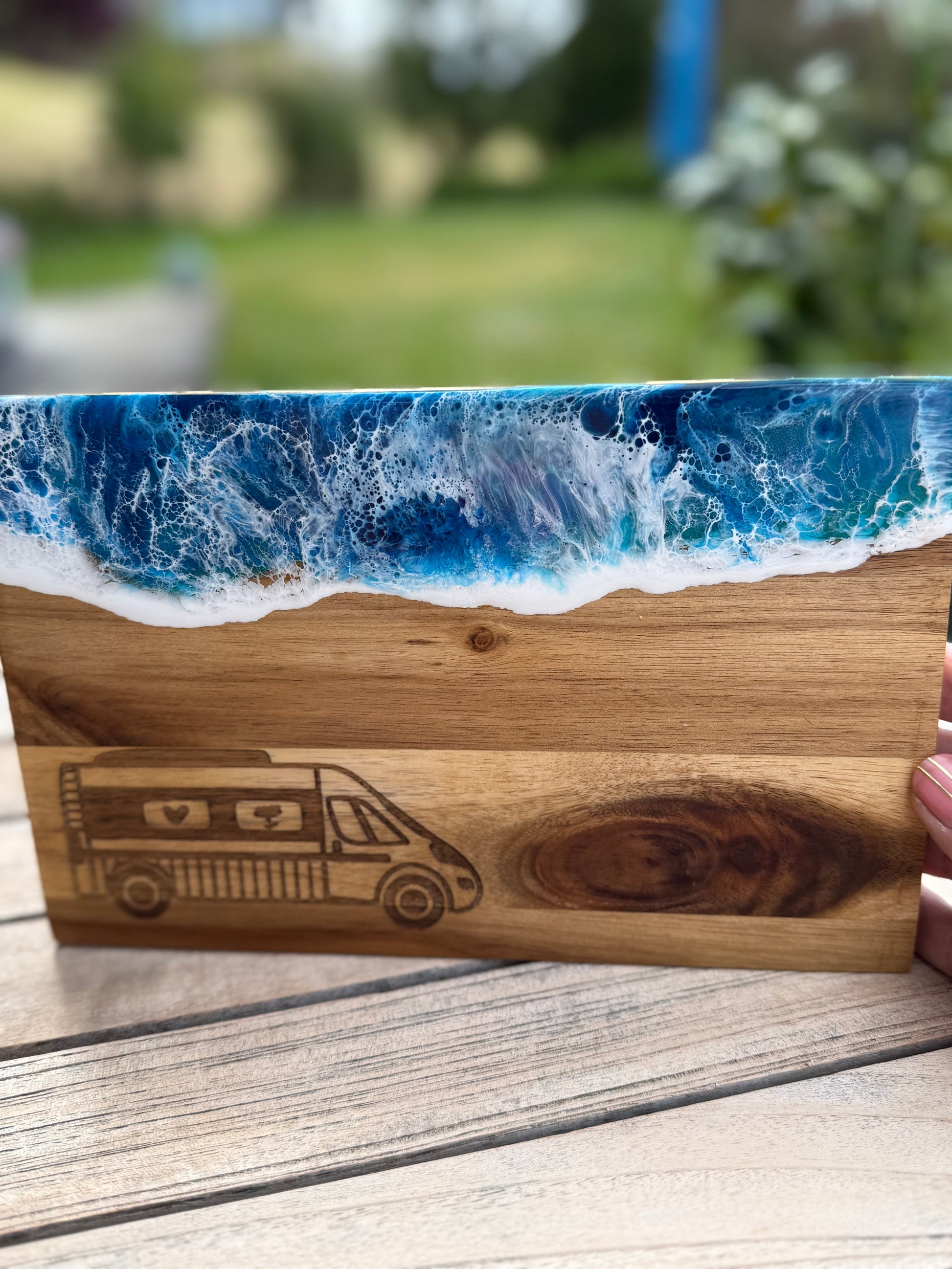 „Vanlife Vibes – Frühstücksbrett mit Ocean Design & Camping-Motiv“