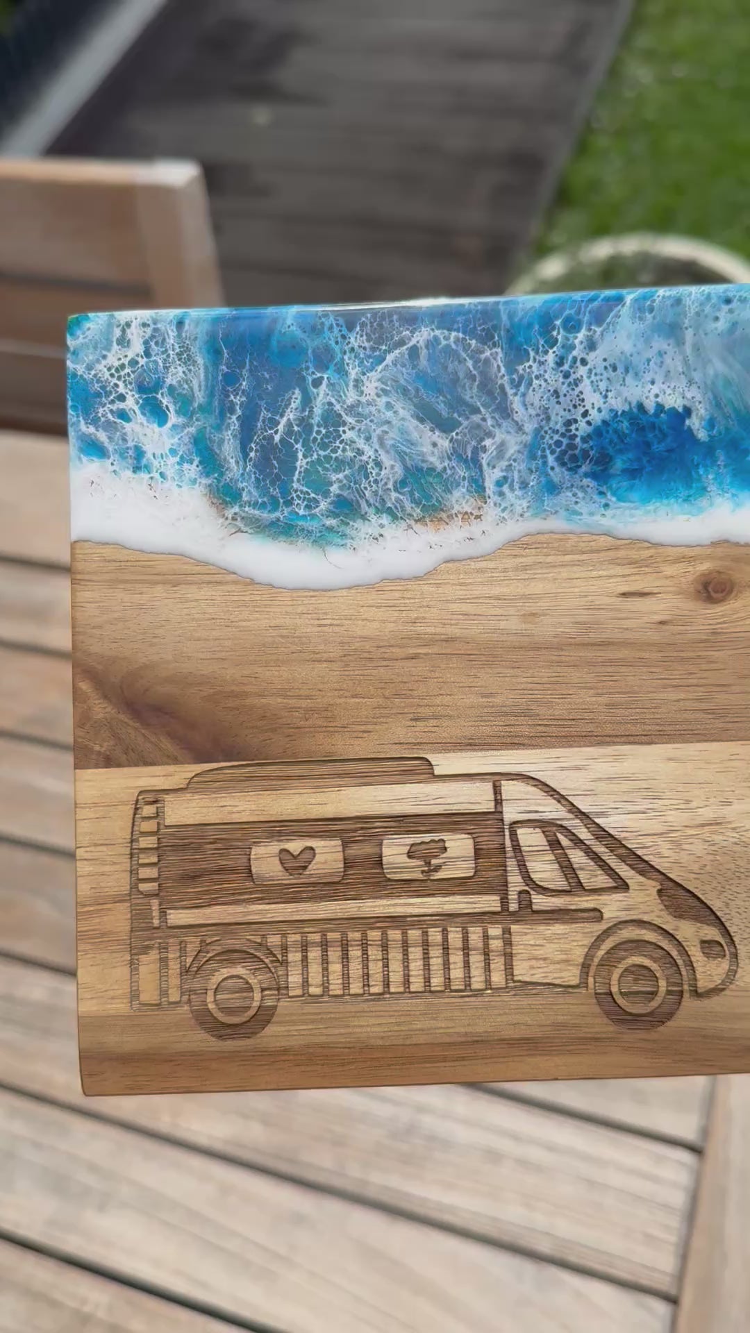 Die eingearbeitete Lasergravur zeigt einen charmanten Camper-Van – bereit für das nächste Abenteuer am Meer.
