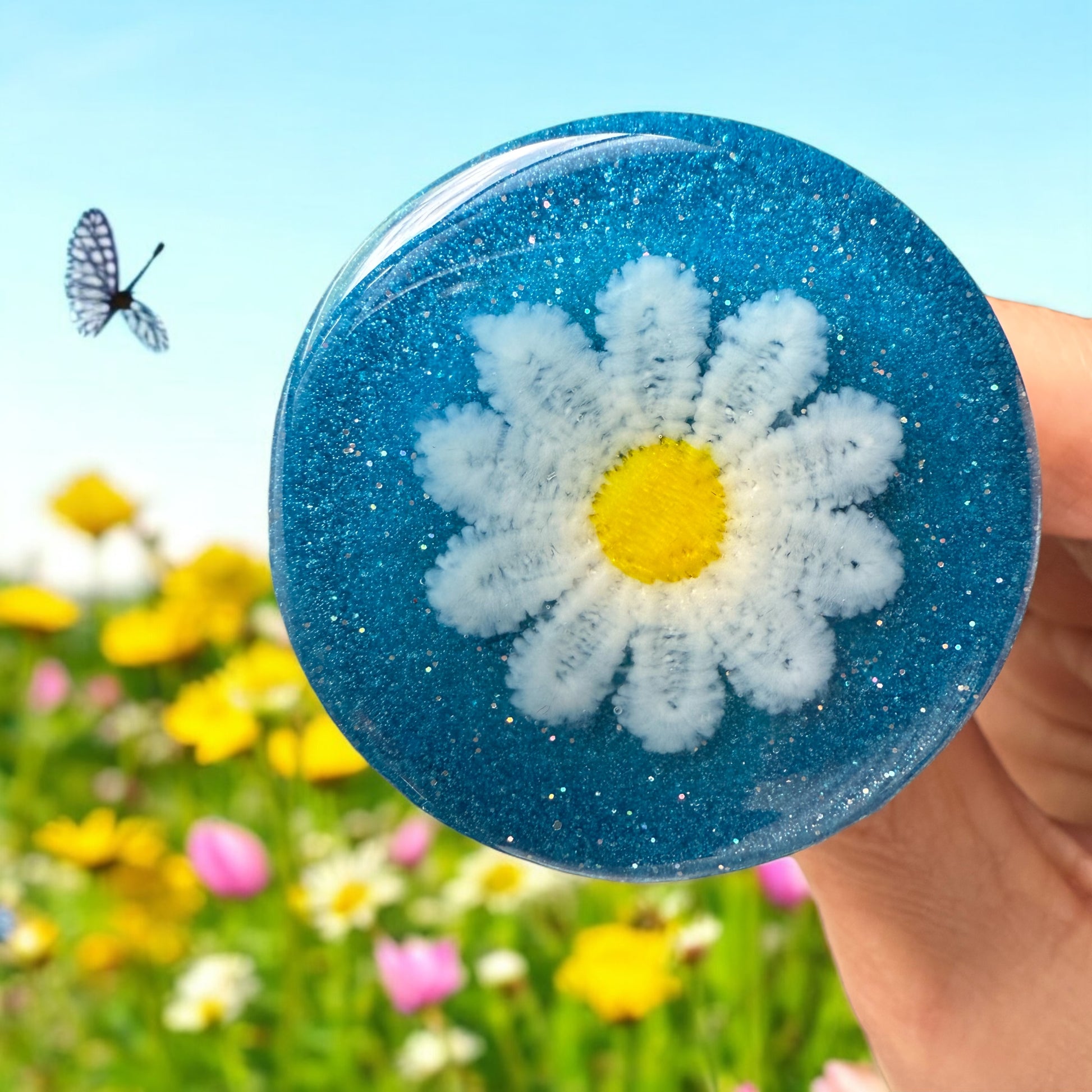Bring dir den Sommer ins Badezimmer – mit diesem einzigartigen handveredelten Waschbeckenstöpsel. In sorgfältiger Handarbeit wurde eine zarte Stoffmargerite in glasklares, glitzerndes Resin eingebettet und auf himmelblauem Untergrund zum Strahlen gebracht.