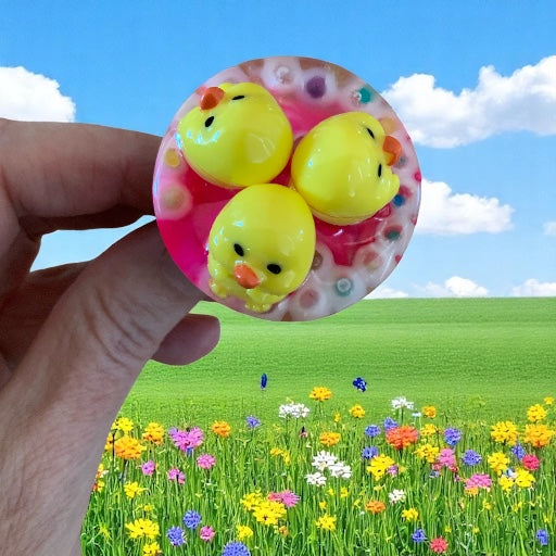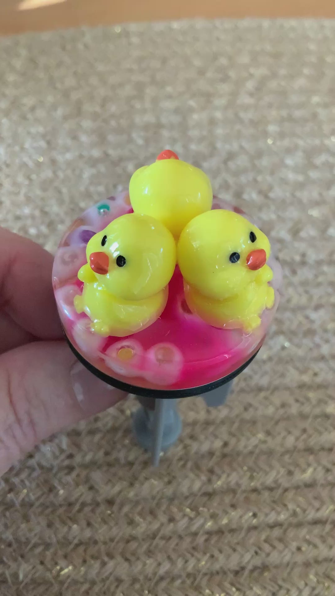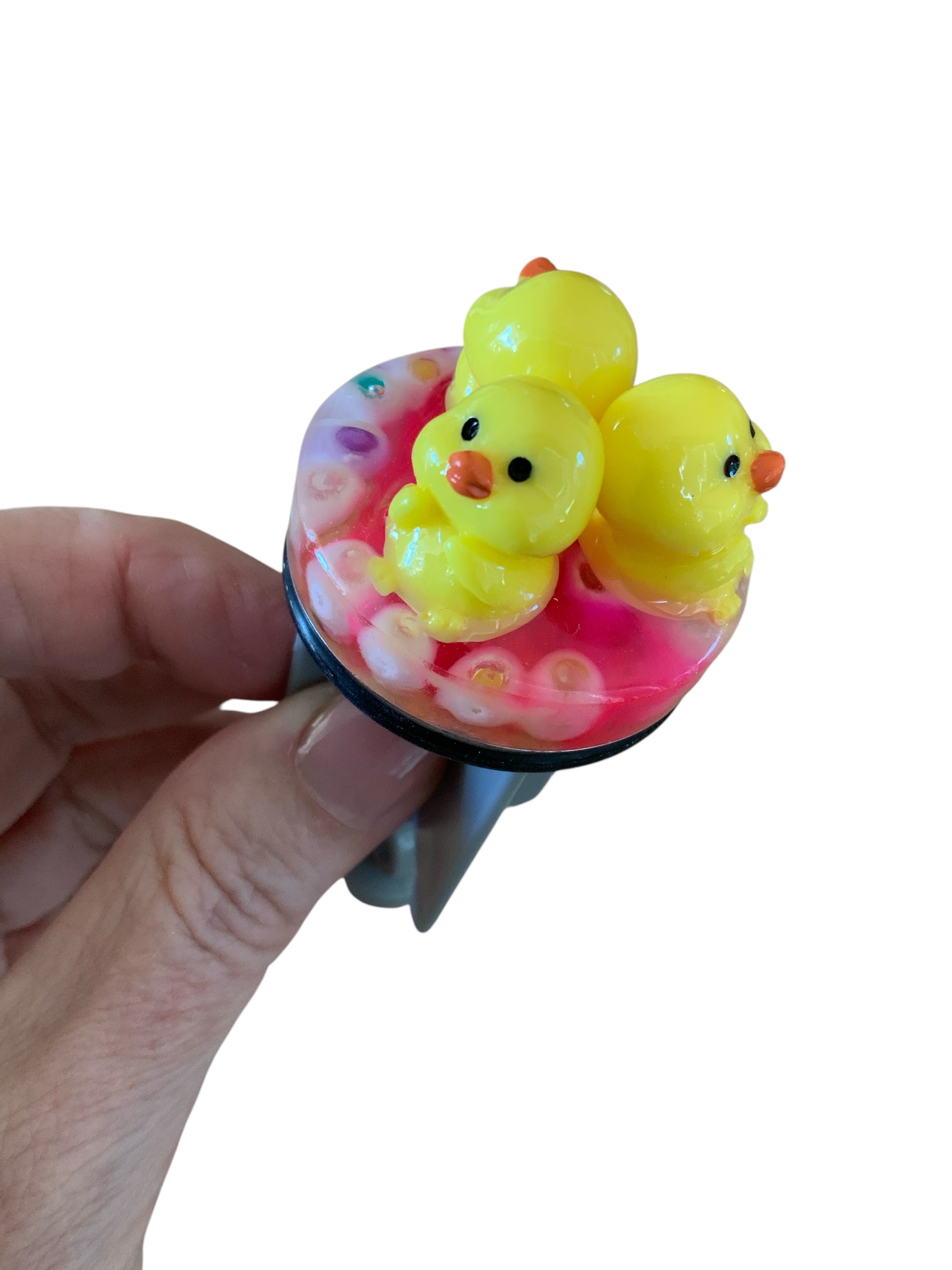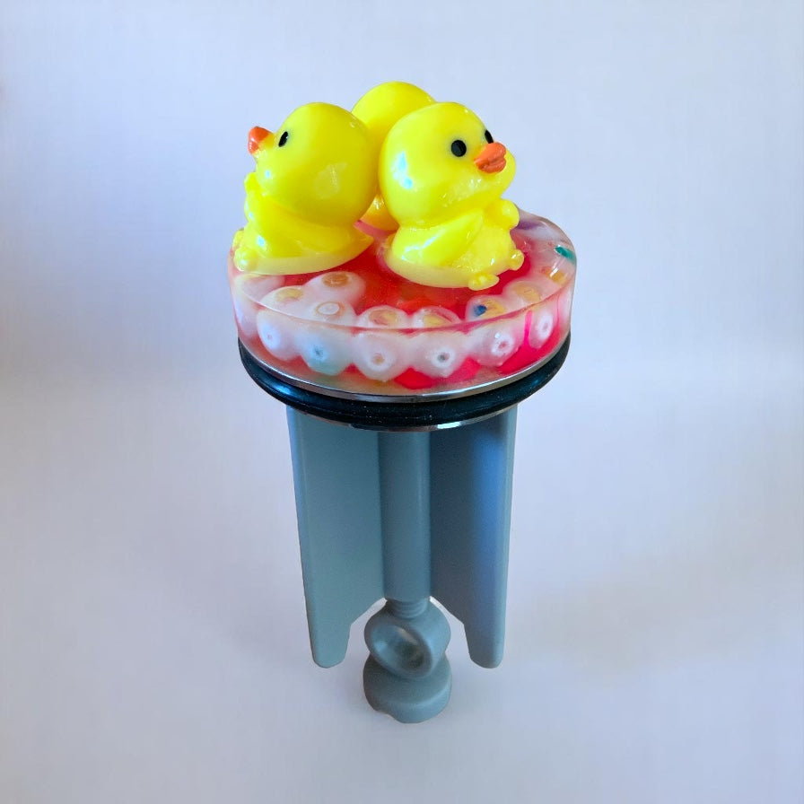 Dieser handveredelter Waschbeckenstöpsel ist ein echtes Unikat: In liebevoller Detailarbeit sind drei kleine, gelbe Entchen in pinkfarbenem Resin eingebettet – umgeben von schimmernden Akzenten in Pastellfarben.