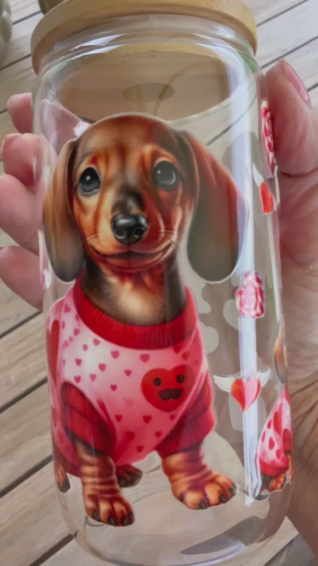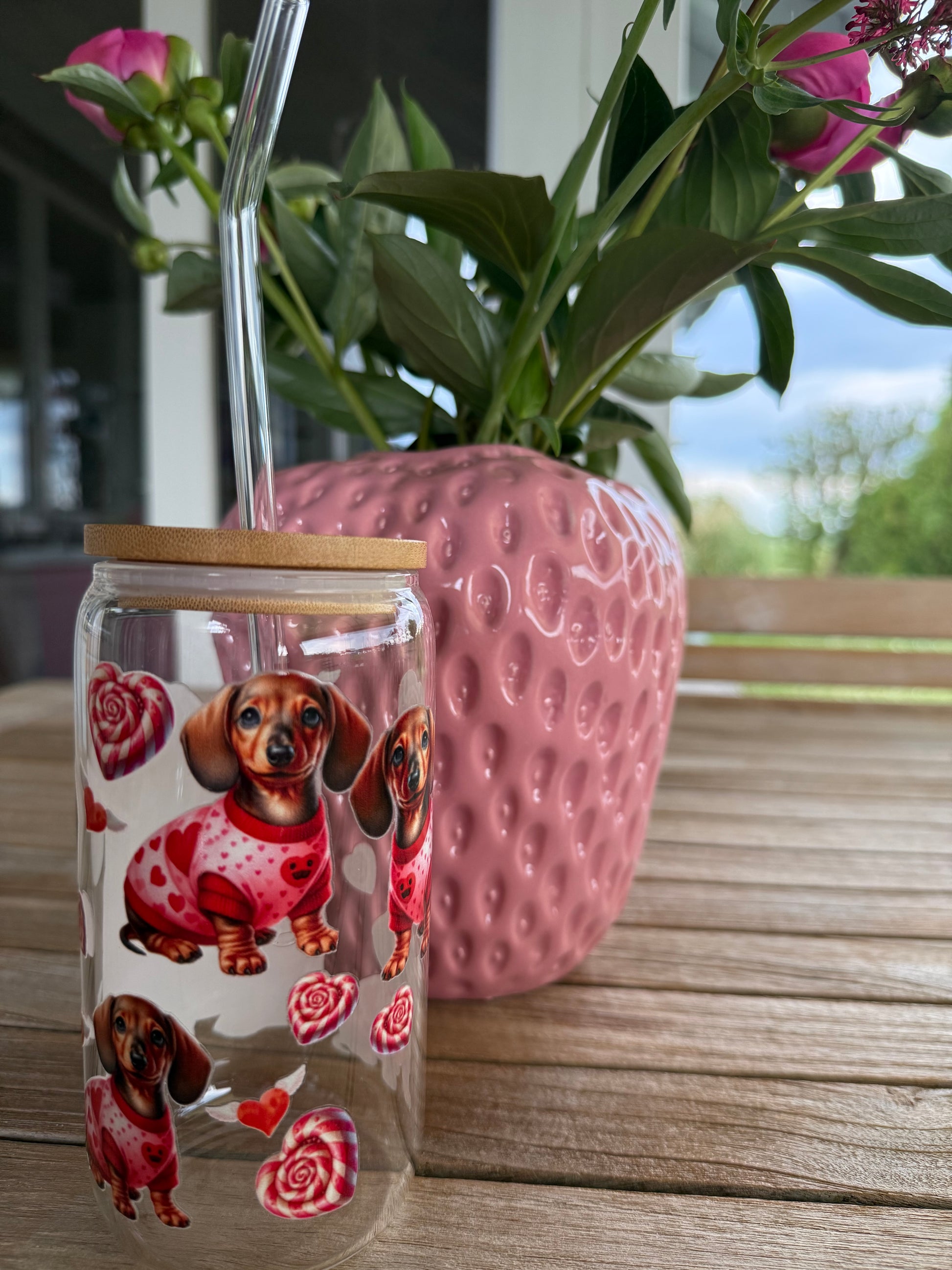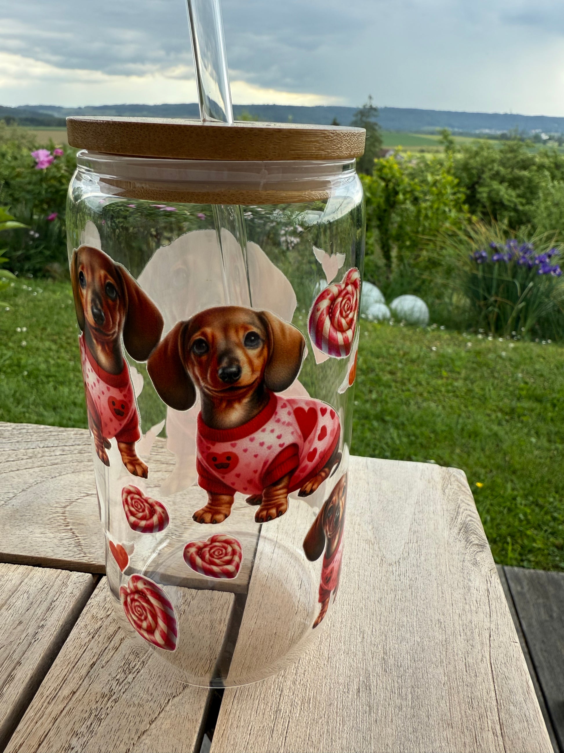 Wiederverwendbares Trinkglas mit Dackel-Motiv – 470 ml | Herziger Dackel | Mit Bambusdeckel & Glasstrohhalm