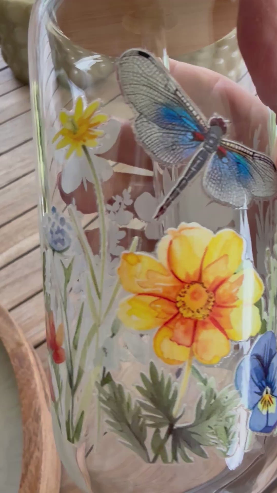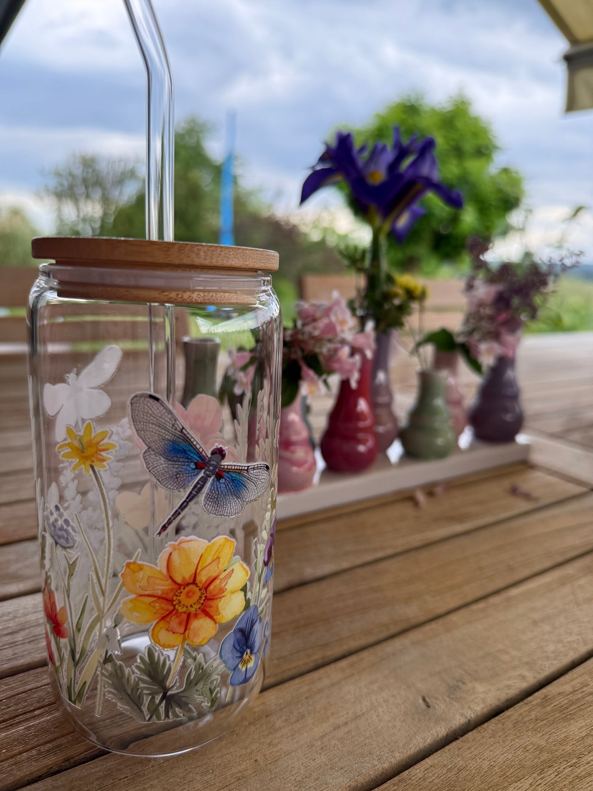 Bring die Blumenwiese direkt auf deinen Tisch – mit diesem traumhaft schönen Design-Trinkglas, liebevoll von Hand veredelt!