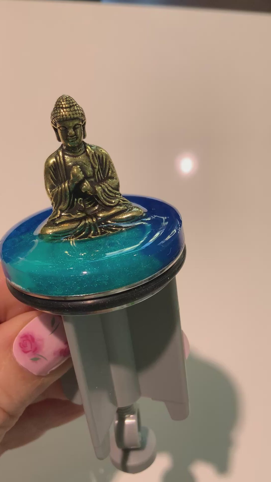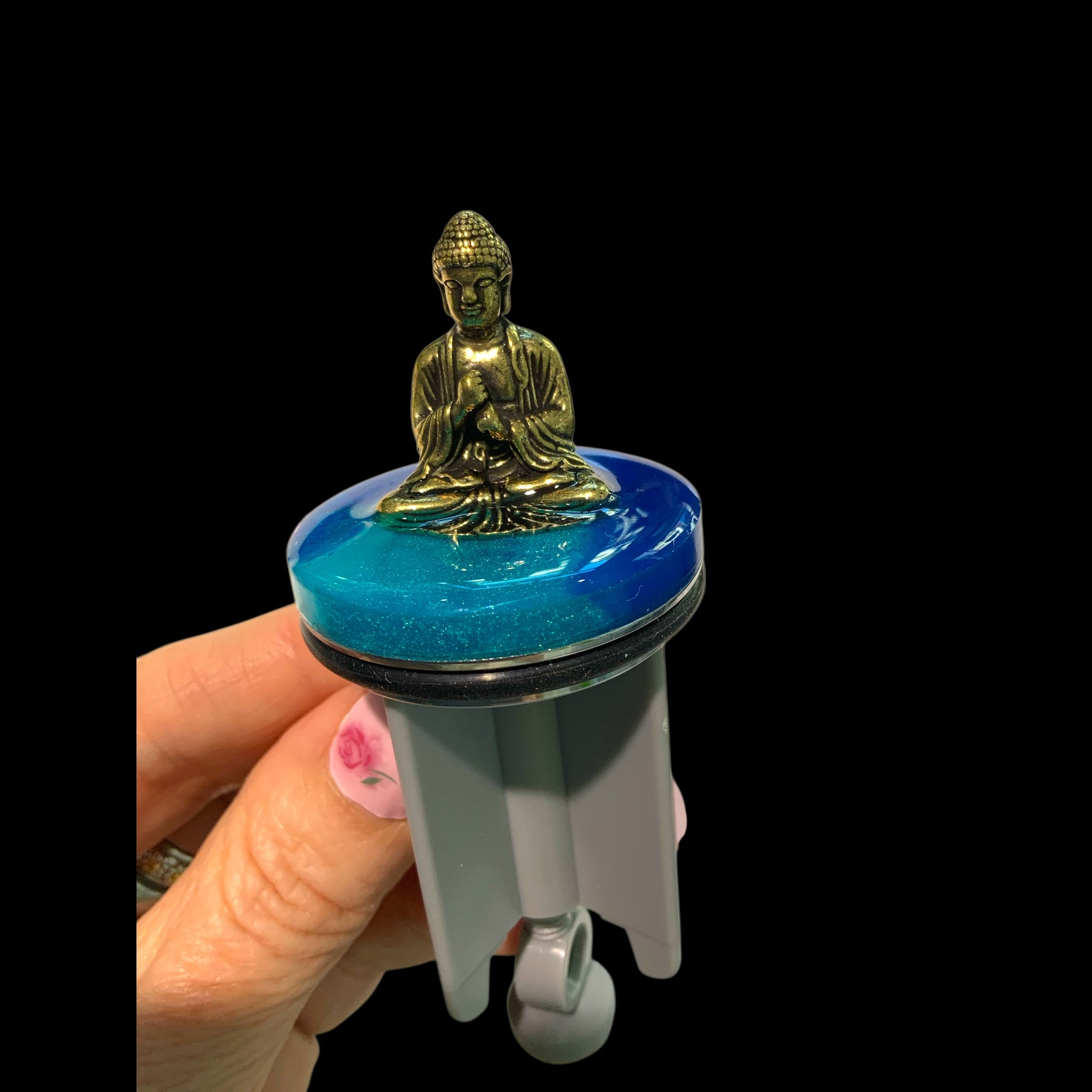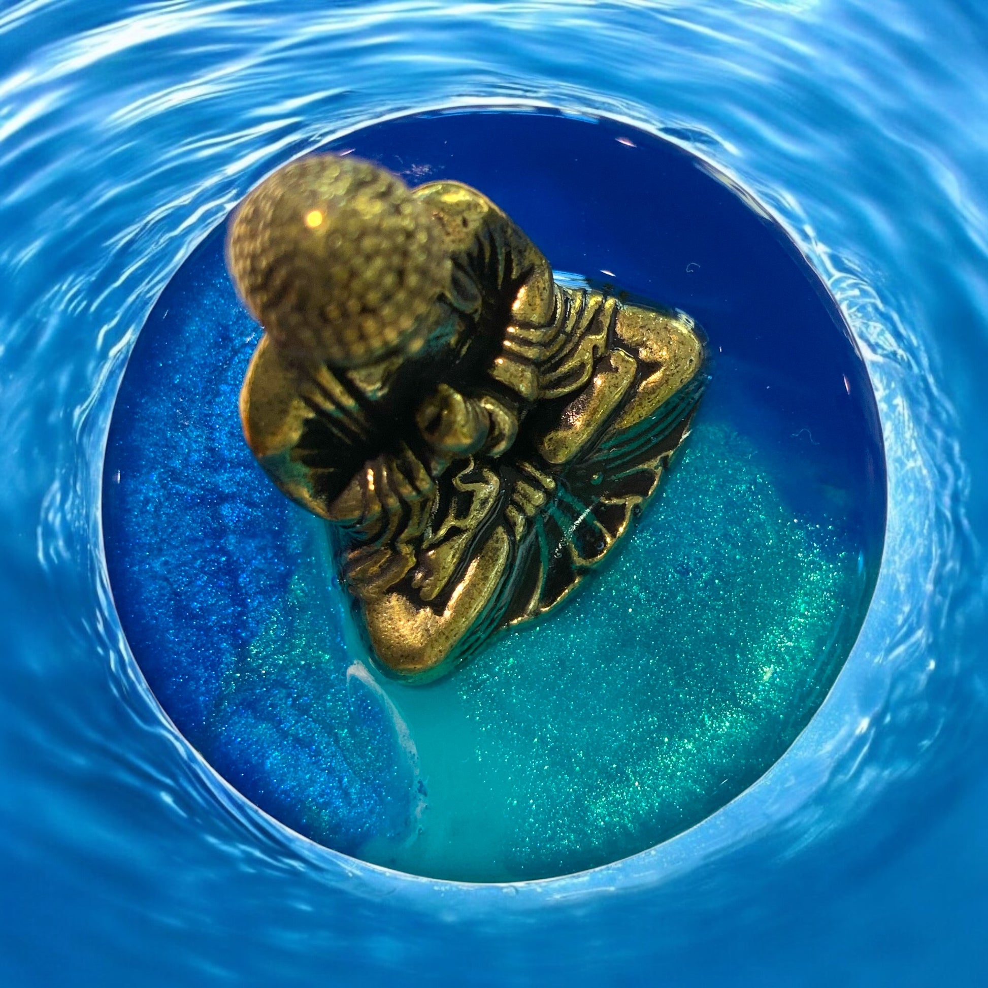 Dieser handveredelte Waschbeckenstöpsel vereint kunstvolle Gelassenheit mit stilvoller Präsenz: Ein kleiner, filigran gearbeiteter Buddha aus Messing thront auf einer schimmernden Resin-Oberfläche in beruhigenden Türkis- und Blautönen – wie auf einer sanften Wasserfläche meditierend.